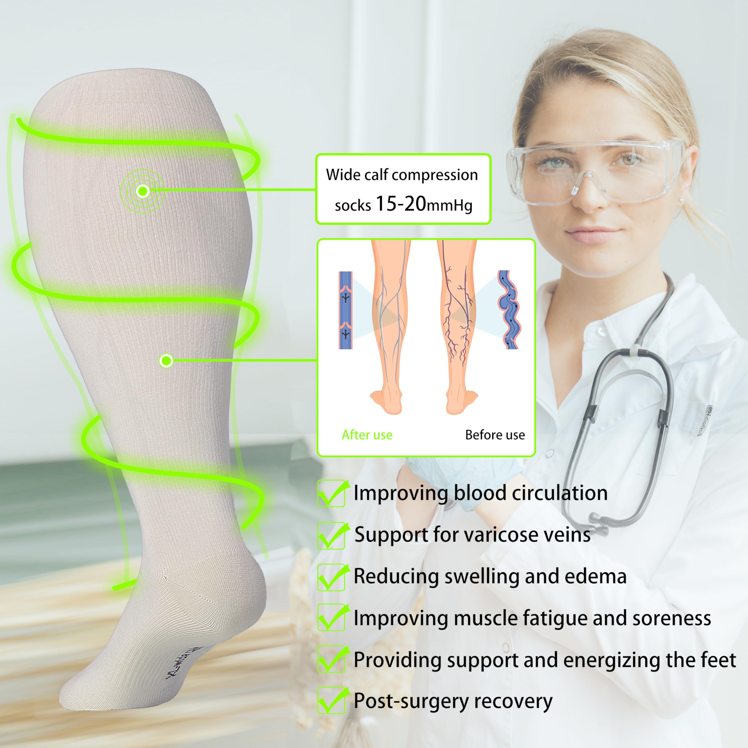 Medical Compression Socks: Extra wide calf compression socks are ideal for women prenancy and post-surgery recovery. They reduce soreness, alleviate pain from swelling during pregnancy, and provide support that eliminates fatigue and energizes the legs. Best compression Socks for nurses, physical therapist, long shift work, air plane travel, pregnant women.