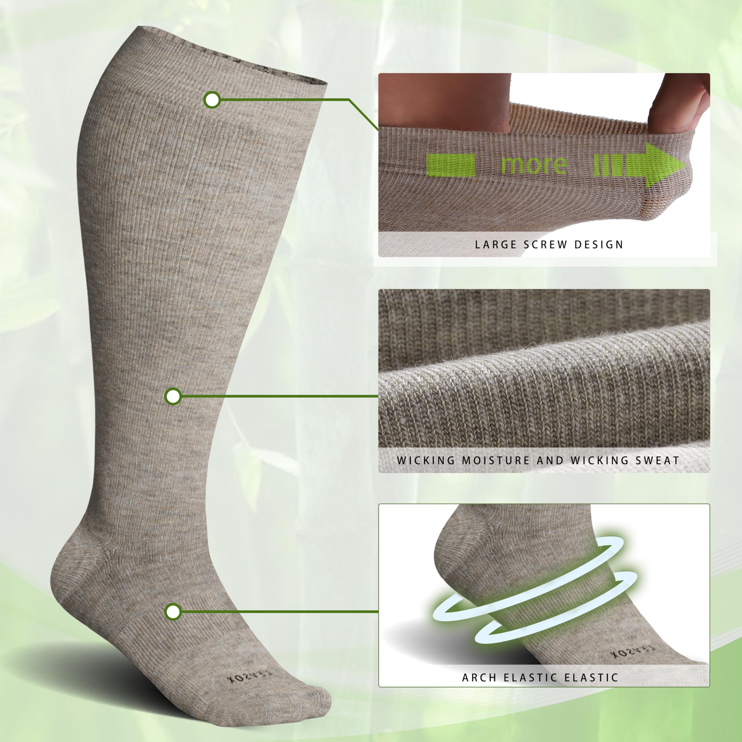 Graduated Compression Socks: Thanks to the strong elasticity and stretchability of viscose made from bamboo, plus size compression socks 15-20mmHg knee high will fit snugly to your feet, not easily slide down, and provide appropriate and comfortable pressure in different areas, effective in improving blood circulation, saying goodbye to pain.