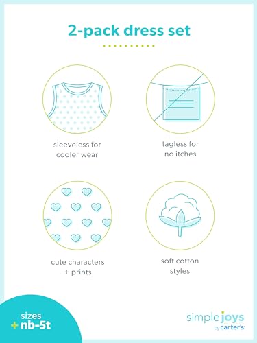 Description Add charm and versatility to your little one’s wardrobe with the Simple Joys by Carter's 2-Pack Dress Set. Each pack includes two adorable dresses designed with comfort and style in mind. Featuring a mix of short-sleeve and sleeveless options, these dresses are perfect for sunny days, playdates, or layering during cooler weather. The playful prints and patterns are sure to delight, with designs ranging from whimsical florals and cheerful polka dots to vibrant stripes and charming fruit prints. These fun styles let your child’s personality shine through while keeping them comfortable all day long. Crafted from soft, gentle fabric, these dresses ensure ease of movement for active kids. The pullover design makes dressing simple and no stress, allowing for more time spent enjoying life’s little adventures. Whether paired with sneakers for the playground or sandals for a family outing, these dresses are as versatile as they are cute. With trusted Carter’s durability and attention to detail, the Simple Joys 2-Pack Dress Set is a must-have addition to any little girl’s wardrobe