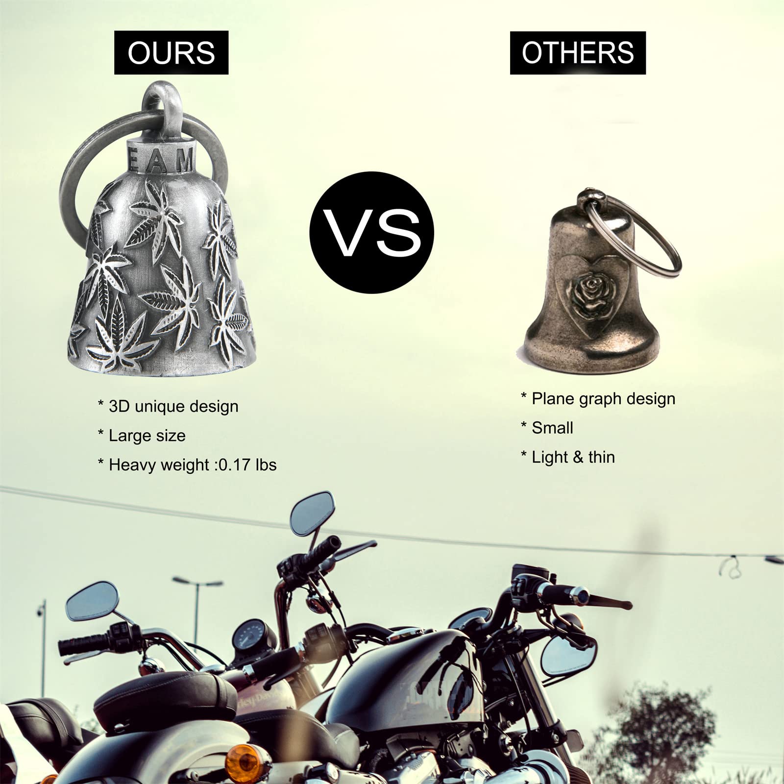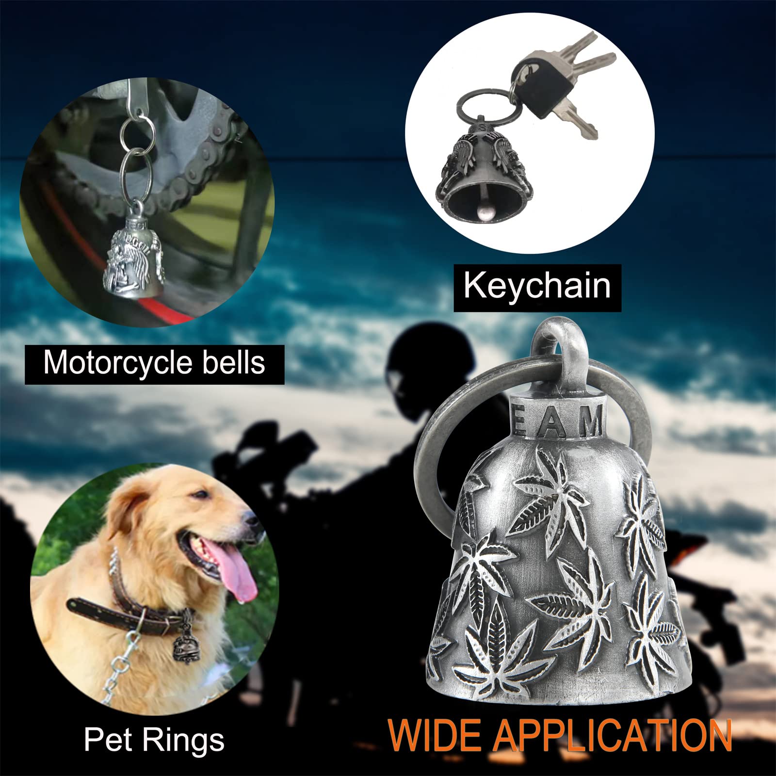Multi use:This biker bells are multi usage, it could be hang on motorcycle for safe and lucky, can hang on pet lease ,and can be a keychain for luck.