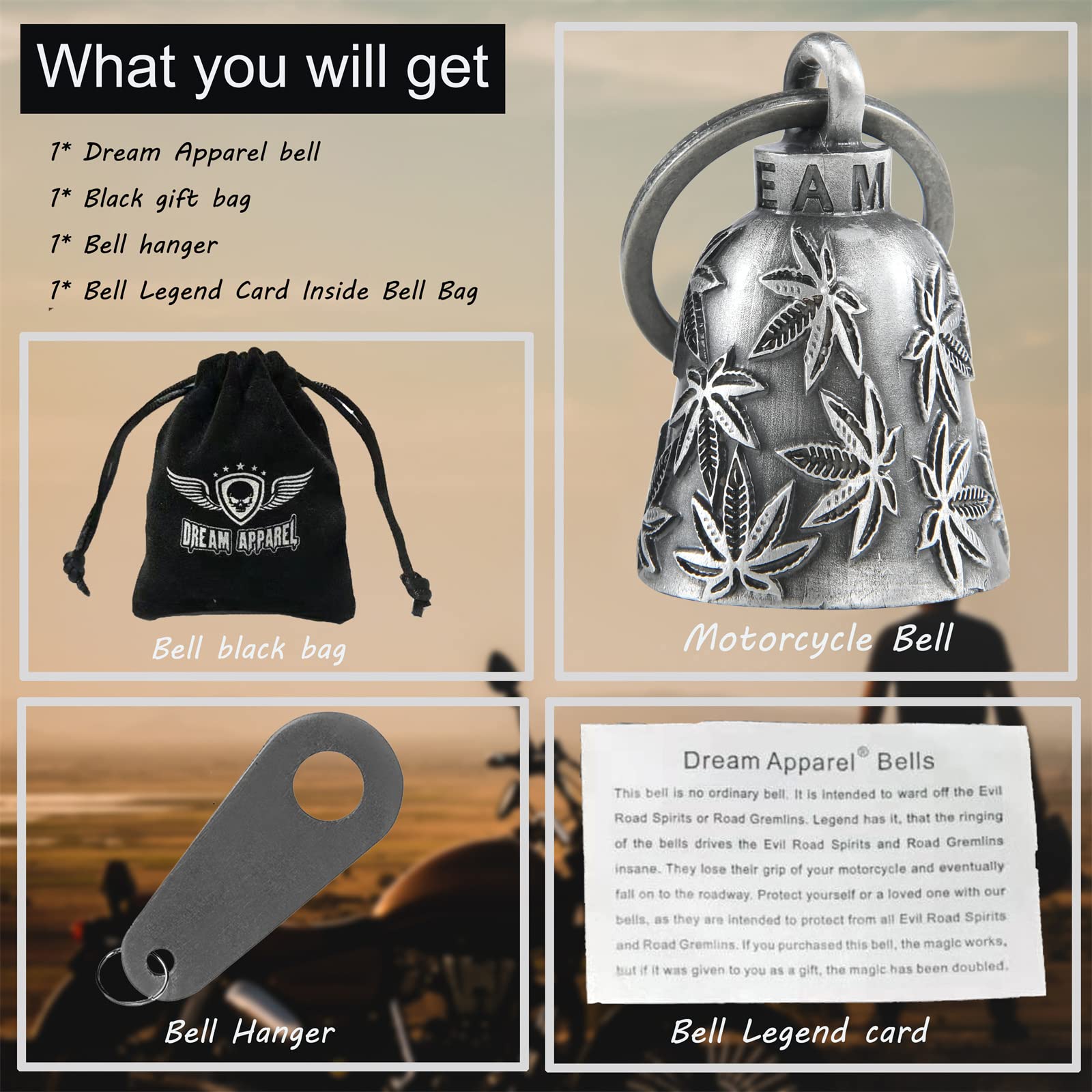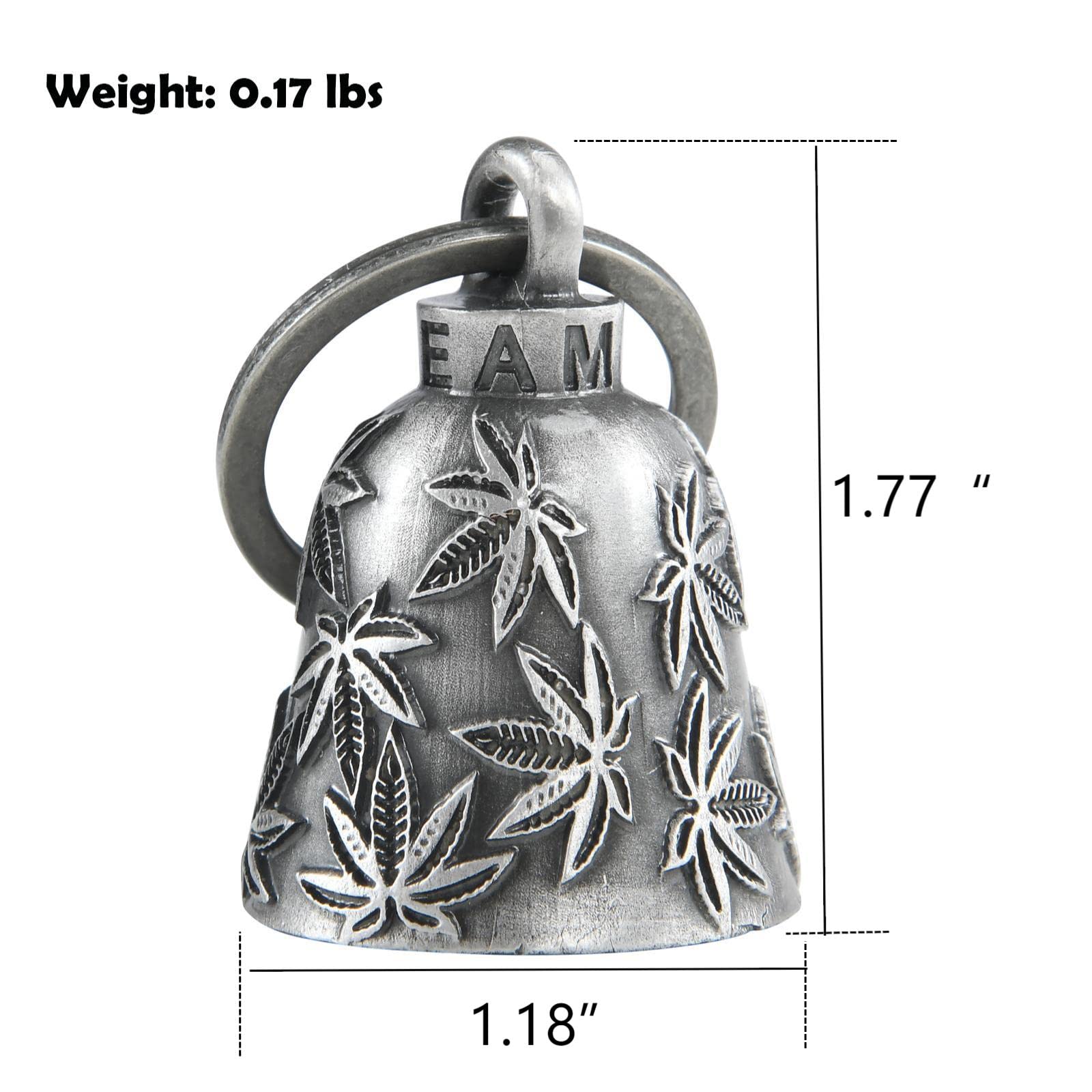 Large & Heavy:Each luck bell comes with 1 hanger+1 black gift bag+1 Legend of the Dream Apparel Bell story card,Measures: 2.75" tall ring include, 1.18"bottom wide. and weight 0.17lbs,heavy motorcycle bell keeps more sturdy while riding.