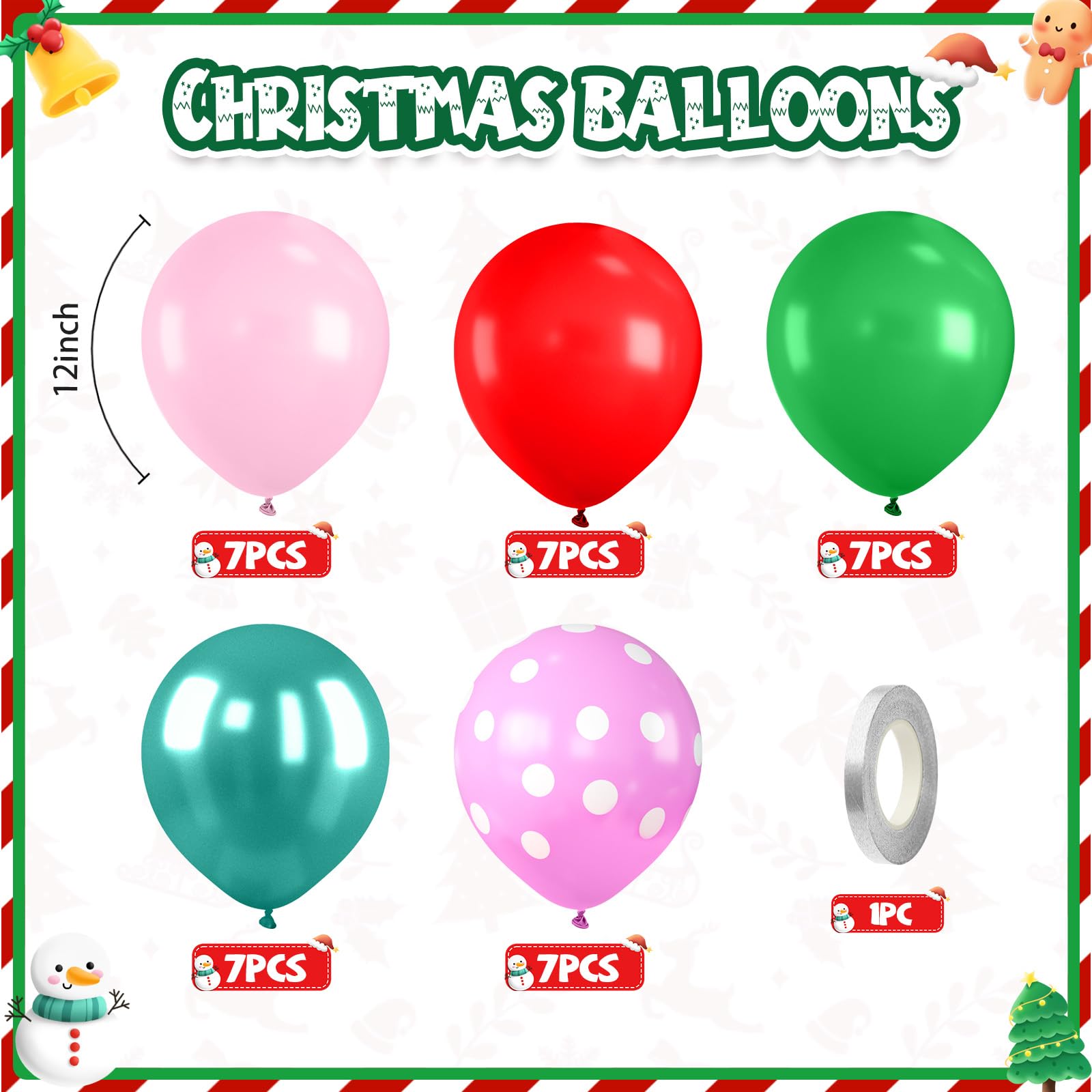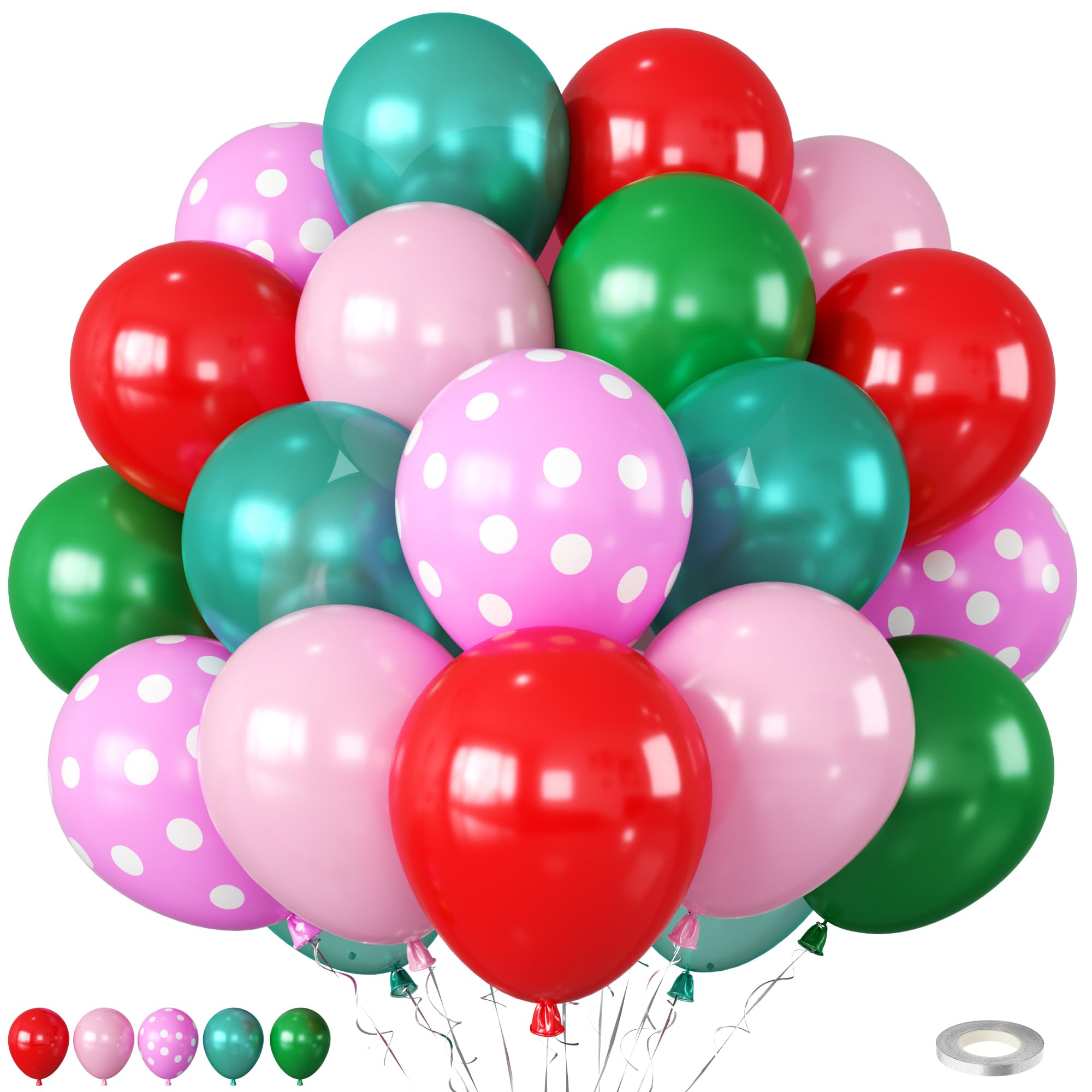 Package Contents: This red pink green Christmas balloons include 35pcs 12 inch balloons ( retro pink*7, matte red*7, dark green*7, pearl teal blue*7), 7pcs 12inch pink and white polka dot balloons, 1pc silver ribbon. Designed to create a lively centerpiece, the assortment gives you everything needed to build a charming balloon garland arch.