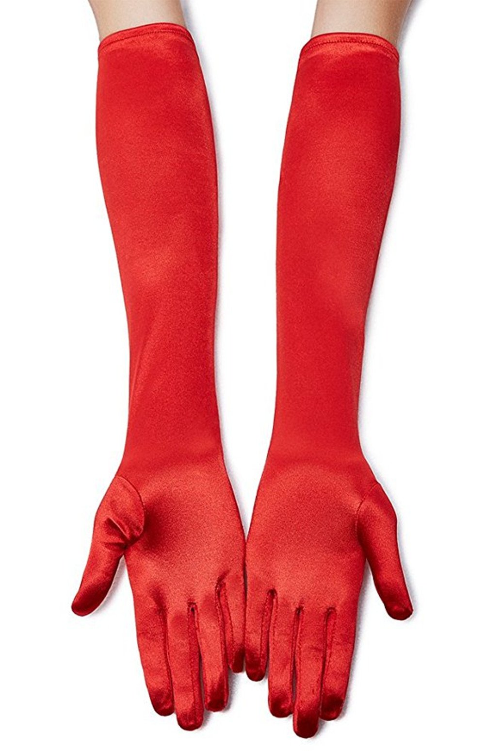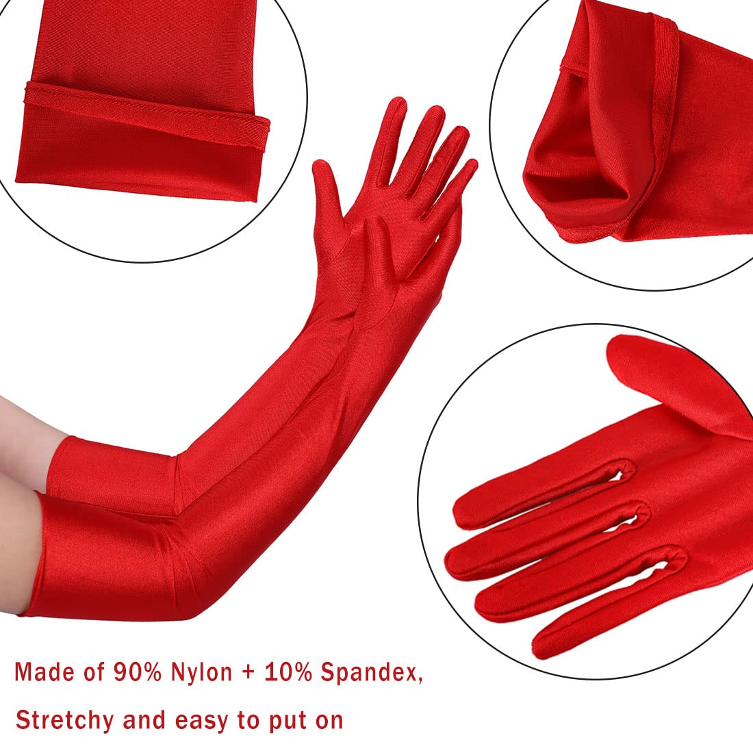 Description Women's White Long Satin Gloves Bridal Dance Gloves For Special Occasion Evening Party, Black, White, Pink, Red Material: Made of 90% Nylon + 10% Spandex, stretchy and easy to put on. Stretch ,soft, smooth, sleek, comfortable to wear The best to hand wash and air dry. Package include: 1 Pair Gloves.