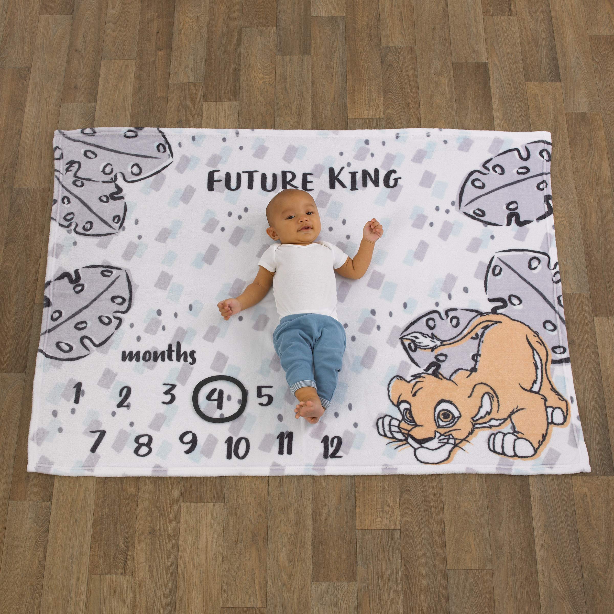 This blanket is designed to create the perfect photo opportunity and capture milestones for each month. Document baby's progress as they grow. Includes a circle shaped felt cutout to place on each month. Made of soft plush fabrics and measures 40" X 50". Featured in shades of grey, white, Charcoal and light tan. Simba is playing among the palm leaves. With saying, "future King". Makes a wonderful keepsake gift.