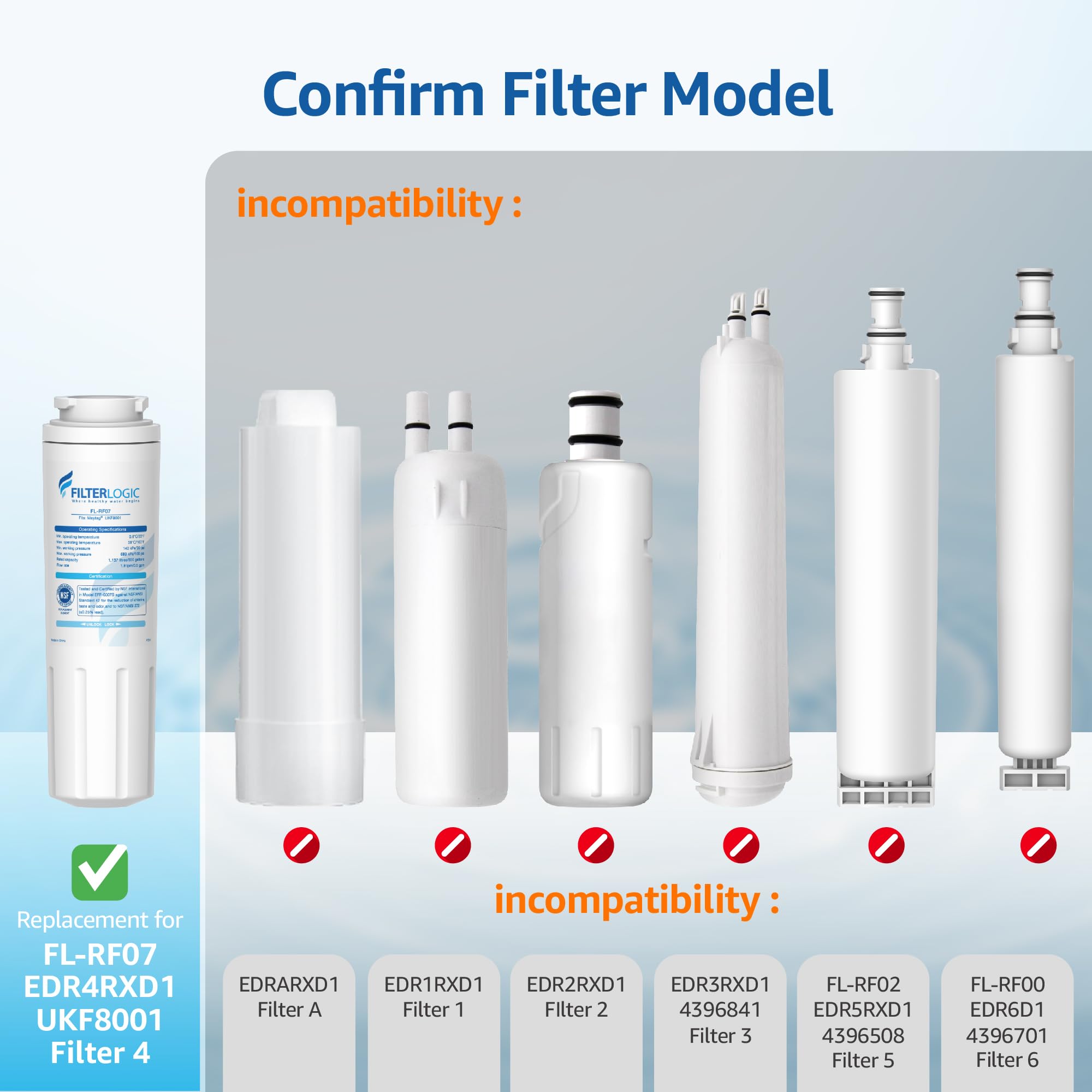 Replacement models: Maytag UKF8001, EveryDrop Filter 4, EDR4RXD1, EDR4RXD2, Whirlpool 4396395, UKF8001AXX-750, UKF8001AXX-200, Amana UKF8001P, UKF8001AXX, UKF9001, Sears or Kenmore 9006, 46-9006, 9992, 9005, 9084, 469084, Bosch BORPLFTR20, Viking RWFFR, 67003523-750, 67006475, WF295, Puriclean II.