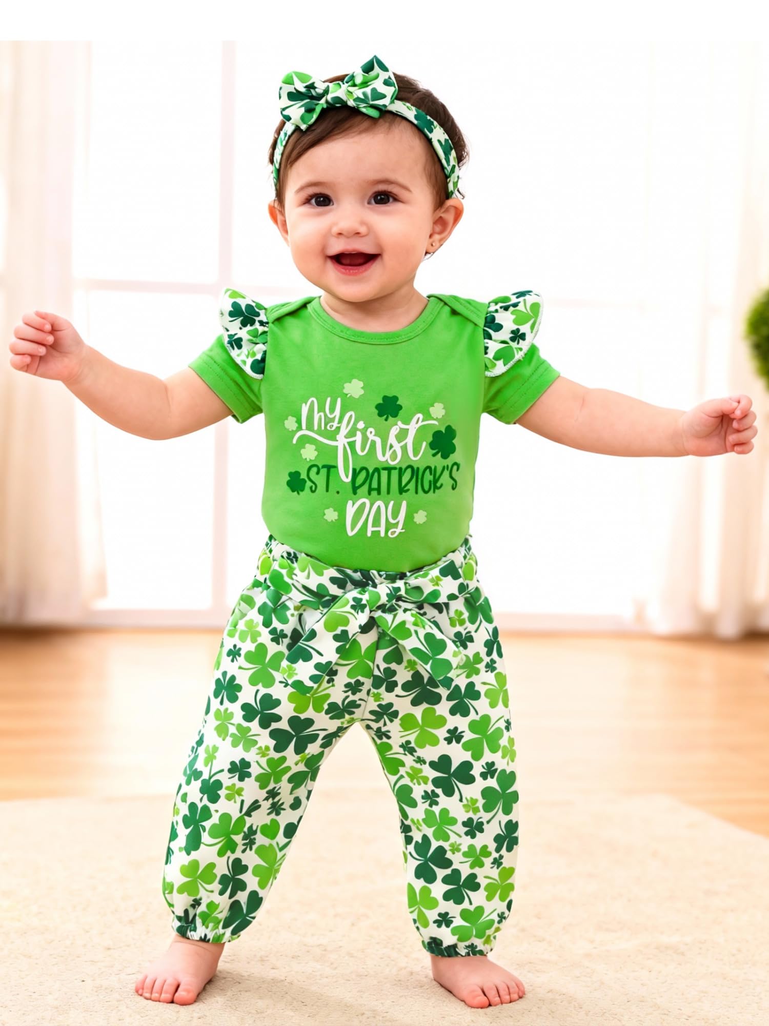 🎁Cute Baby Girl Clothes: "My First St Patricks Day" letters print, ruffled layered shoulder design, camo pants with elastic waist, matching baby girl headband, super adorable 3pcs baby girls' clothing, your girl will get lots of compliments wearing them!