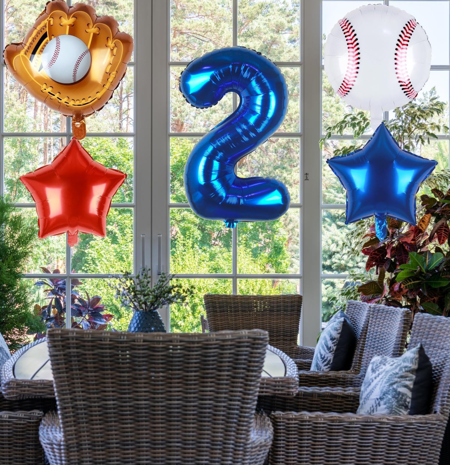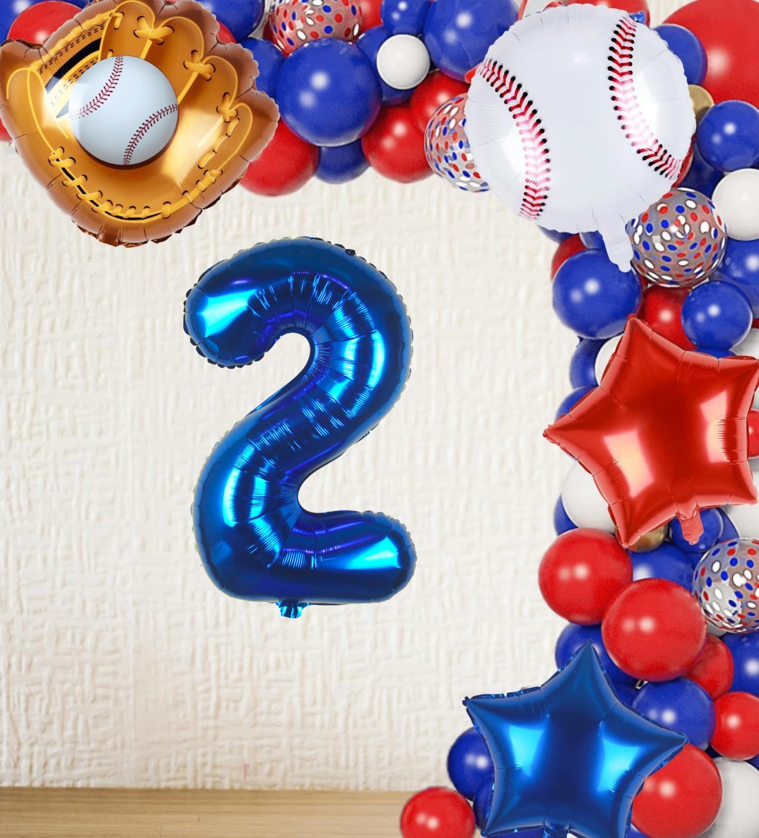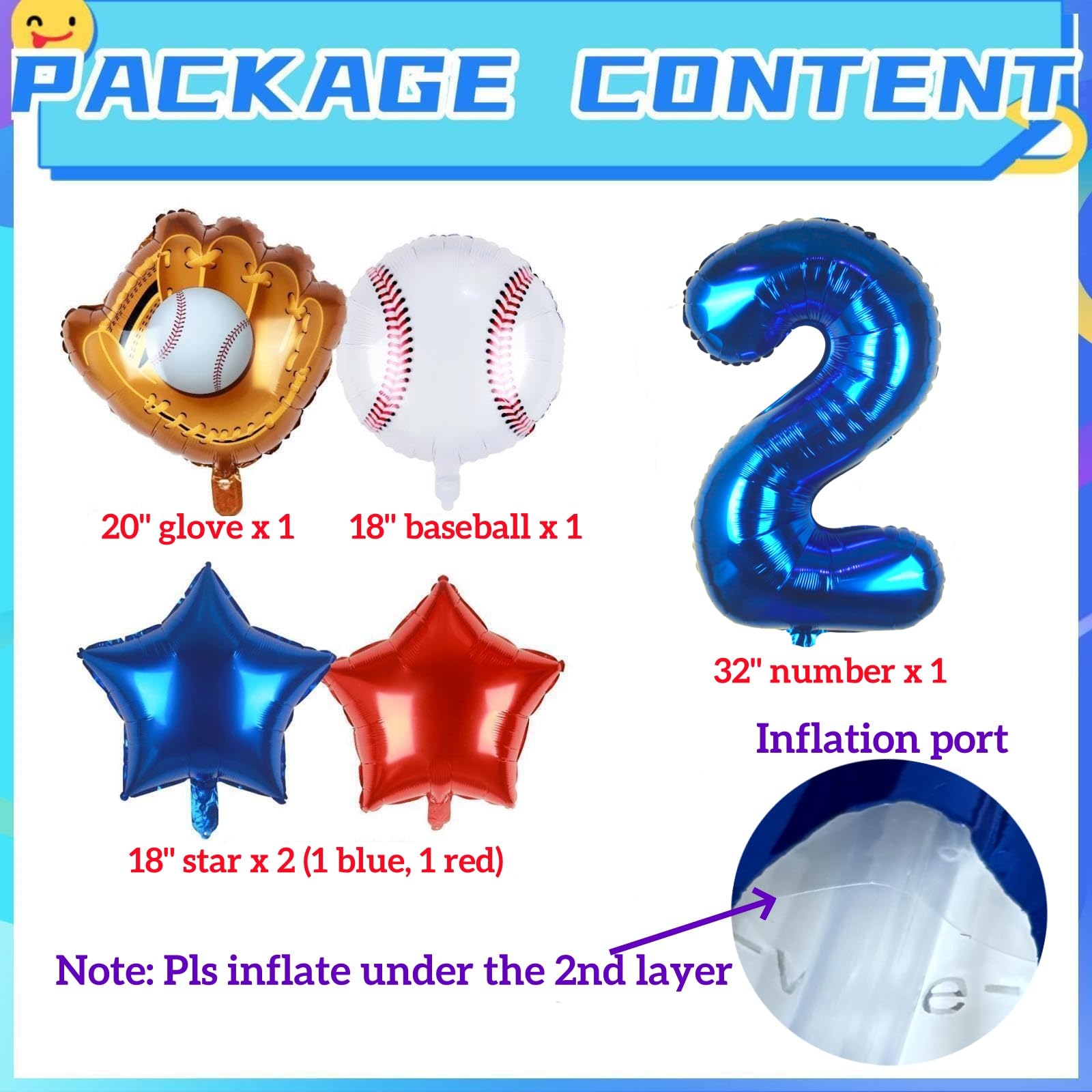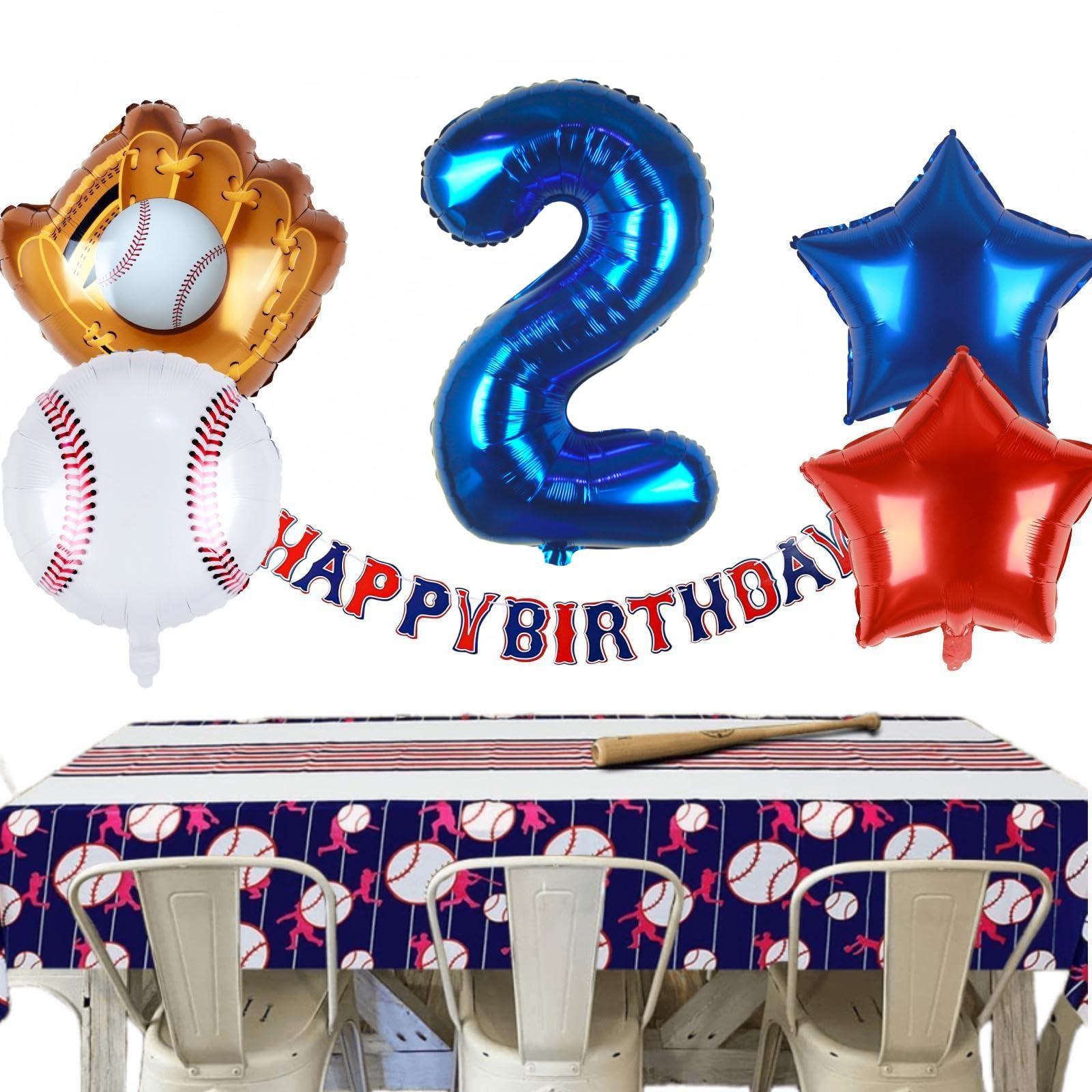 5PCS PACK | BASEBALL PARTY DECORATIONS: 32inch navy blue number 2 balloon x 1, 18inch foil baseball balloons x 1, 20inch baseball glove balloons x 1, 18inch star balloons (1 dark blue, 1 red), straw x 1, 32ft ribbon.