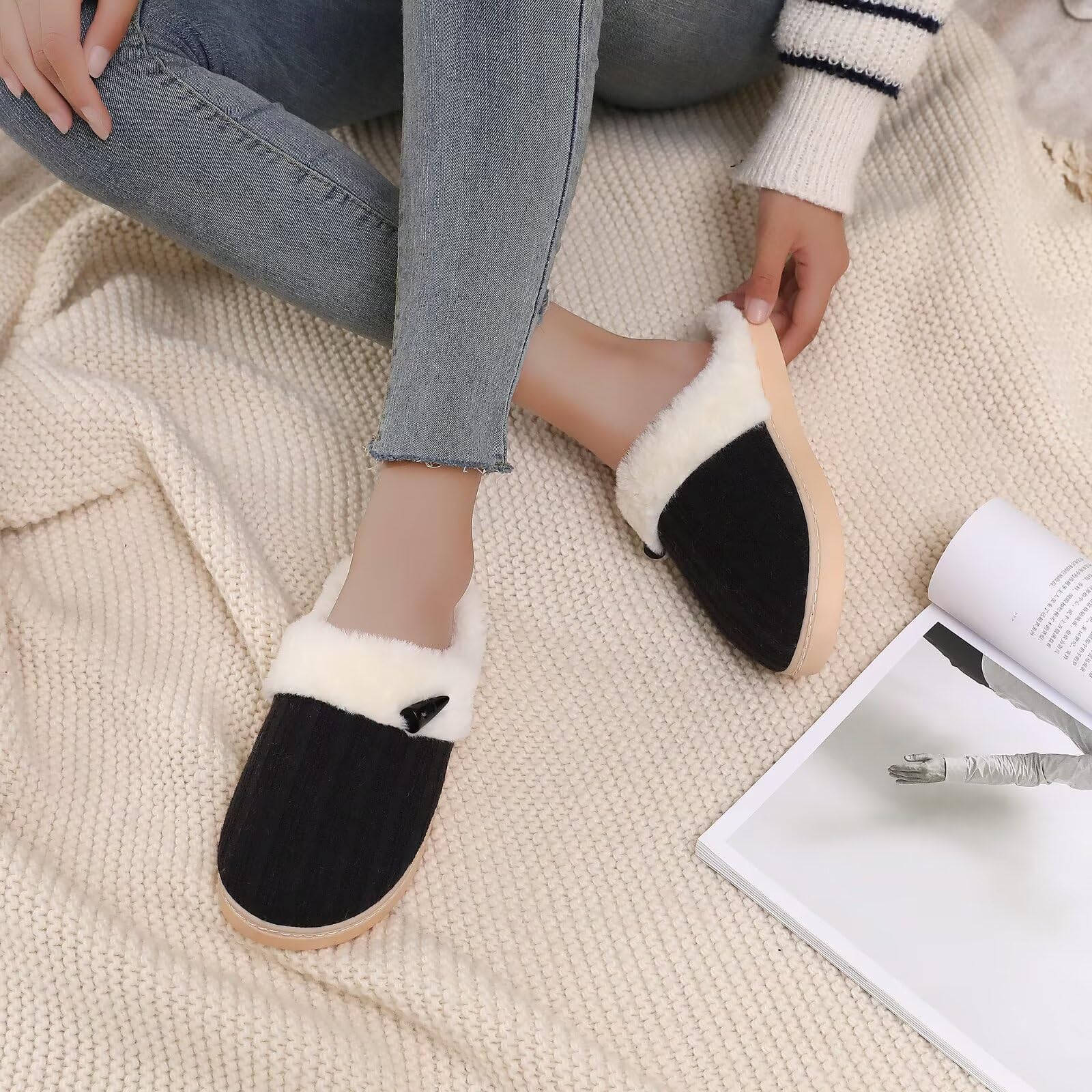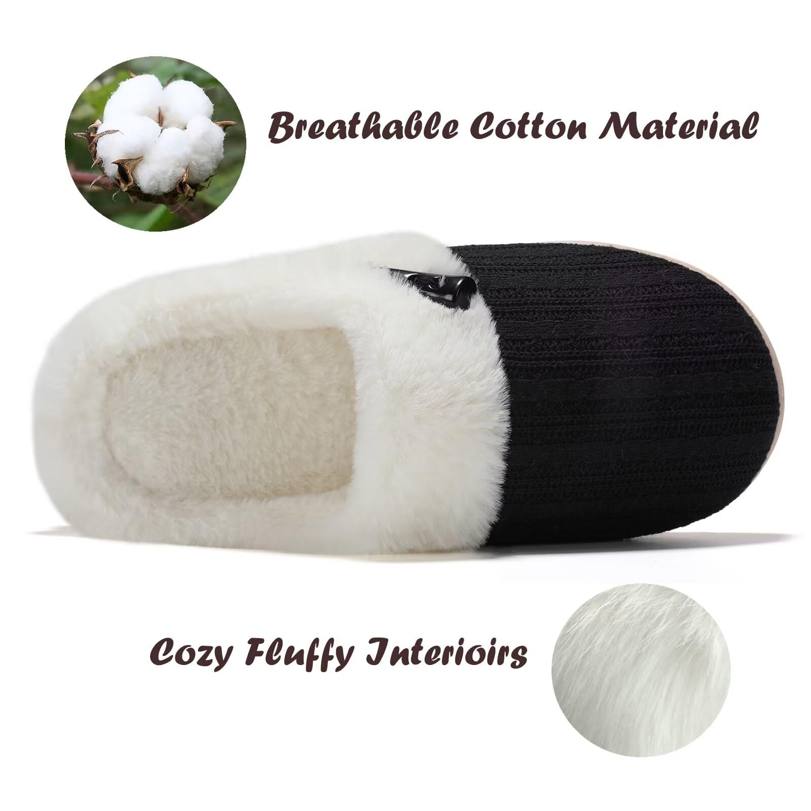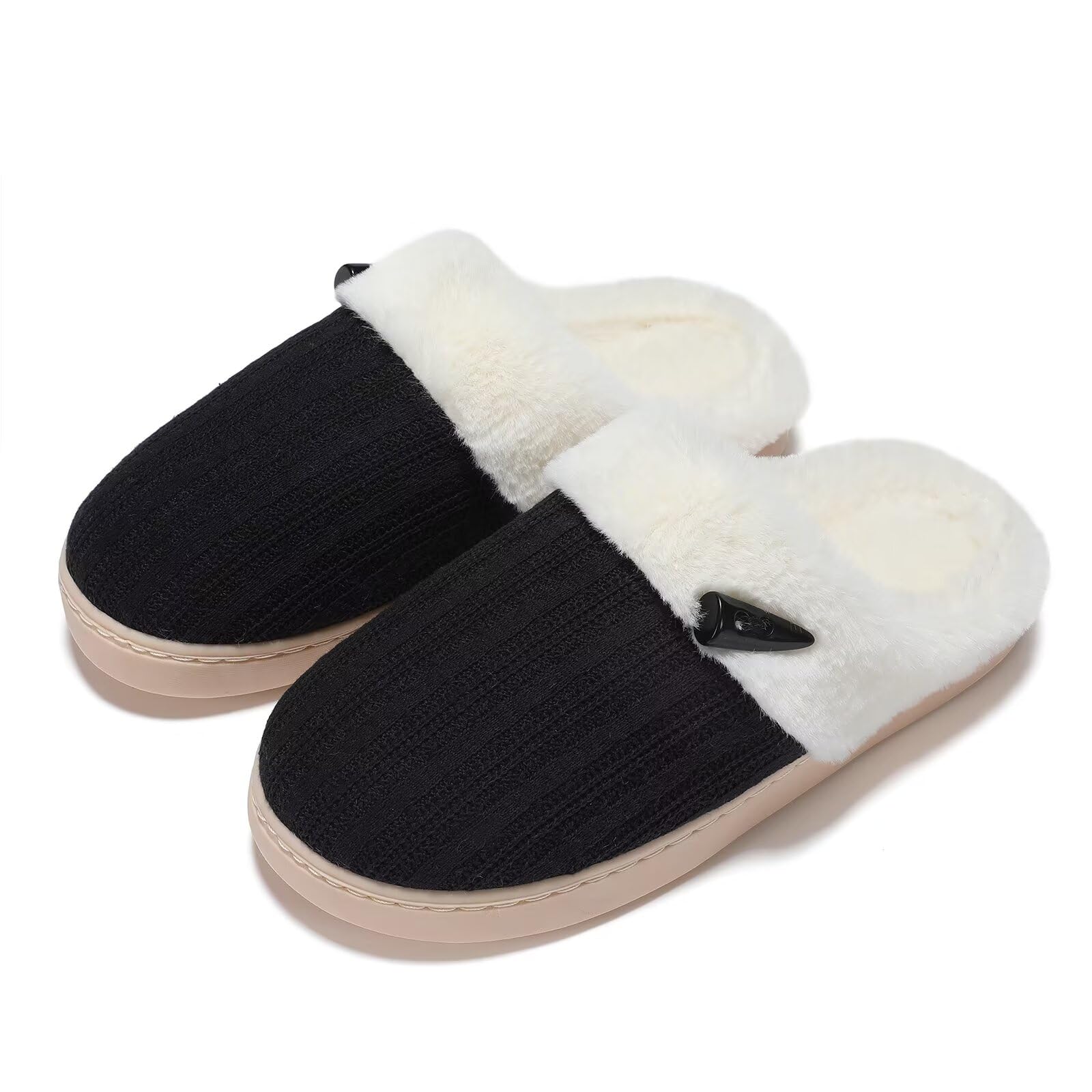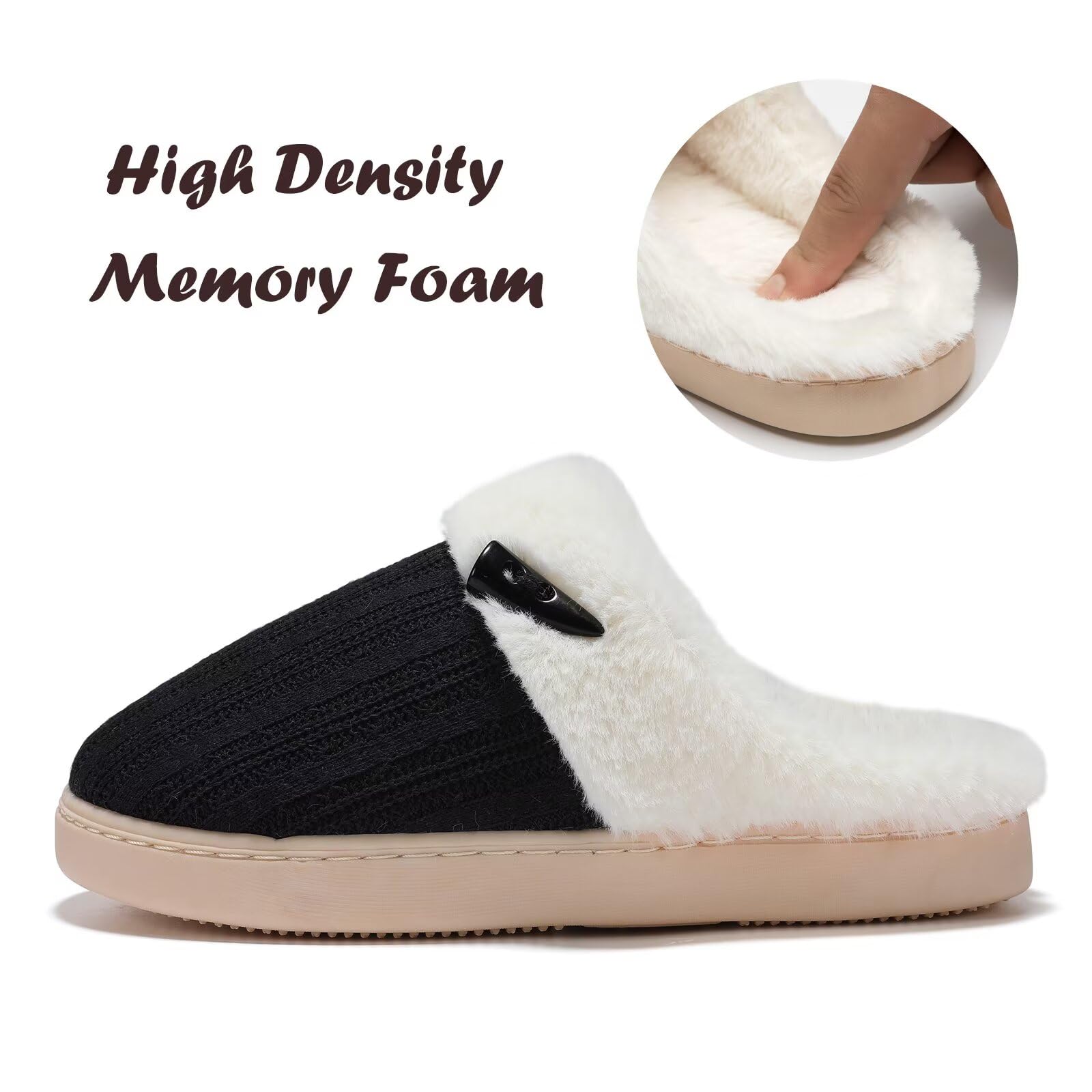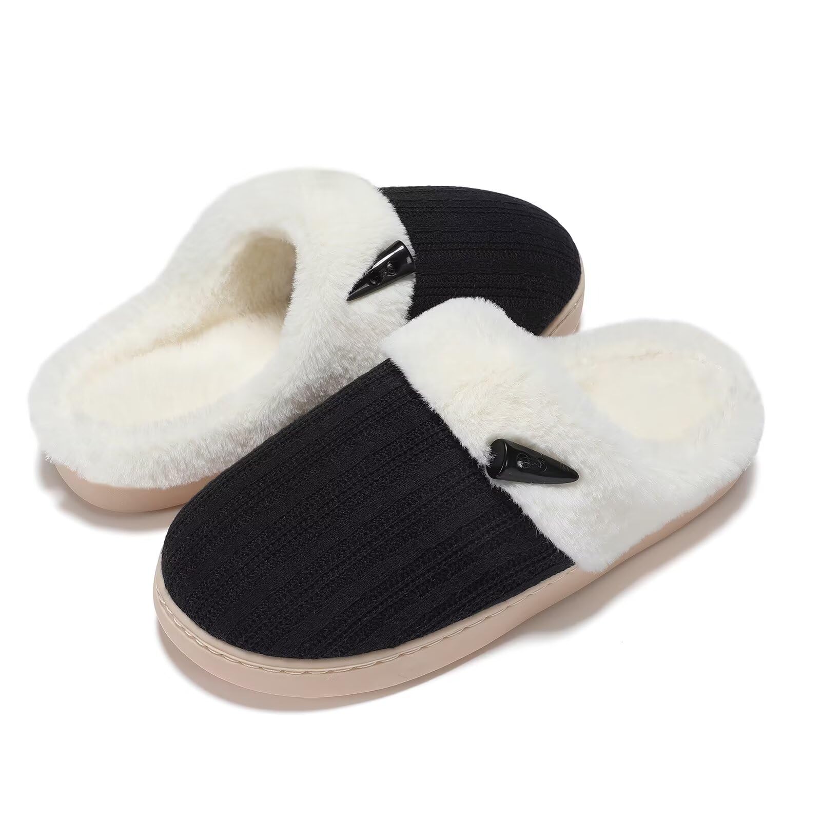 EASY SLIP ON STYLE:Step into comfort easily with these open back fuzzy bedroom slippers that are made with fluffy plush.Soft plush faux fur lining offers superior comfortability from the clouds.Also these comfy house shoes are so chic with knitting upper and horn button design