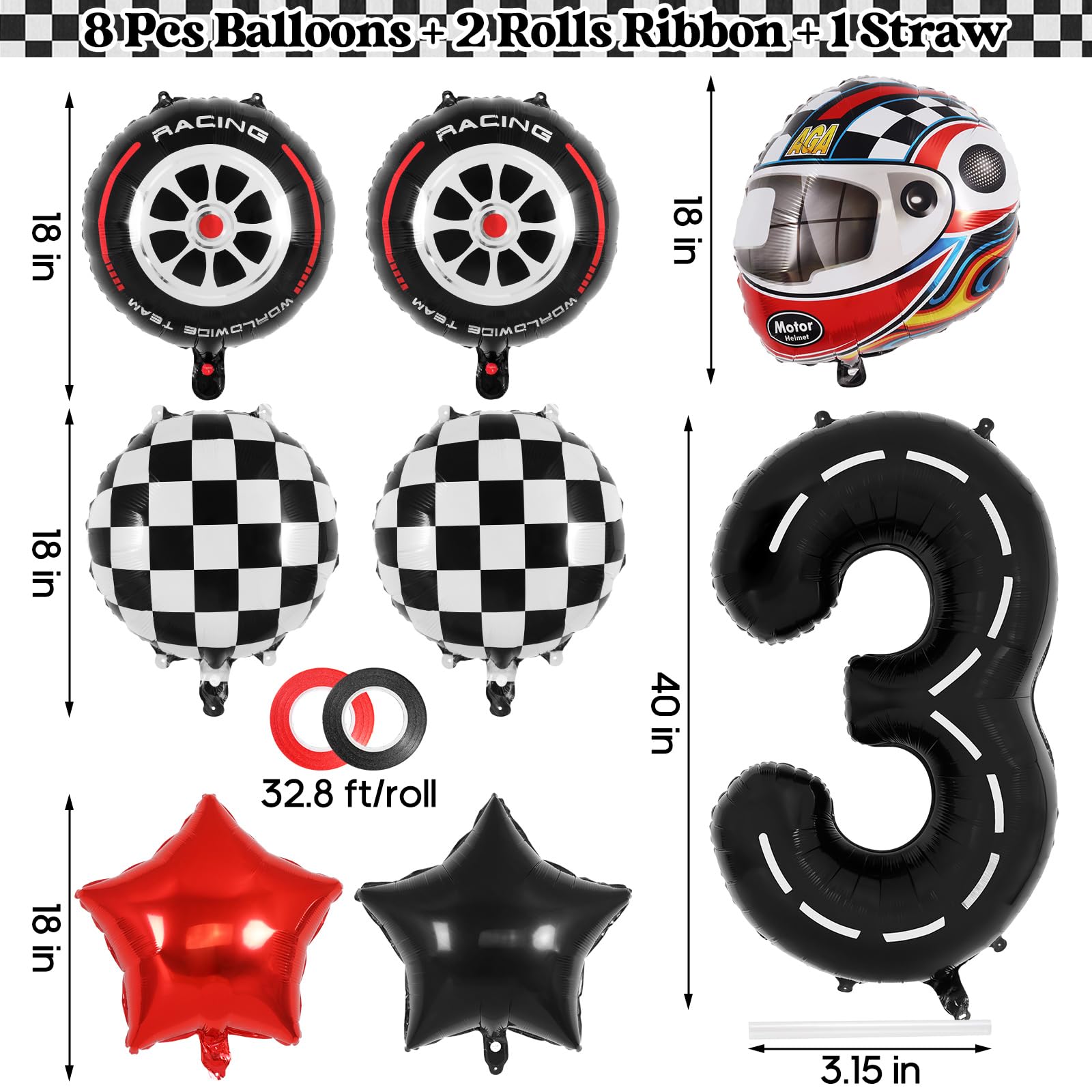 PACKAGE CONTAINS: You will get 1 number balloon, 1 helmet balloon, 2 checkered balloon, 2 tire balloon, 2 star balloon, 2 rolls ribbon and 1 straw. What an abundance of balloons for your race car themed birthday party.