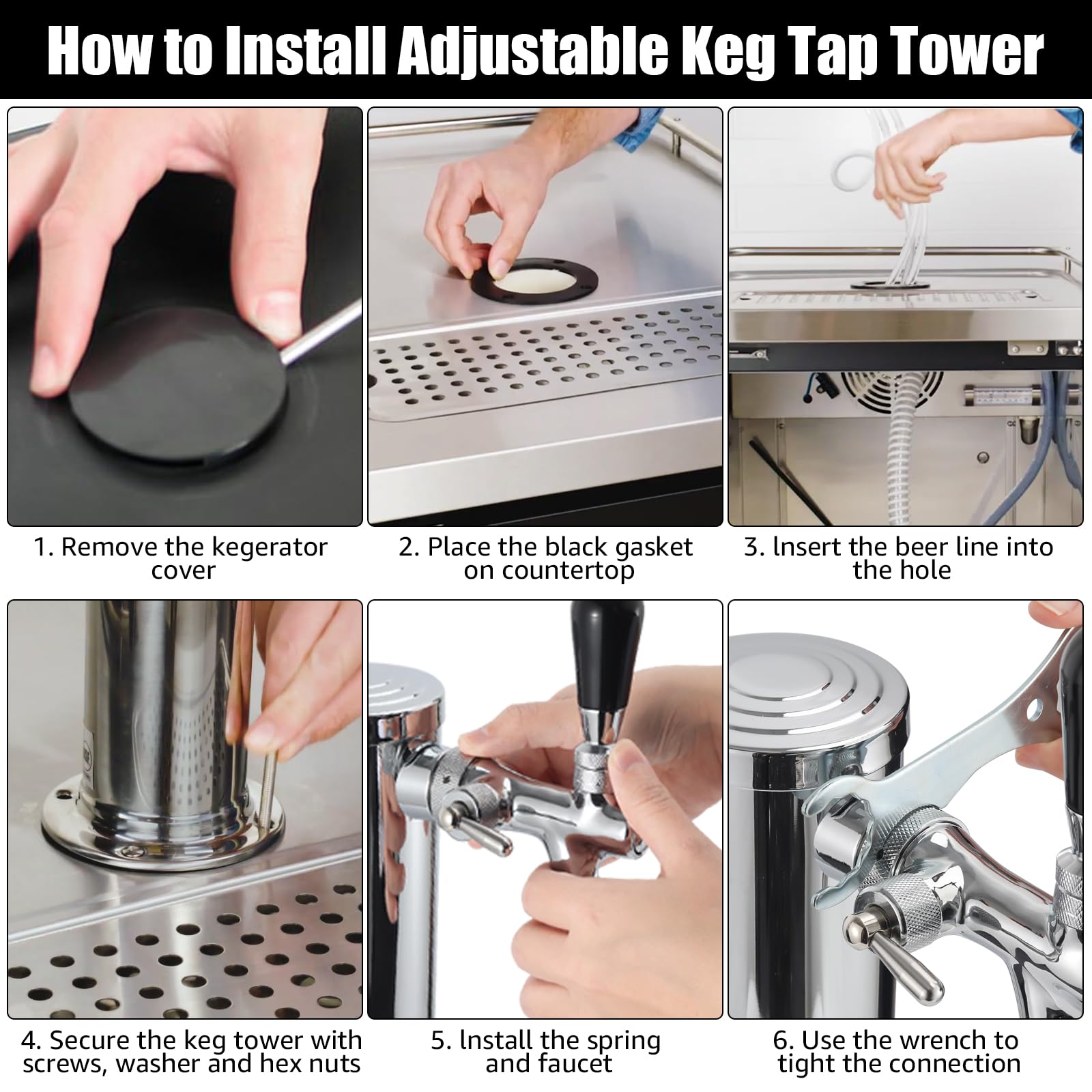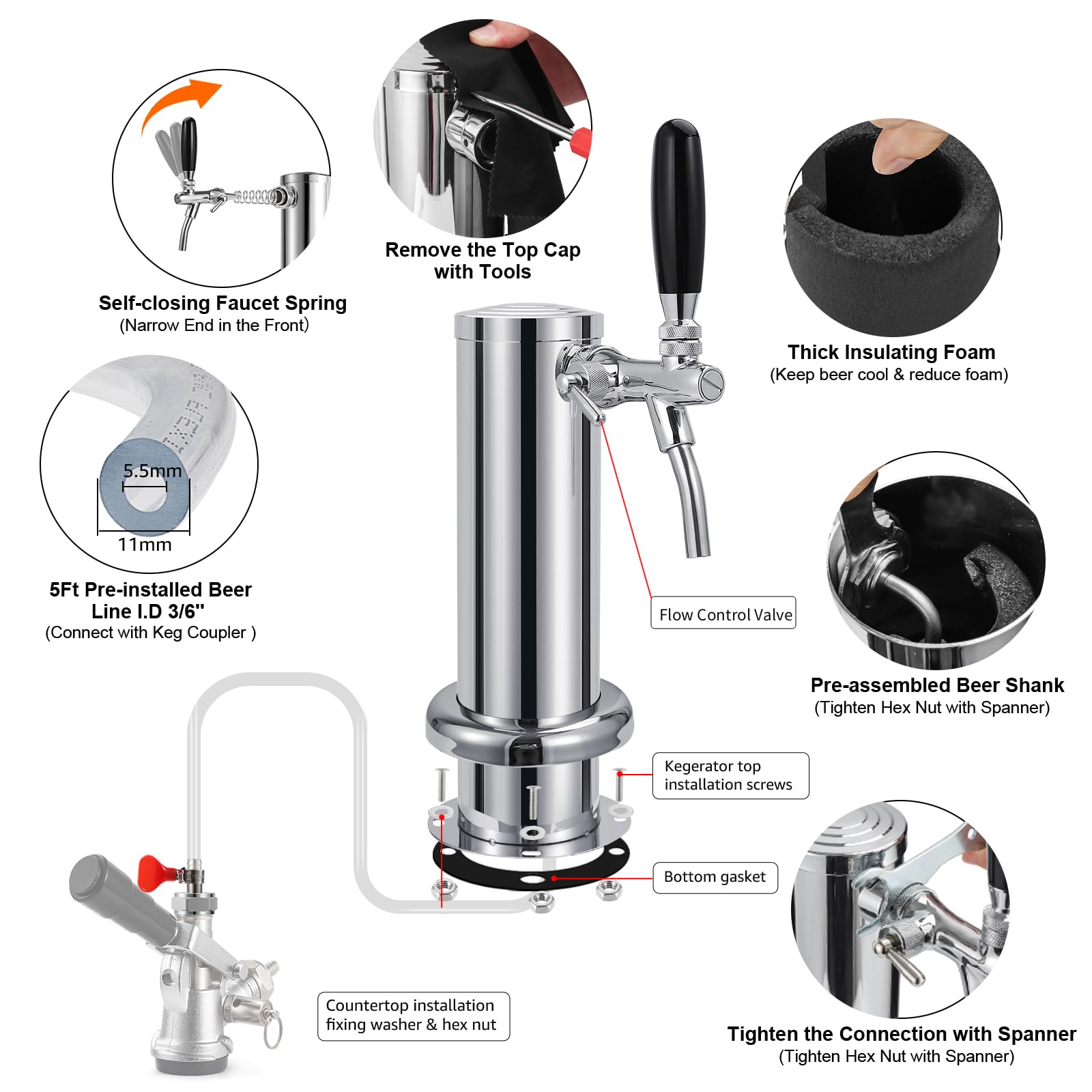 Single Tap Kegerator Tower Kit: this beer tap tower comes with a full set kegerator parts: 3β stainless tower, 5ft ID 3/16'' pre-assembled beer line,flow Control beer faucet, faucet cover, faucet brush, tap handle, screws, washer and nuts, hose clamp, faucet wrench, and gasket. following the step-by-step guide such as remove the top cover and fix the base gasket, just minutes to install on the kegerator or countertop. Each of components is solidly constructed and won't leak or come loose.