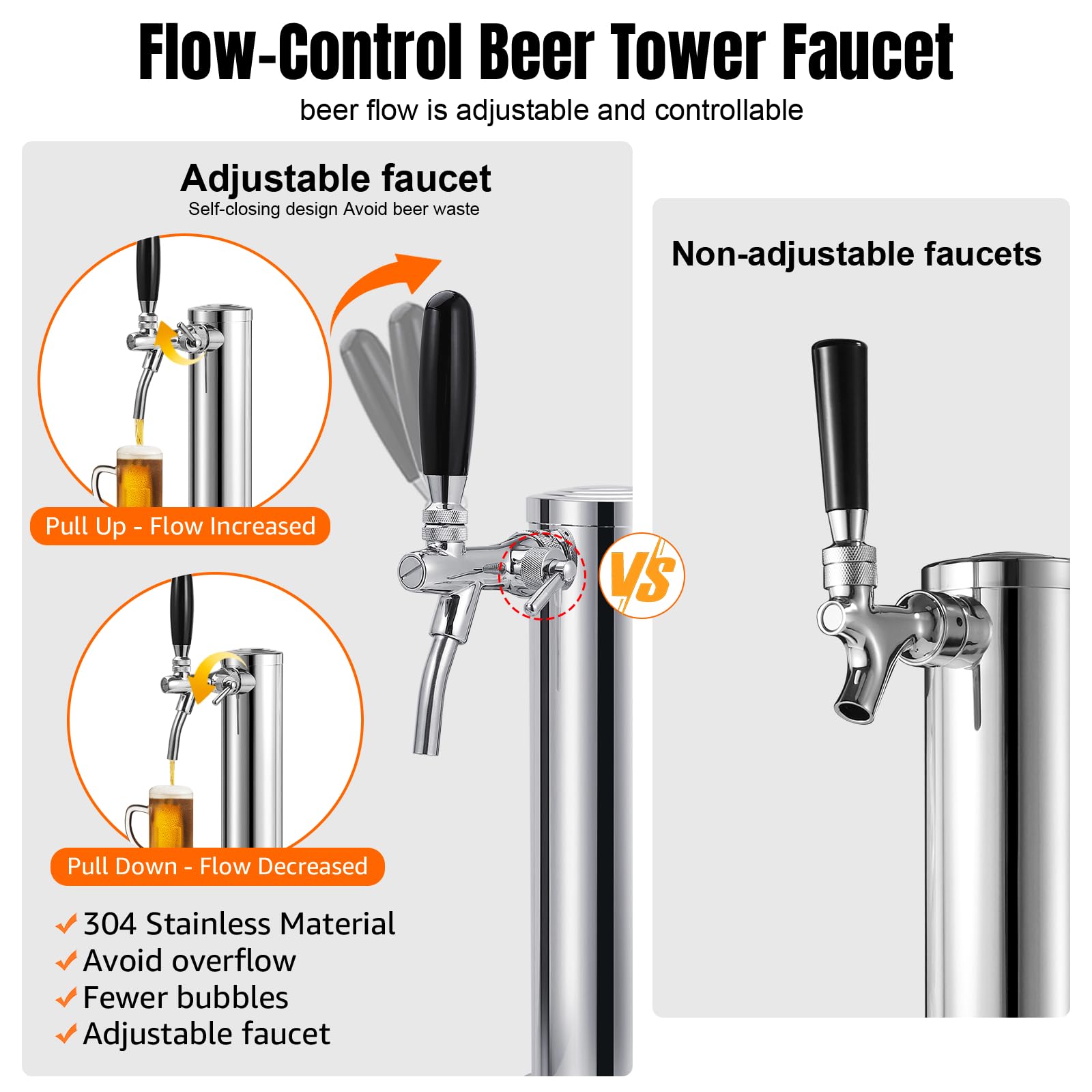 Adjustable Flow & Self-closing Beer Tap Faucet: featuring a self-closing adjustable tap design, beer flow can be accurately increased or decreased by moving the control lever of keg tower tap up or down, preventing over-pouring and waste. Compared with traditional non-adjustable beer faucets, this design is more suitable for situations where precise control of the beer volume is needed, such as for craft beer or high-foam wine.
