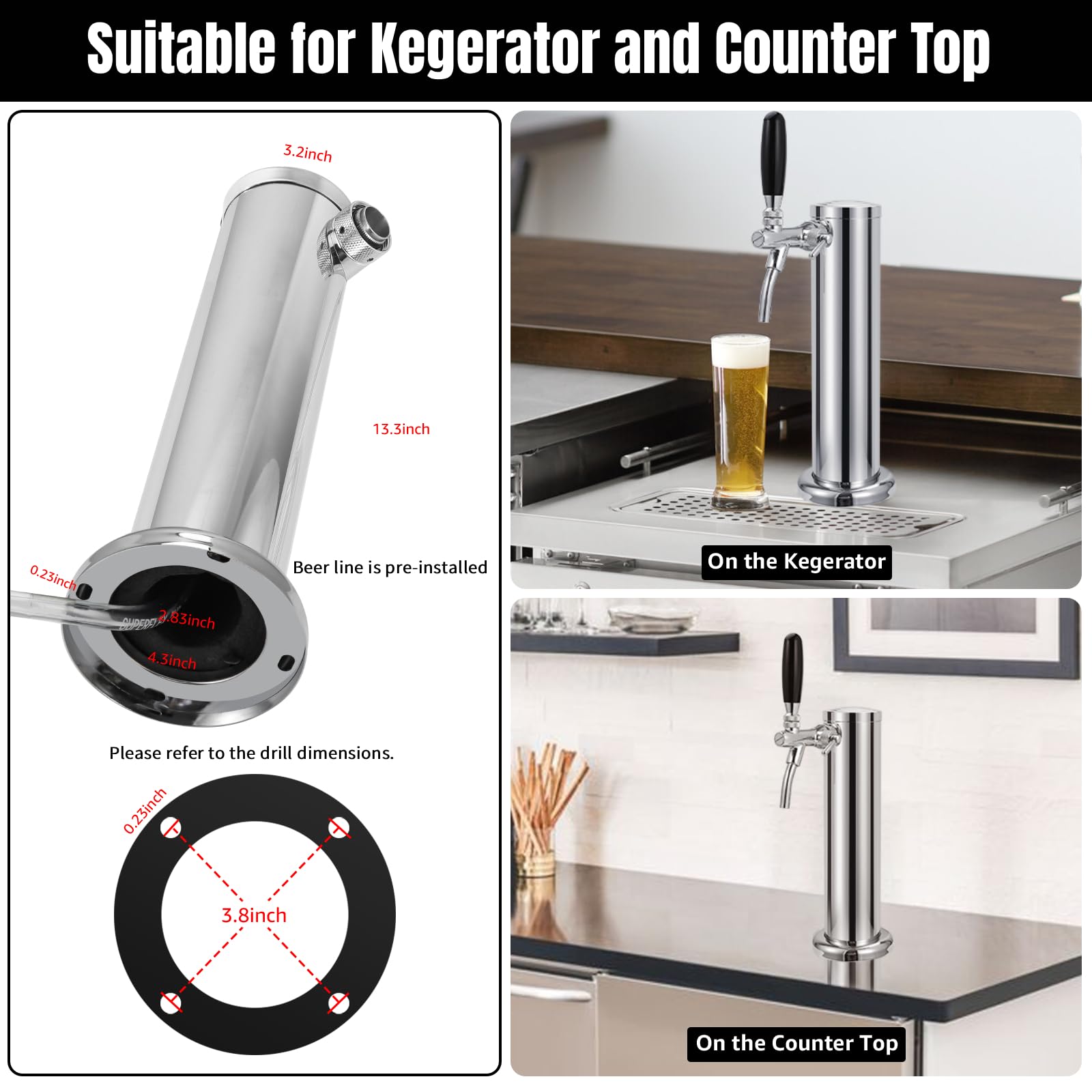 Efficient Cooling & Long-lasting Freshness: the beer faucet tower for kegerator has a thick insulation foam layer inside, which certainly insulates external heat, maintaining the low-temperature state of the beer and reducing foam problems caused by temperature differences. The bottom sealing gasket and dust-proof faucet cover further block dust and air oxidation, extending the freshness of the beer. Beer tower can be installed on a kegerator or a countertop (fixed to the counter with screws).