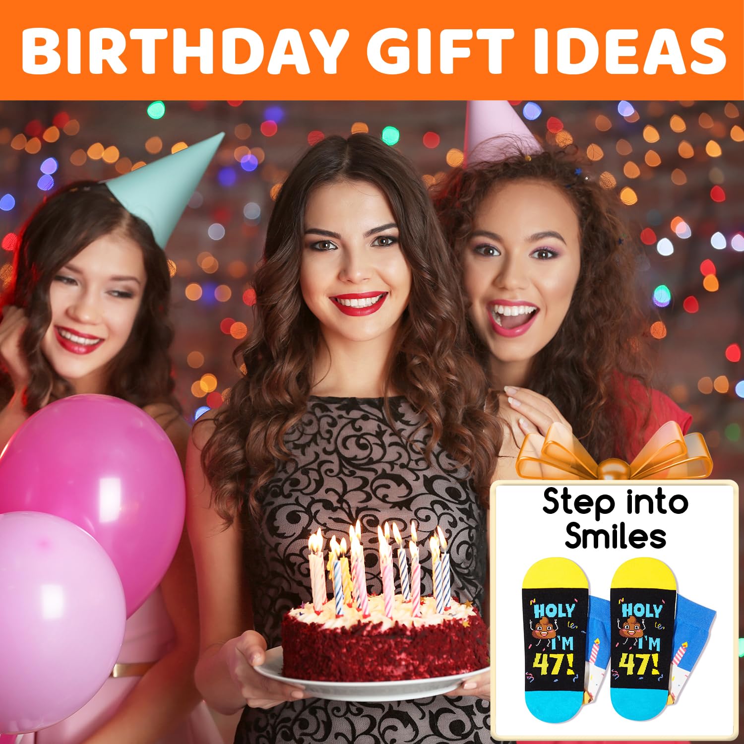 47TH BIRTHDAY GIFT IDEAS: These socks feature a cake and candle design on top, while the bottom is sewn with a hilarious hidden message: "HOLY, I'M 47!". They are suitable for any holiday gifts, such as Birthday gifts, Christmas gifts, or White Elephant gifts.
