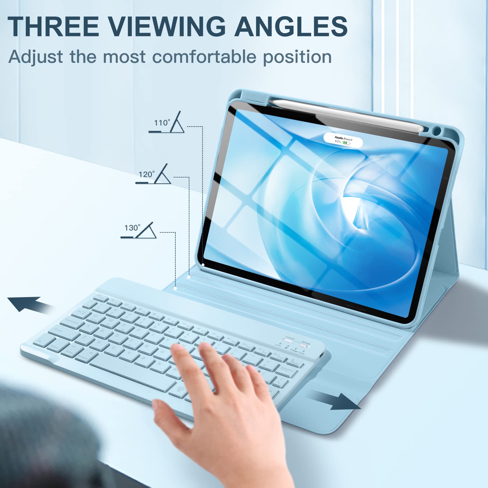 ❤【Adjustable Viewing Angle】There are 3 anti-slip grooves design inisde of the case for iPad air keyboard case provides the perfect stand angle. which you can change where the tablet is on the case and adjust the screen angle this way for drawing or writing on, browse the web or do more
