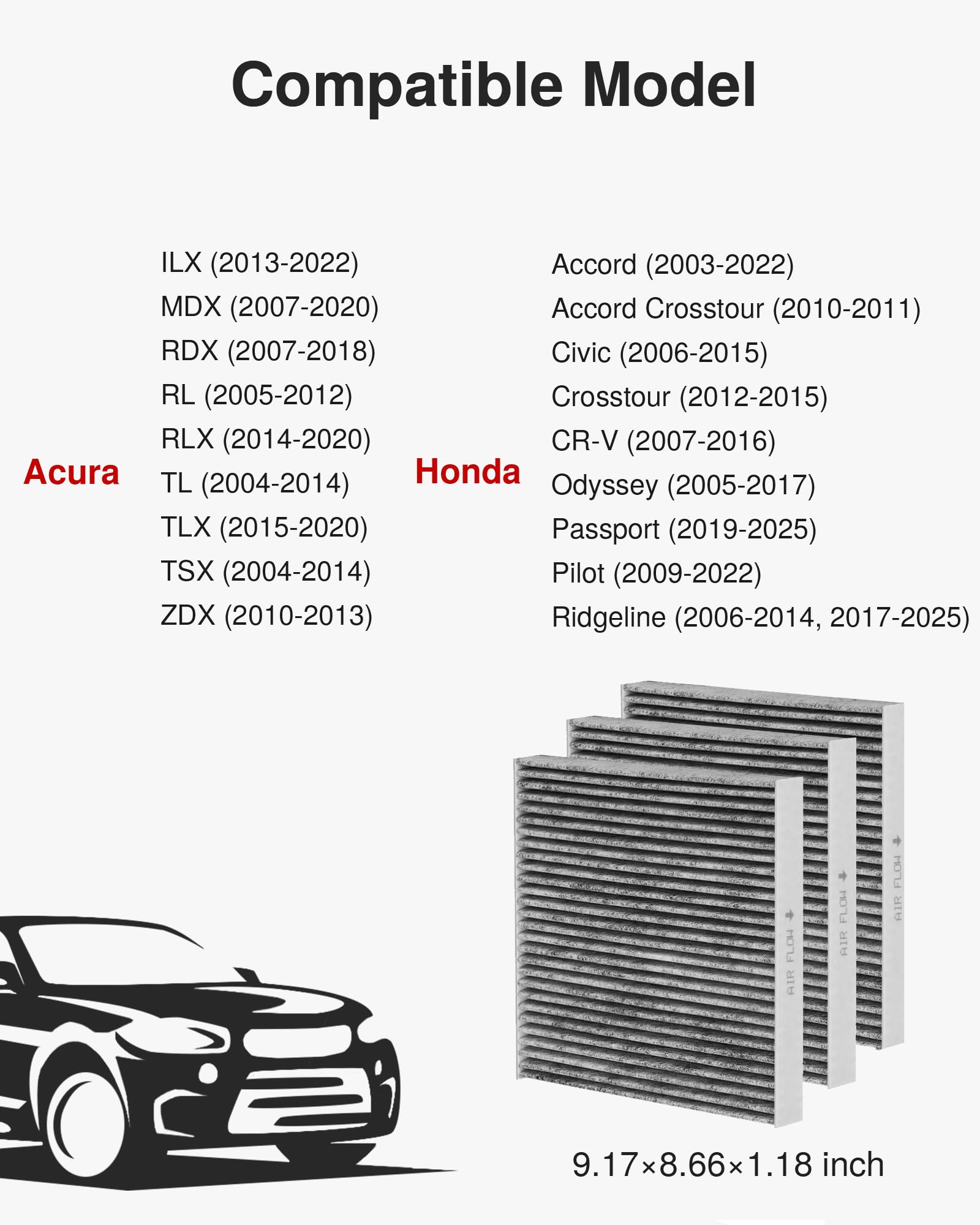 Compatible Auto List: Acura: ILX (2013-2022), MDX (2007-2020), RDX (2007-2018), RL (2005-2012), RLX (2014-2020), TL (2004-2014), TLX (2015-2020), TSX (2004-2014), ZDX (2010-2013). Honda: Accord (2003-2022), Accord Crosstour (2010-2011), Civic (2006-2015), Crosstour (2012-2015), CR-V (2007-2016), Odyssey (2005-2017), Passport (2019-2025), Pilot (2009-2022), Ridgeline (2006-2014, 2017-2025).