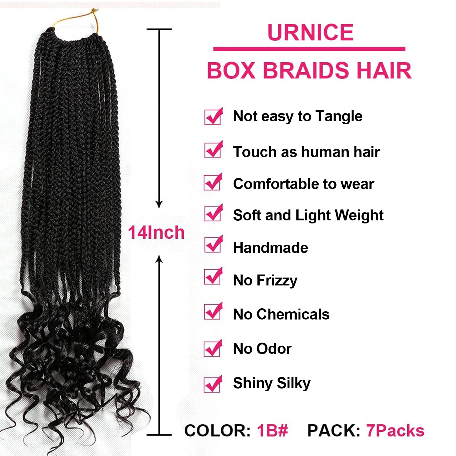 ❤❤7 Packs Pre looped Boho Goddess Box Braids Crochet Hair 14 Inch Crochet Box Braids with Curly Ends for Black Women ❤❤Hair Material: Goddess Box Braid Crochet Hair Made with High-Temperature Synthetic Fiber , It is comfortable to the head ❤❤Hair Quality: Beautiful, Natural Texture, Friendly to the Skin,Lightweight, No Smell, Pretty And Soft, Neat and Easy To Install, Easy to Manage ❤❤Hair Featural: 20 Roots/packs, 14 inch Length, Usually 7 Packs Can Full one Head. ❤❤Package Included: 7 Packs 14 inch Crochet Box Braids Hair + 1 crochet needle + 7 colorful beads. ❤❤Suitable occasions: Daily use,Work,School,Dating,Party,Travel.Suitable people:Especially busy women, underage students, children, and women who pursue fashion