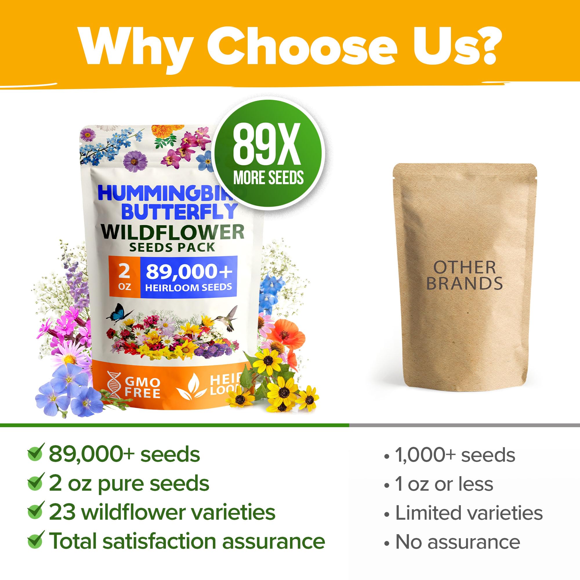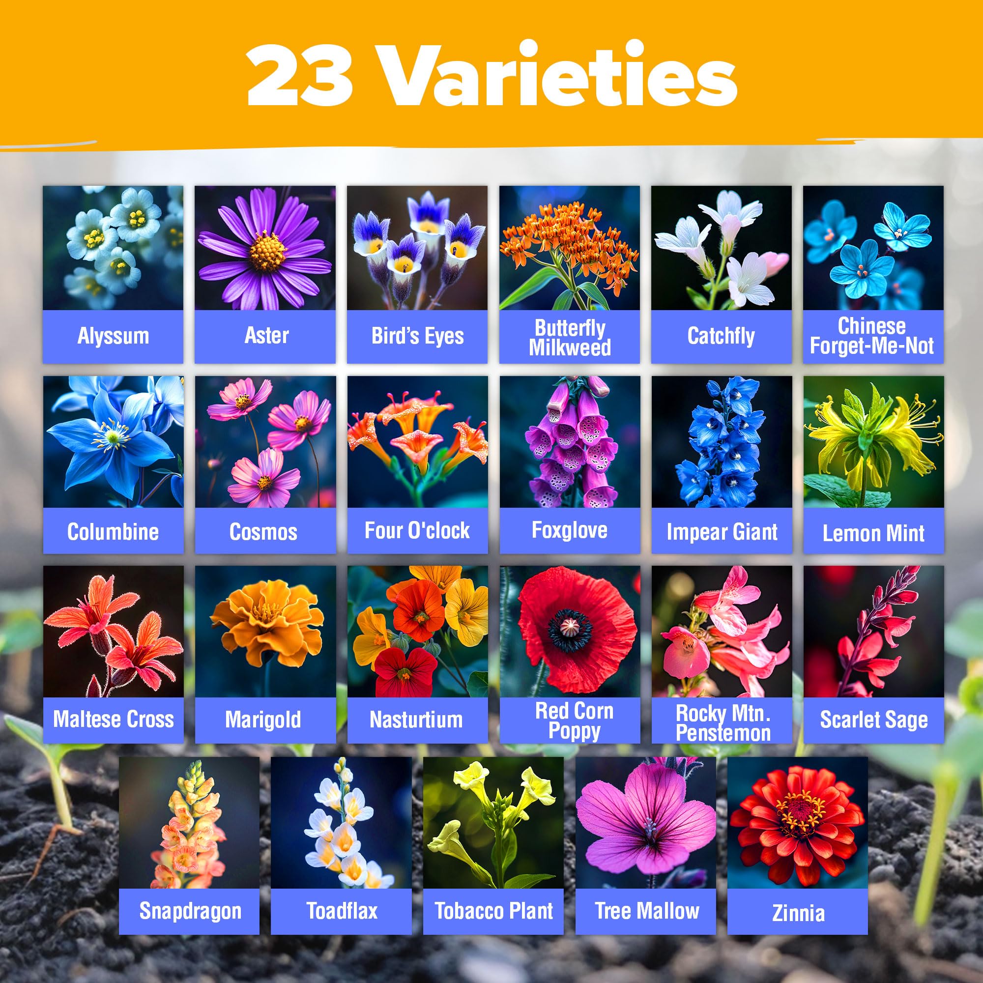 PREMIUM WILDFLOWER MIX: 89,000+ NON-GMO seeds featuring 23 vibrant native varieties; Perfect for creating meadows, butterfly gardens, and cottage-style beds; Attracts pollinators like bees, butterflies, and birds; Works in full sun or partial shade