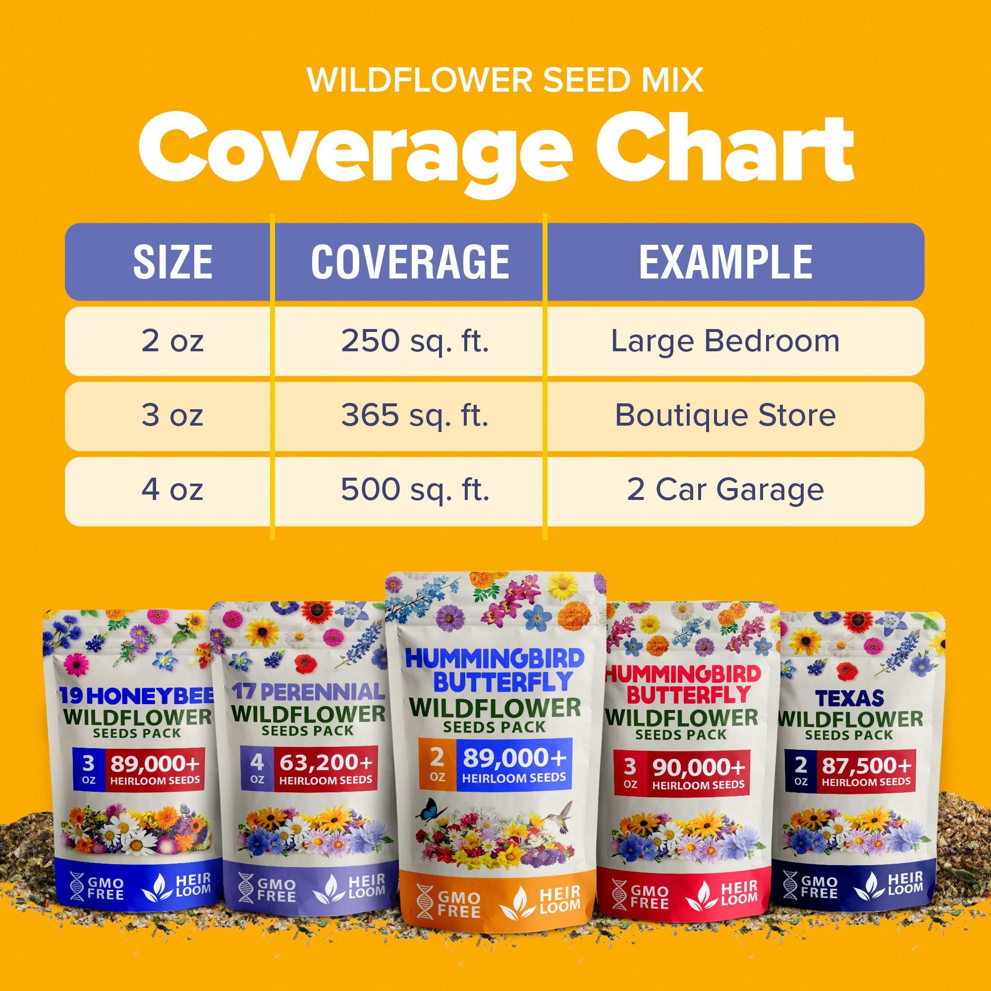 PERENNIAL WILDFLOWER SEEDS BULK: 2oz package of wild flower seeds mix with high germination rate; No fillers or additives; Creates lasting color year after year; Includes popular varieties like Bluebonnet seeds, Blanket flower seeds, and Milkweed