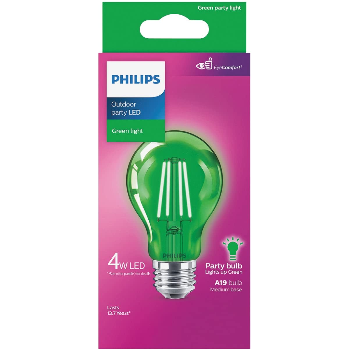 LED party bulb ideal for special occasions, holidays, and parties. Features full colored glass and colored filament for vibrant, saturated color output. Adds a festive touch to any setting. Can be used indoors and outdoors.