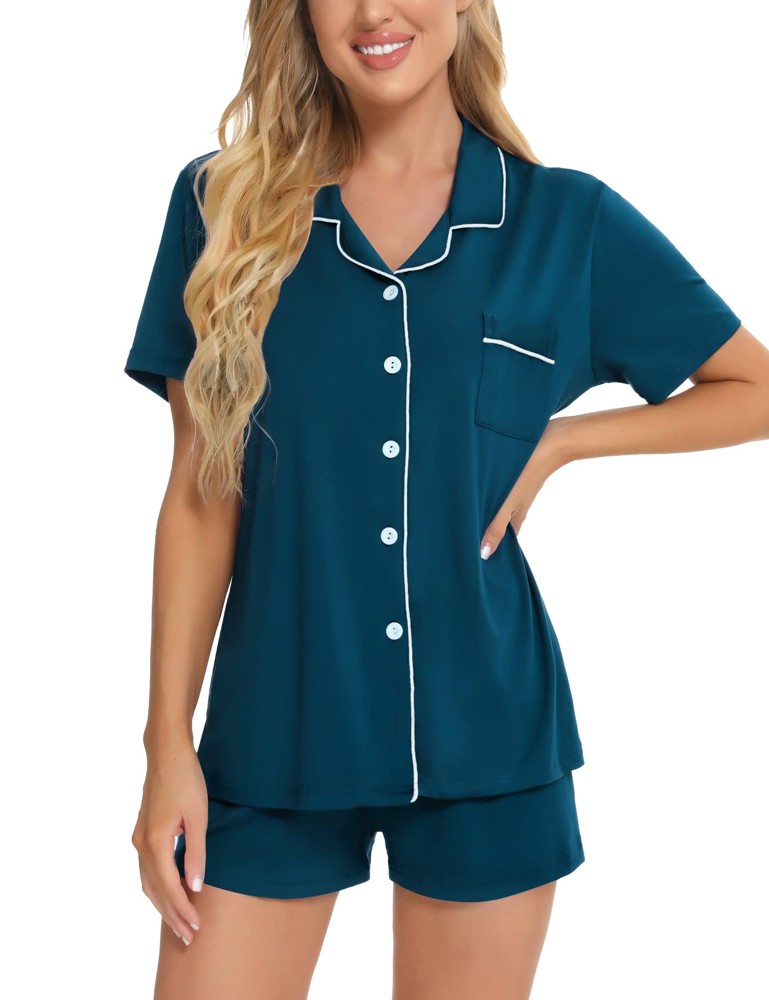 ❤【PERFECT FIT】Two-Piece Short sleeve pajama set with button front top and shorts for relaxed fit. Short sleeve pajama set features chest pocket, notch collar and contrast piping trim. It's slick and durable, bringing optimum comfort to your leisure time.