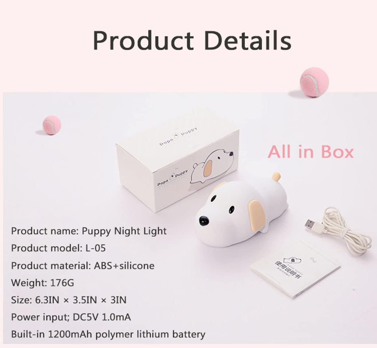 International Standard:LED puppy night light children built-in 1200 mAh battery, rechargeable LED bedside lamp baby room and companion sleeping light. The cute puppy light can work for about 6 hours. The baby night lamp is portable and wireless, very cute and practical kid's nightlight