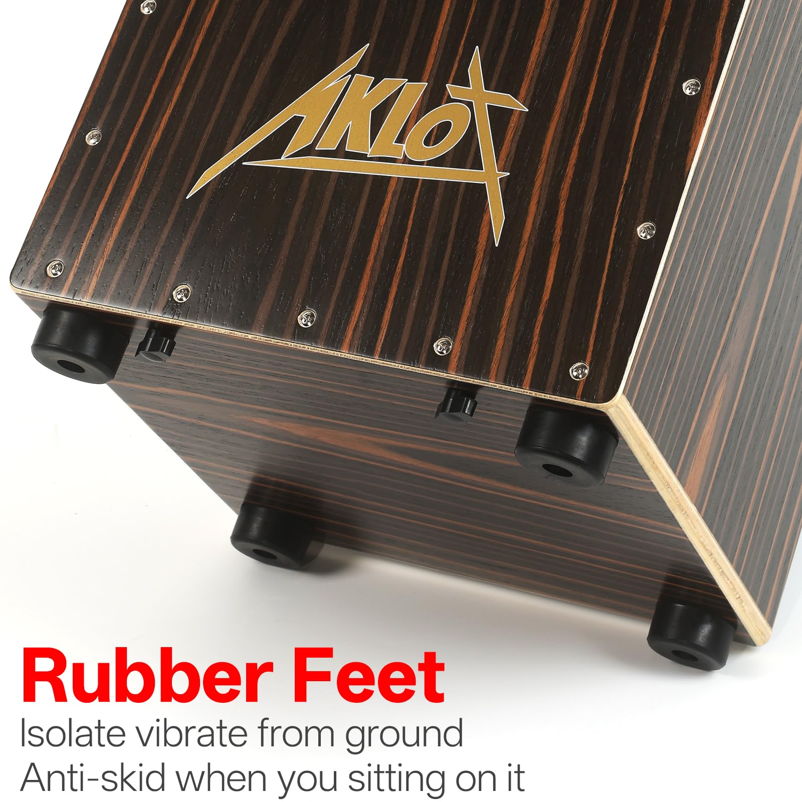 Easy To Play :just sit down on it and tap with your hands to explore bass and snare drum sounds; this cajon drumis a perfect instrument for getting the confidence to play percussion with no experience.In addition,the rubber feet will keep the Cajon drum stay stable when you sit on it or slightly till it up