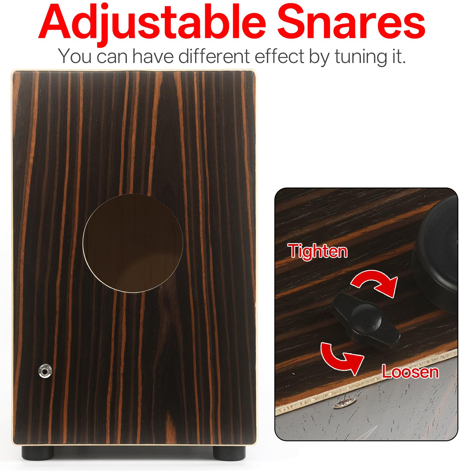 Upgrade Tuning :Just rotate the tuning button counterclockwise or clockwise to get the sound you want,do not need a wrench, but we make adjustments before leaving the factory.The Cajon drum is an Ideal percussion instrument for acoustic shows and jam session