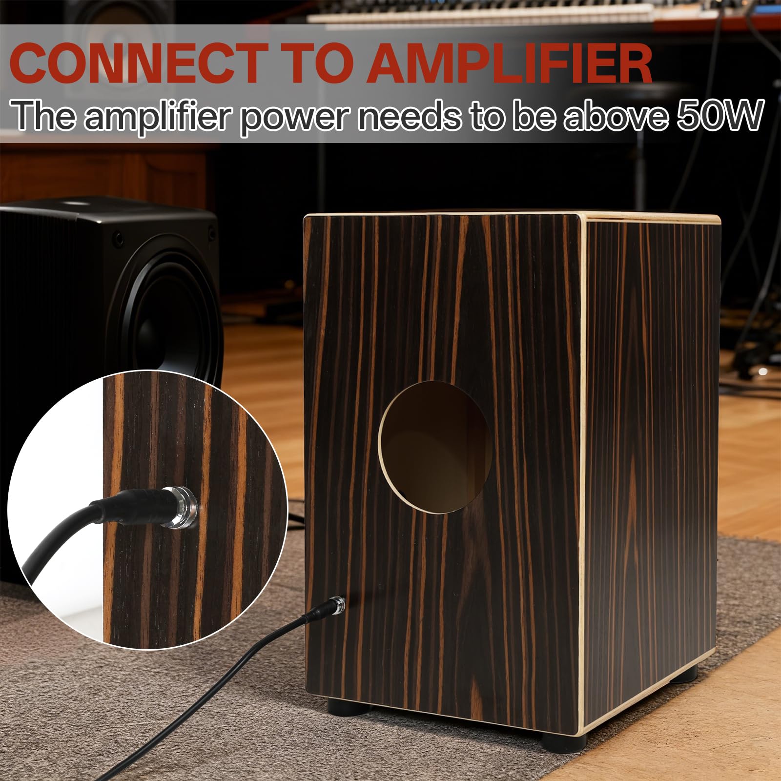 Electronic Cajon:This eletric cajon drum can play with an amplifer (The power needs to be above 50W).Thoroughly solve the limitations of volume and timbre: when weak, details can be clearly conveyed through amplification, and noisy stages can also make bass rich and treble crisp; More stable sound pickup, suitable for multiple scenarios such as performances and recordings