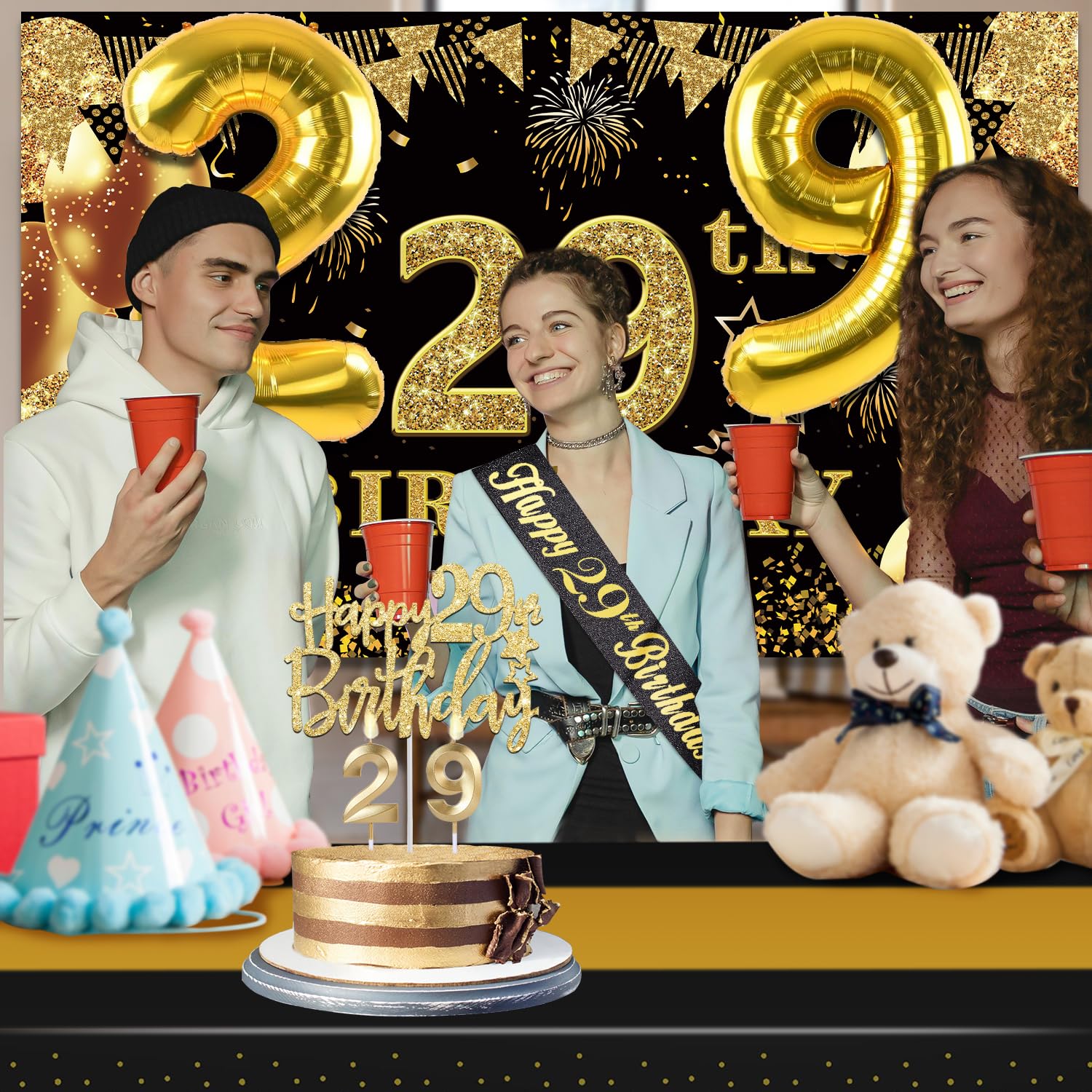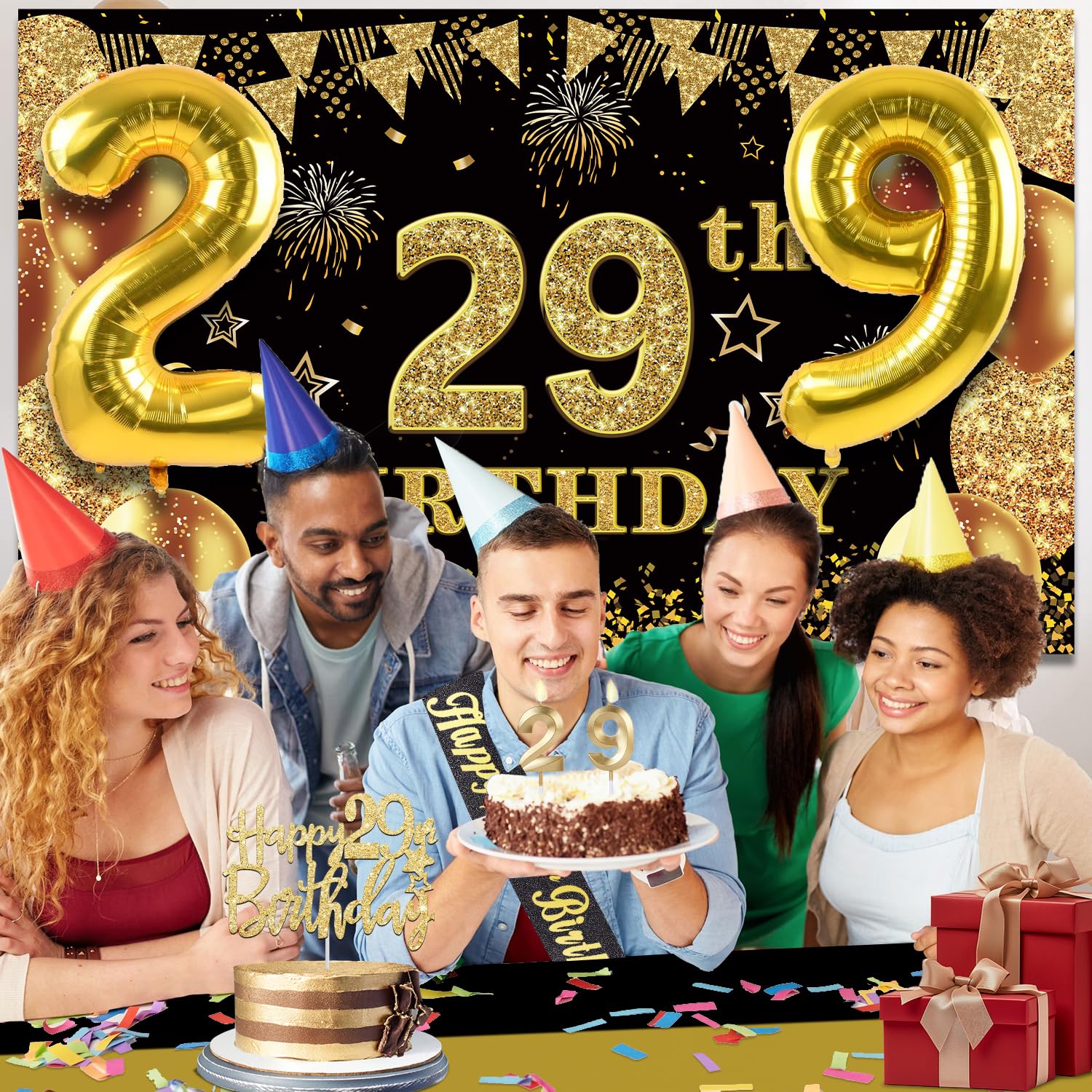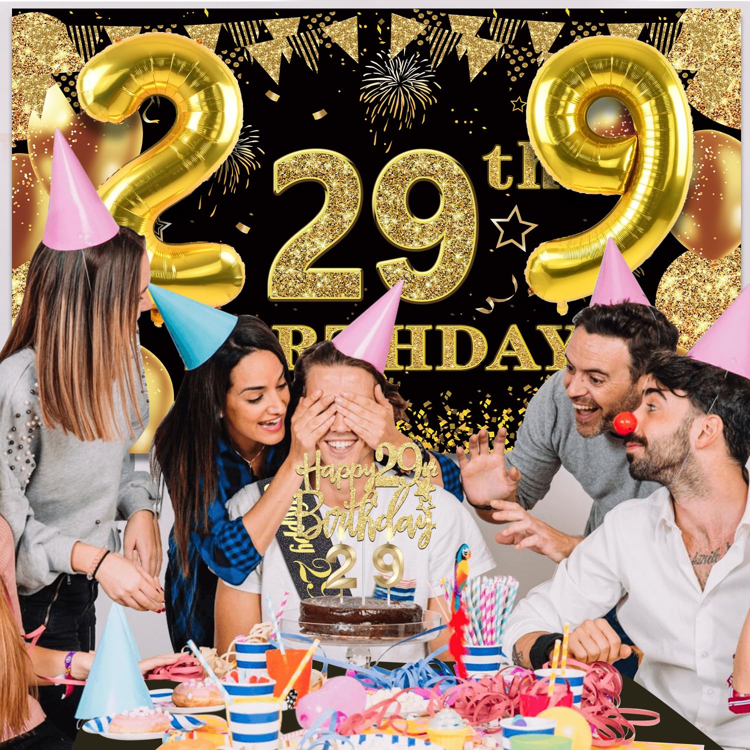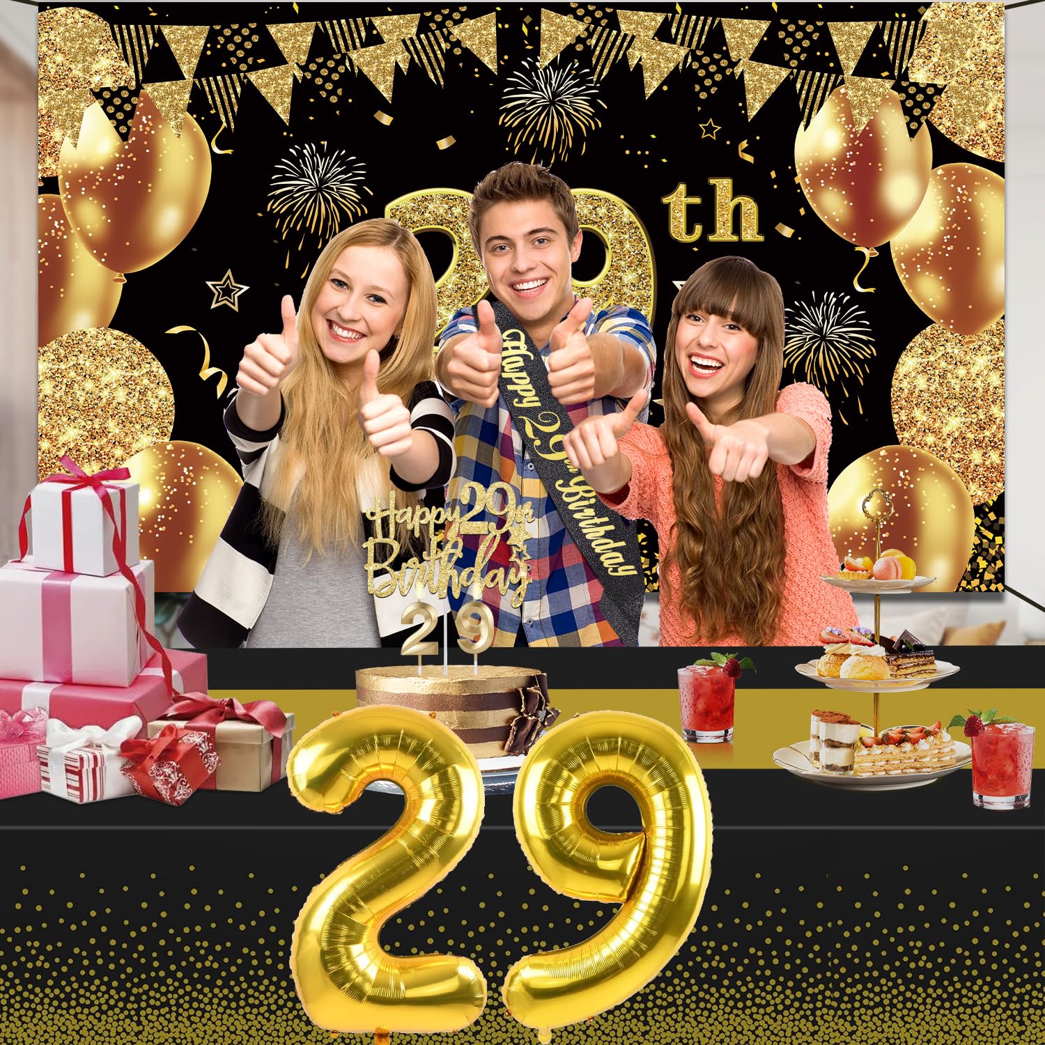 29th Birthday Balloons and Sash: Big Size 71 * 4 inches Glitter Black Happy 29th Birthday Sash with Gold Foil lettering and come with a gold charm pin that you can easily adjust the length you needed. Make the birthday king and birthday queen be eye-catching. Big 32inch gold 29 balloons come with straw to inflate. It has Self-sealing valve for easy inflation and deflation. Hang 48th balloons add much fun in the 29 birthday party