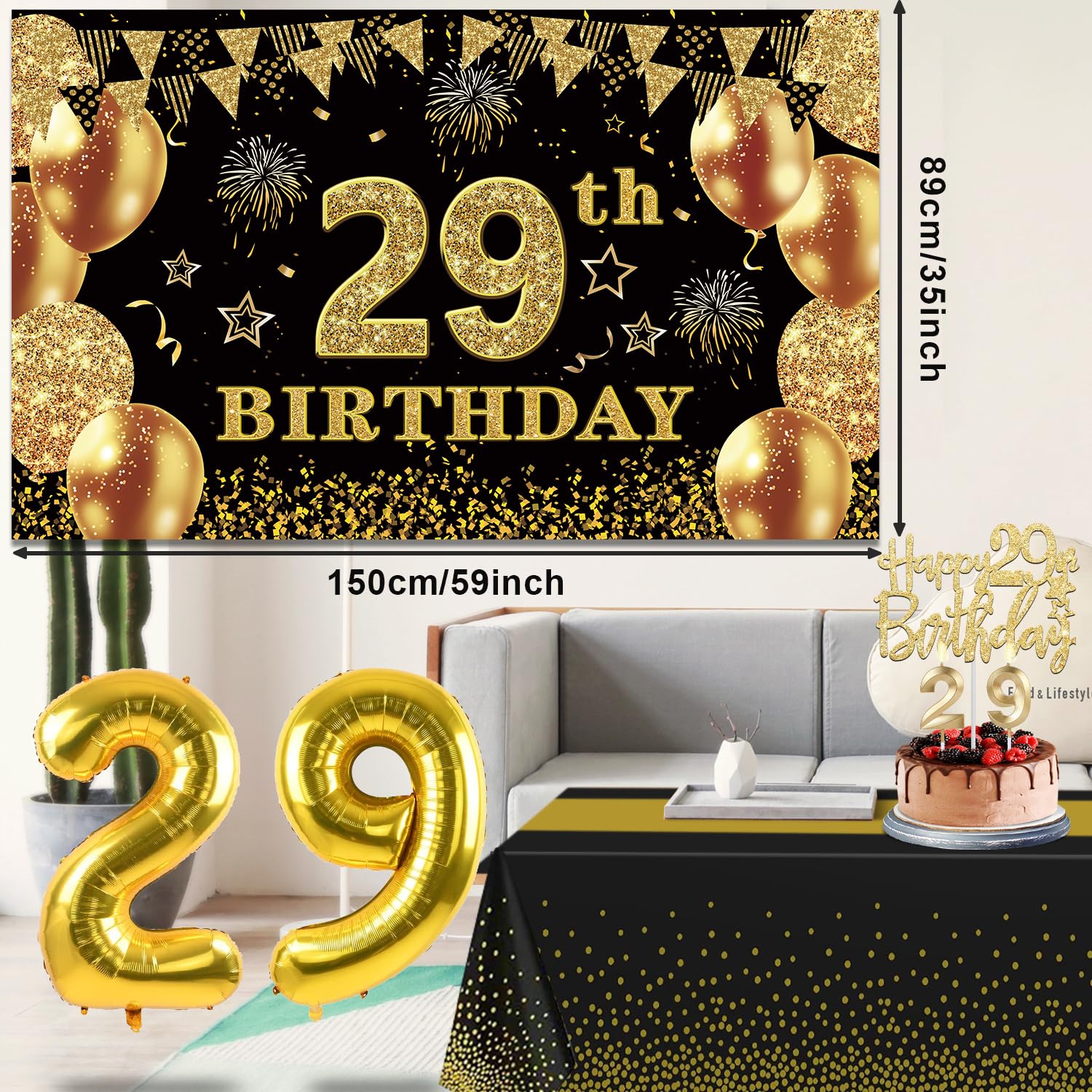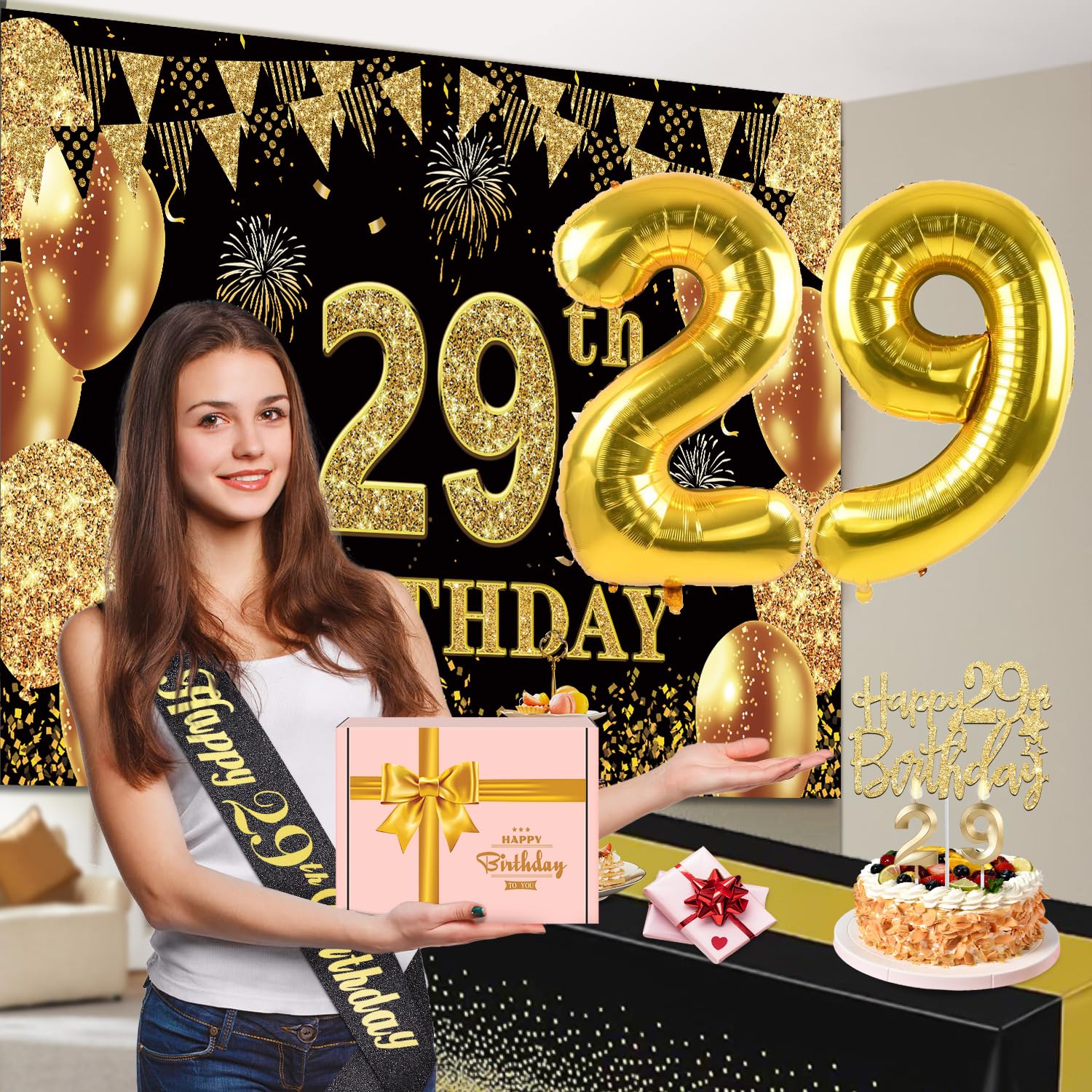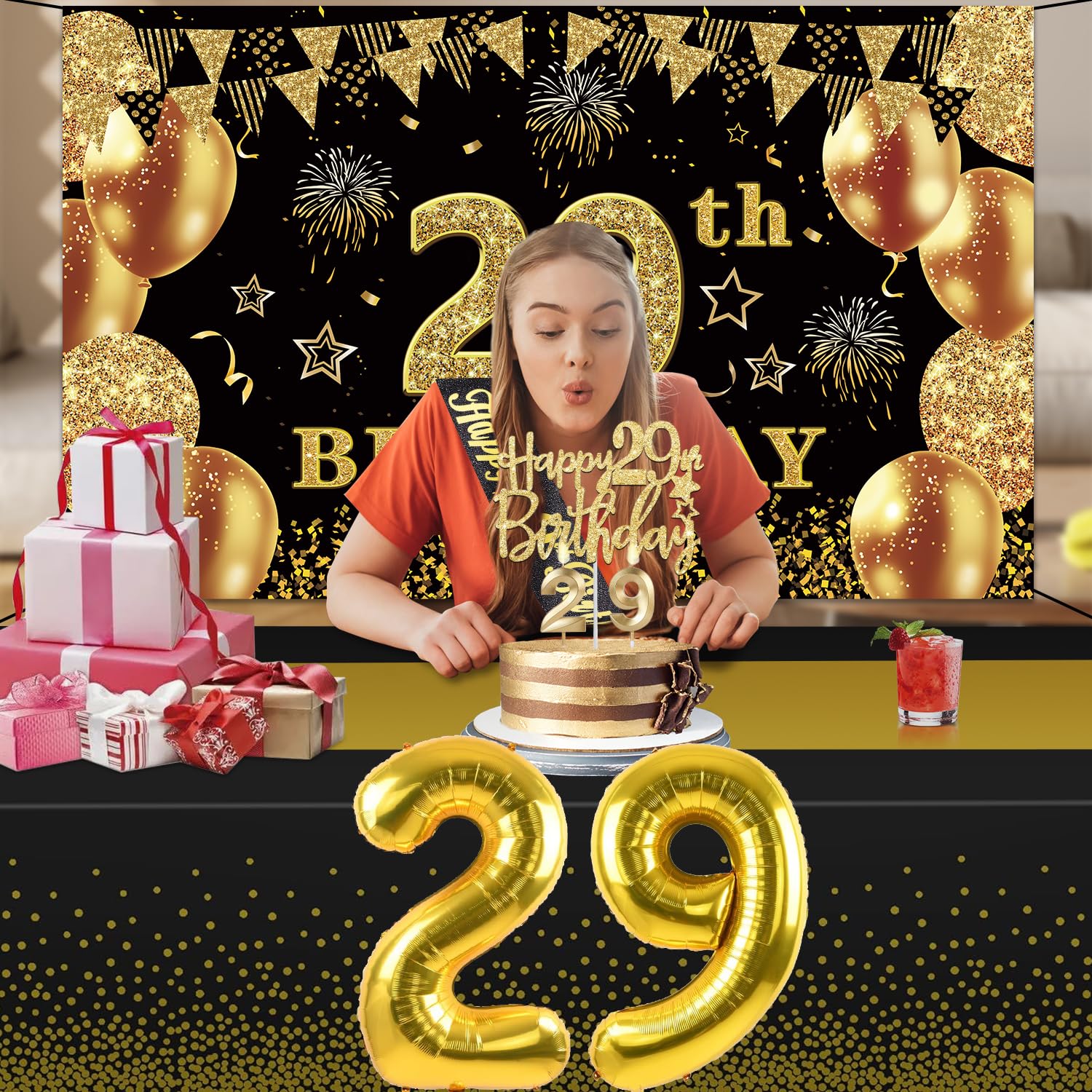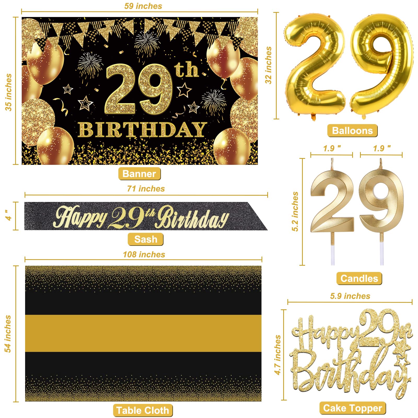 29th Birthday Decorations Kit: Packing coming with Large 29th Birthday Banner x 1pc, Big Gold 29th Birthday Balloons x 1set, Black and Gold Table Cloth x 1pc, Black Glittery with Gold Foil Words Happy 29th Birthday Sash x 1pc, Happy 29th Birthday Cake Topper x 1pc, Gold Number 29 Candles x 1set. This Value Black and Gold Party Decorations Set Meet Your Every Needs and Expects in 29th Birthday Milestone