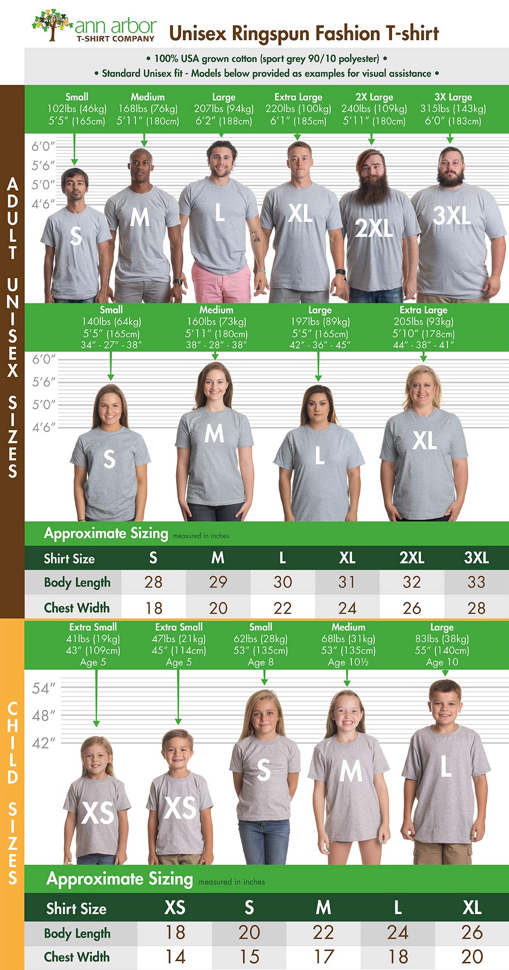 UNISEX Modern Fit Sizing - this shirt is slightly tapered to be a little less boxy than the old style of mass-market t-shirt. Nothing drastic, and most people wear the same size in our shirts as they do in all of their others, but you might go one size larger if you're on the fence. It is pre-shrunk, but like any high-cotton product, will still shrink slightly in the wash. Our model photos are the real thing - the actual shirt on our salesguy, Rich. He's 6' 2", 200 lbs and wearing a large