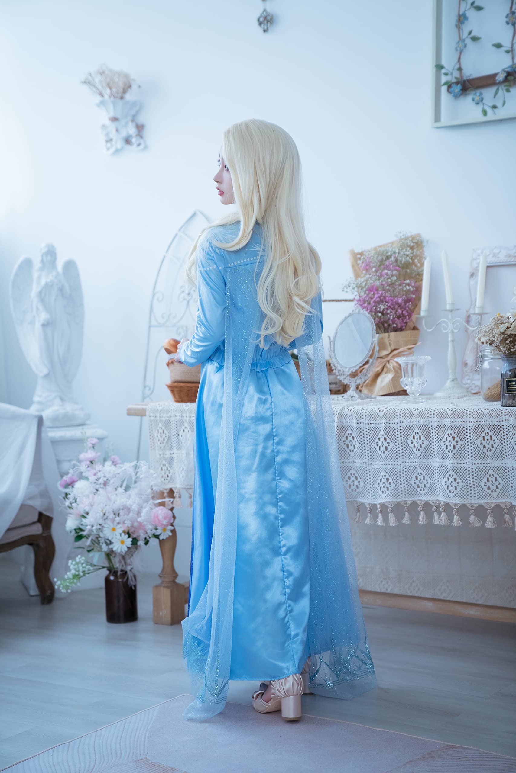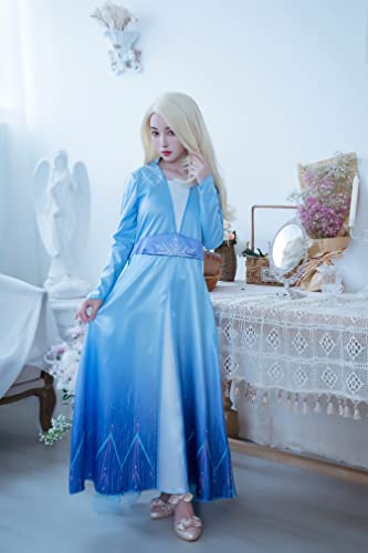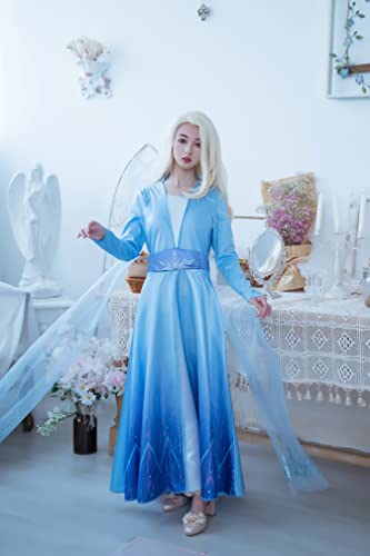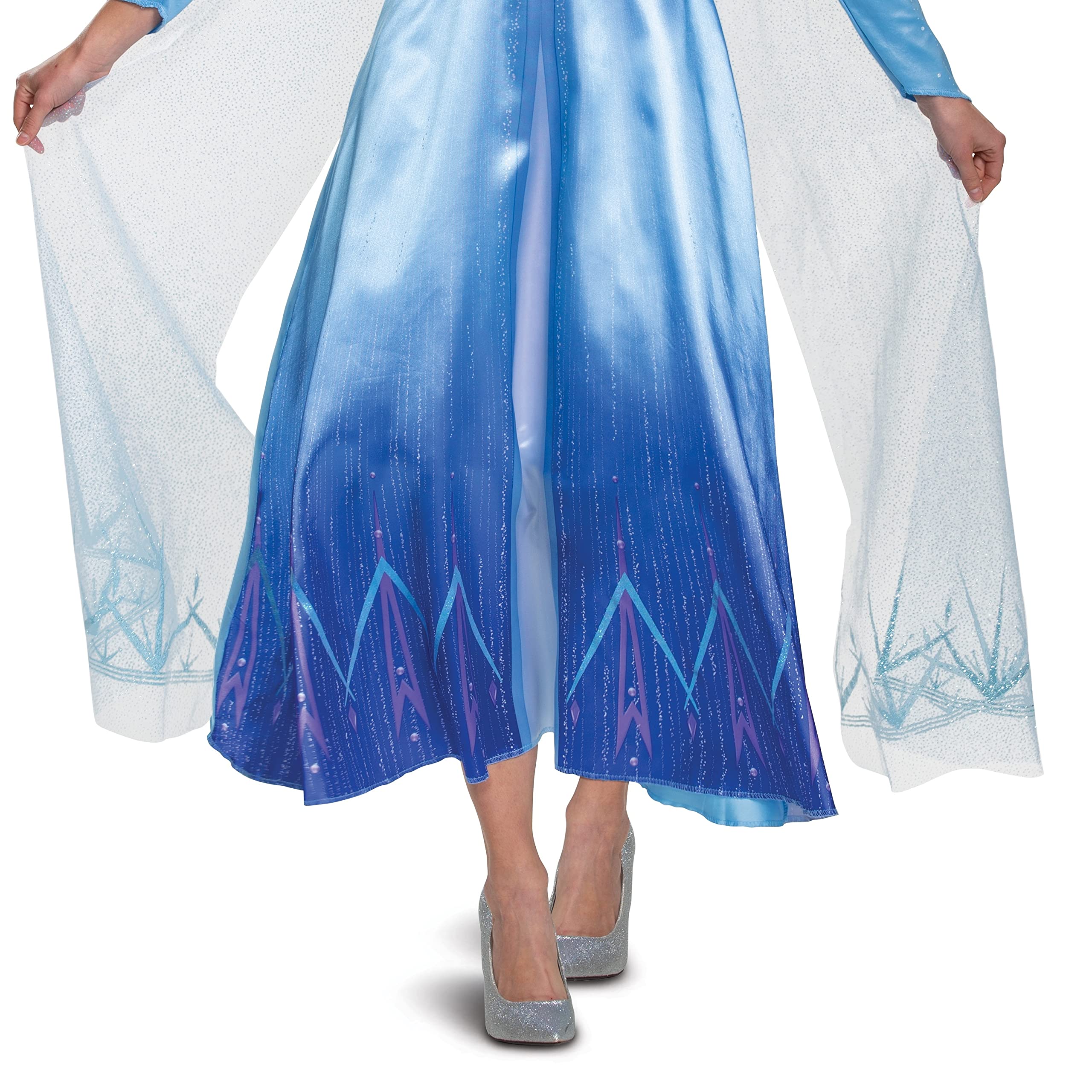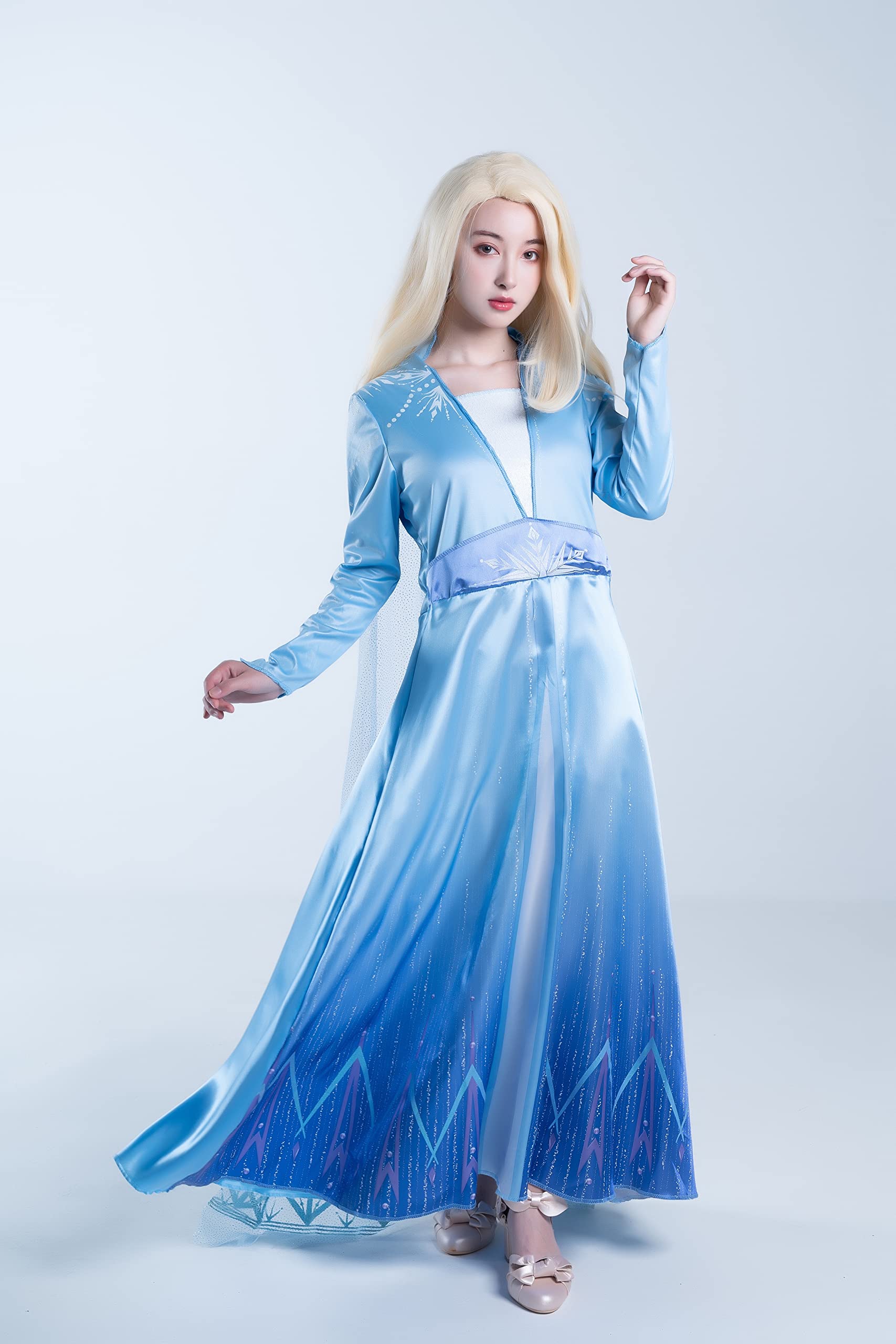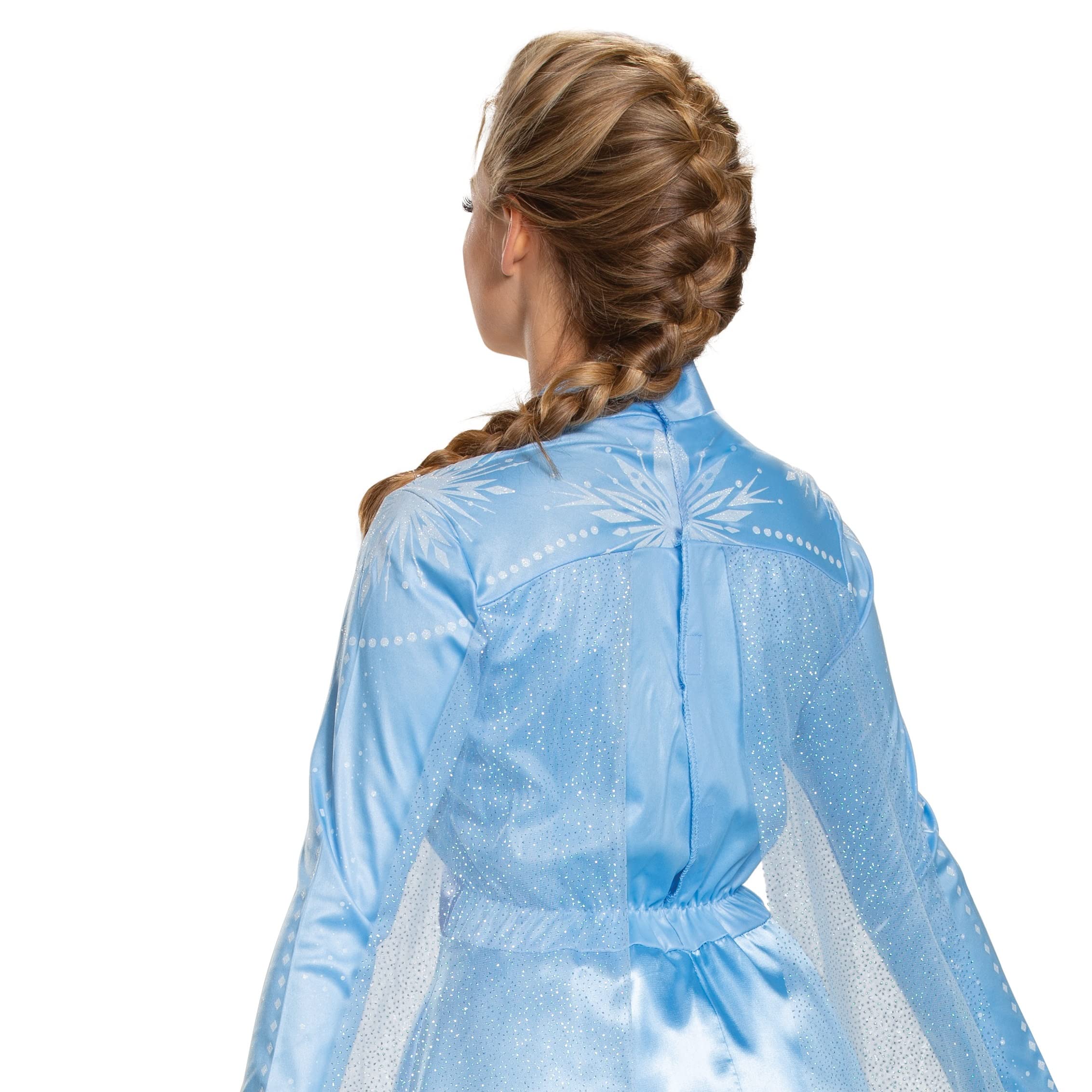 Description From the blockbuster movie frozen 2 comes this beautiful Elsa deluxe costume. Become the snow queen in this long dress with glitter snowflake cape just as she looks in the movie.