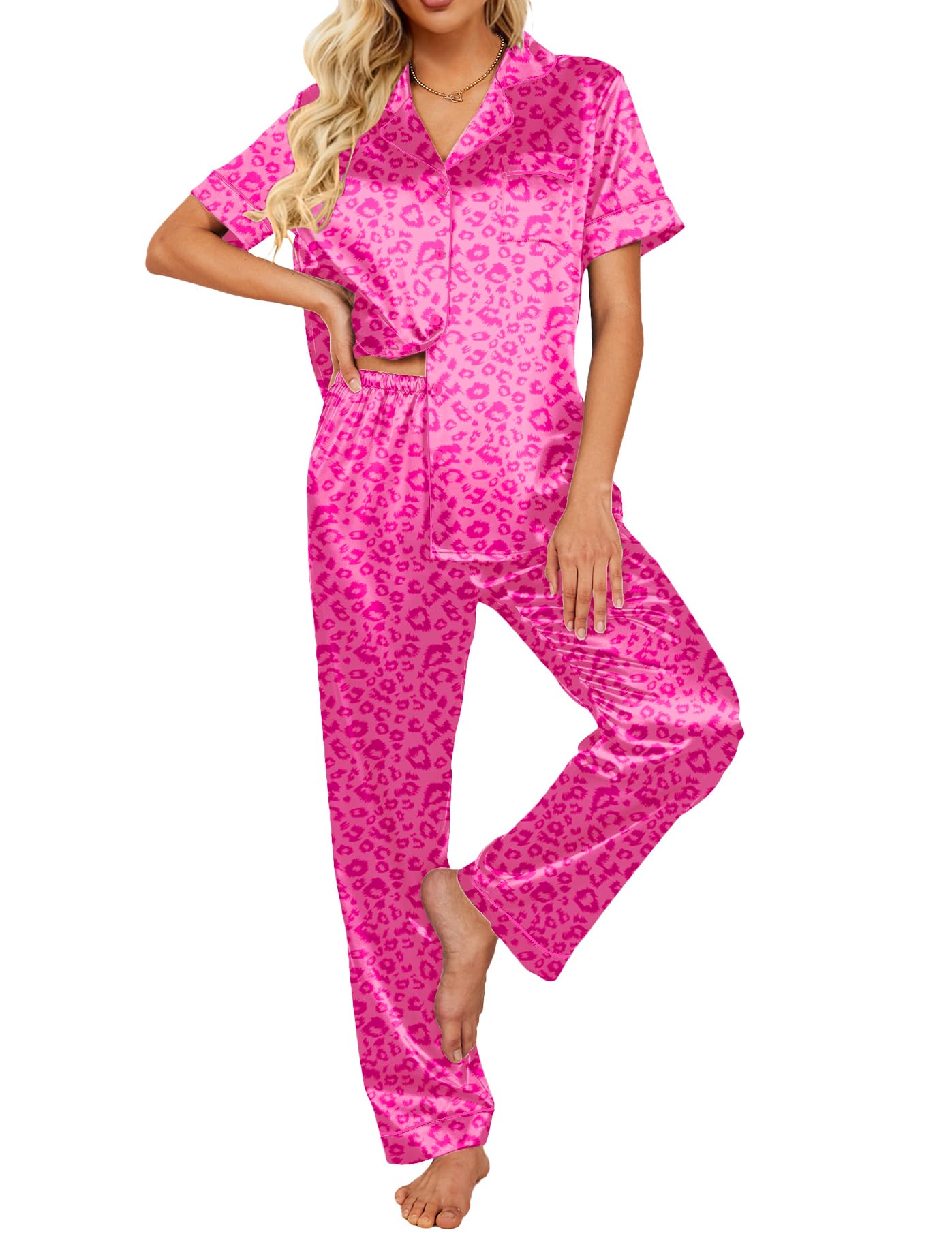 Classic Button Down Pajamas: The relaxed fit two piece comfortable loungewear features the silk bottoms with elastic waist and matches a silky-smooth short-sleeve V-neck top with a chest pocket. Suitable for all seasons. Classic full button up pj set is easy to put on and take off.