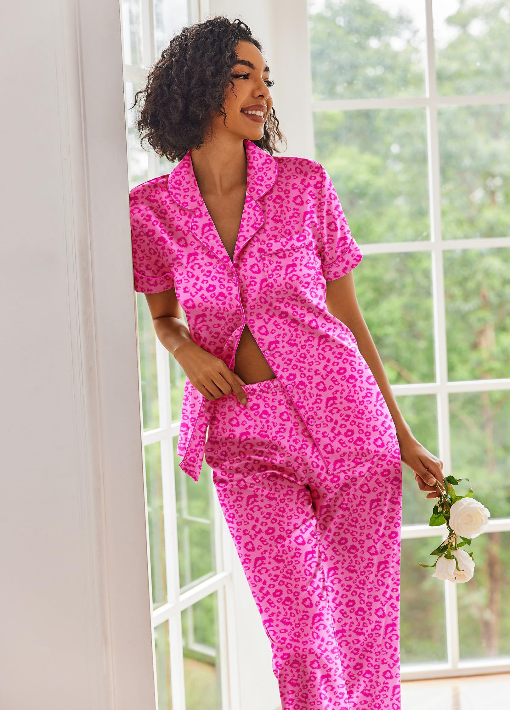 Soft Satin Pajama Set: Made of premium 95% Polyester, 5% Spandex silk satin, the pajama set for women is lightweight, breathable and skin-friendly, just like wrapped in a cloud, helping you have a sound sleep.