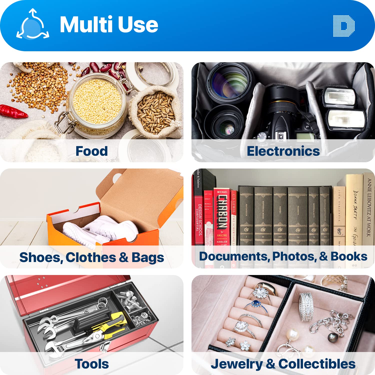 [How To Use] Place your items and silica gel packets in a tightly sealed container to protect your items from moisture damage; Use silica gel packs to protect 3D Filaments, Safes, Guns, Ammos, Canister, Collectables, Jewelry, Documents, Camera Lens, Clothes, Cosmetics, Books, Bags, Decorations, Wet phones, Cameras, Watches, Electronics, Shoes, and Many Other Valuables