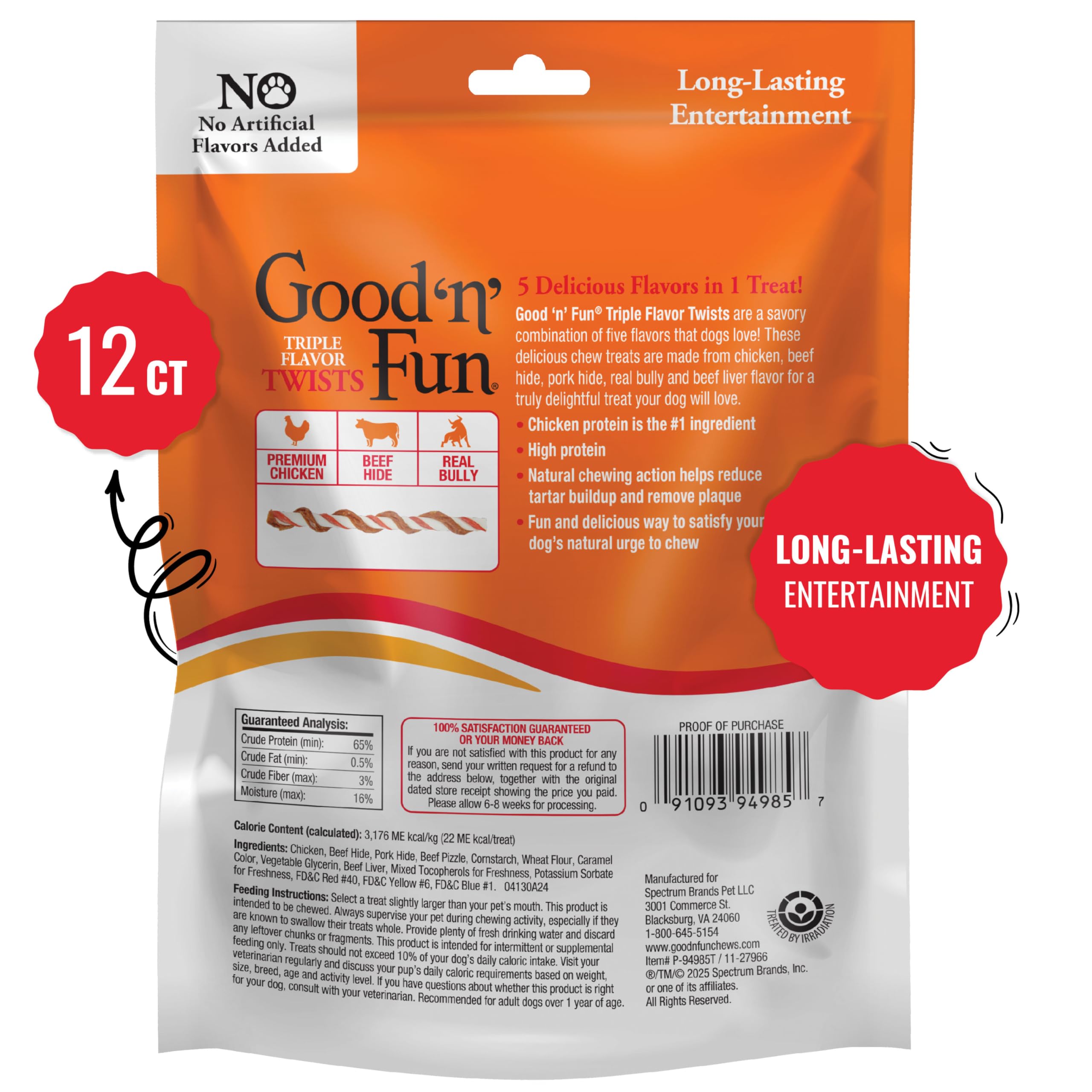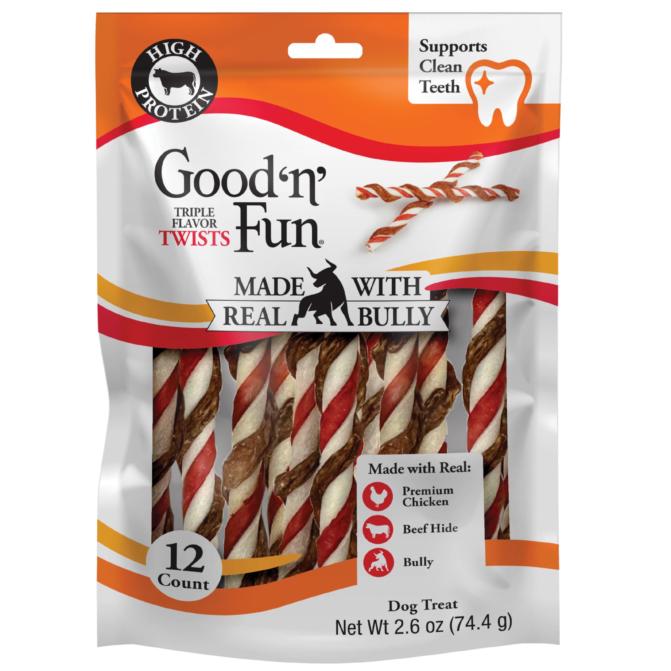 Good 'n' Fun® Triple Flavor Twists with Real Bully add protein to your dog’s diet without adding dollar signs to your budget. With more than 99% protein from animal sources, our hand-twisted, high-protein chews are made from premium chicken as the #1 ingredient, along with beef hide, pork hide, real bully and beef liver flavor for an irresistibly crave-worthy taste. And, our chews are pup-approved! With 92% palatability, dogs prefer Good 'n' Fun® Triple Flavor Twists with Real Bully over other bully products in the dog treat aisle.* Pure bully sticks can get gross and smelly, but our beef-hide chews made with real bully invite playful interaction instead of the ick factor. Engage your pup in mental stimulation during chew time to alleviate boredom and keep them occupied. Long-lasting for moderate chewers, our twists give adult dogs an entertaining way to satisfy their natural urge to chew. The chews also support clean teeth, with the natural chewing action helping reduce tartar buildup and remove plaque. With no artificial flavors added, you can have peace of mind as your dog enjoys their chew-time treat. Select a treat slightly larger than your pet’s mouth. This product is intended to be chewed. Always supervise your pet during chewing activity, especially if they are known to swallow their treats whole. Provide plenty of fresh drinking water and discard any leftover chunks or fragments. This product is intended for intermittent or supplemental feeding only. Treats should not exceed 10% of your dog’s daily caloric intake. Visit your veterinarian regularly and discuss your pup’s daily caloric requirements based on weight, size, breed, age, and activity level. If you have questions about whether this product is right for your dog, consult with your veterinarian. Recommended for adult dogs (>1 year of age).