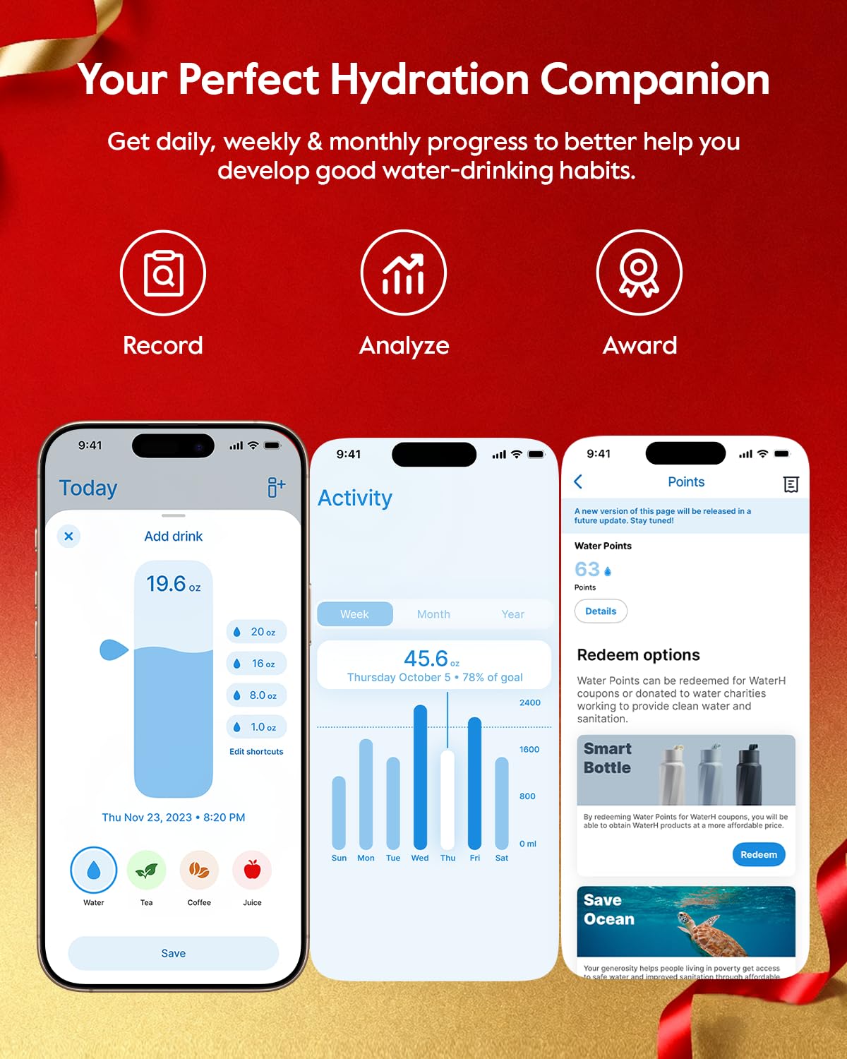 IDEAL GIFTS FOR FESTIVAL: Given its combination of smart features, excellent insulation, and stylish design, the BOOST Smart Water Bottle is not only a practical tool but also an excellent gift for anyone prioritizing health and wellness. You can earn points for every sip, which can be redeemed for discounts on future purchases—a rewarding way to stay hydrated and healthy!