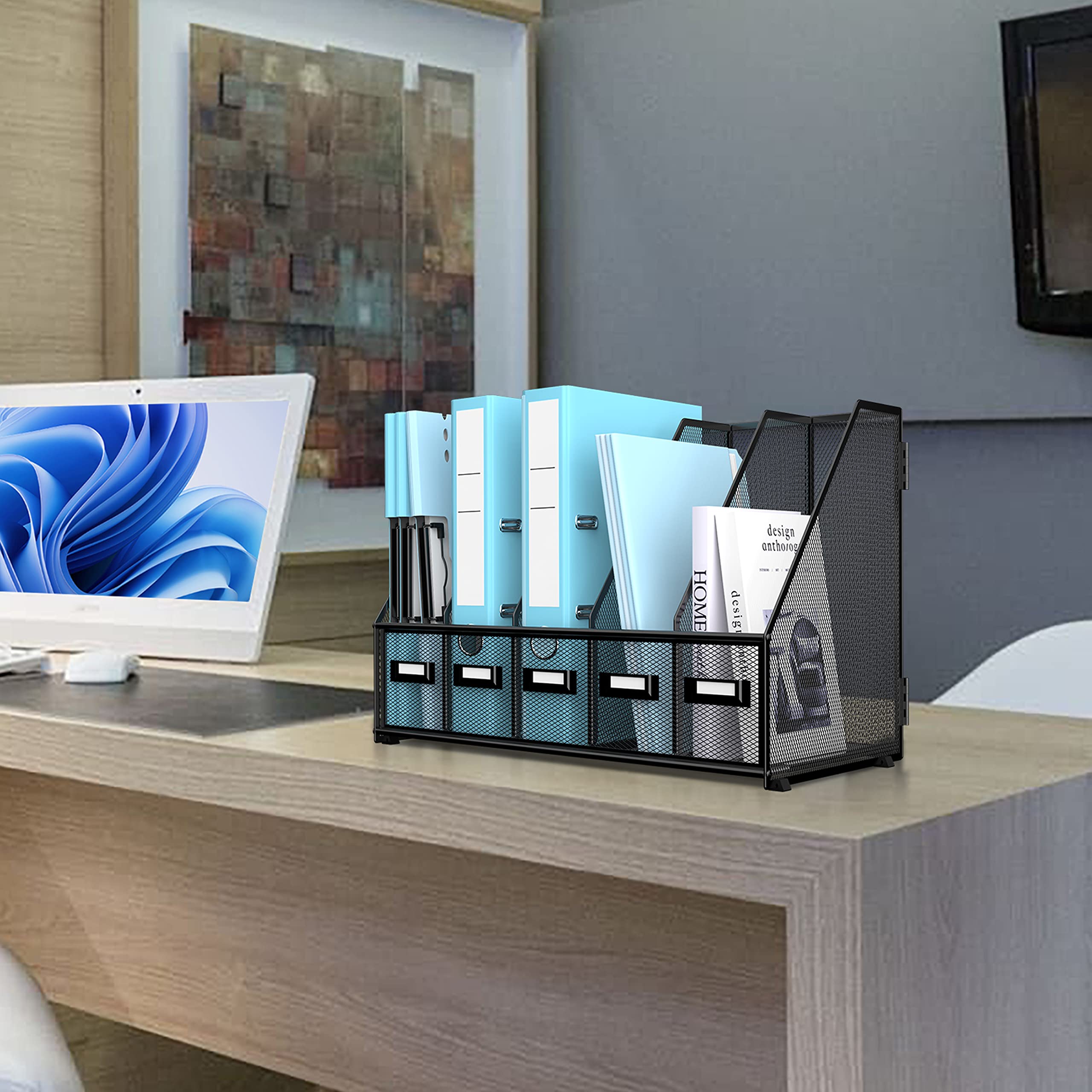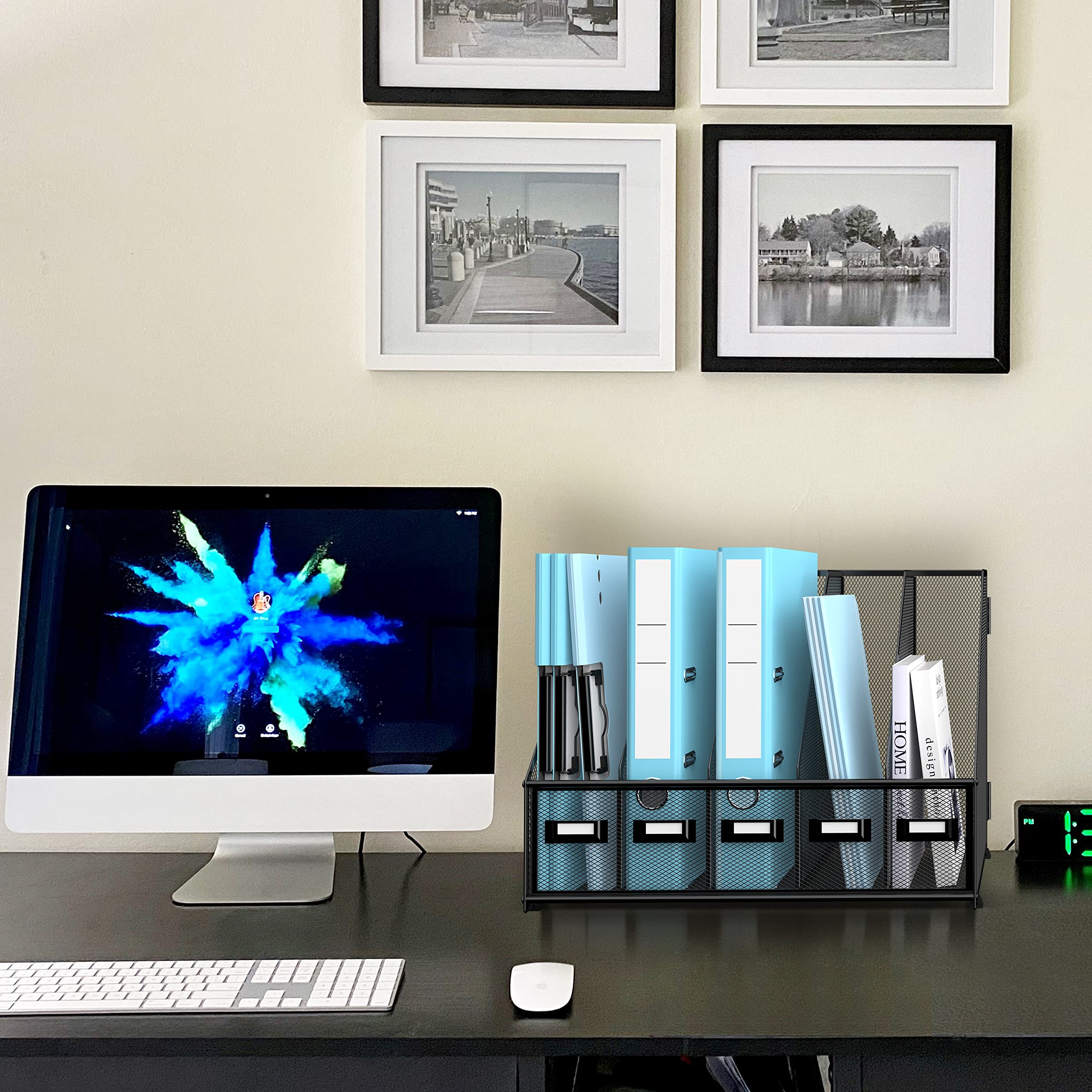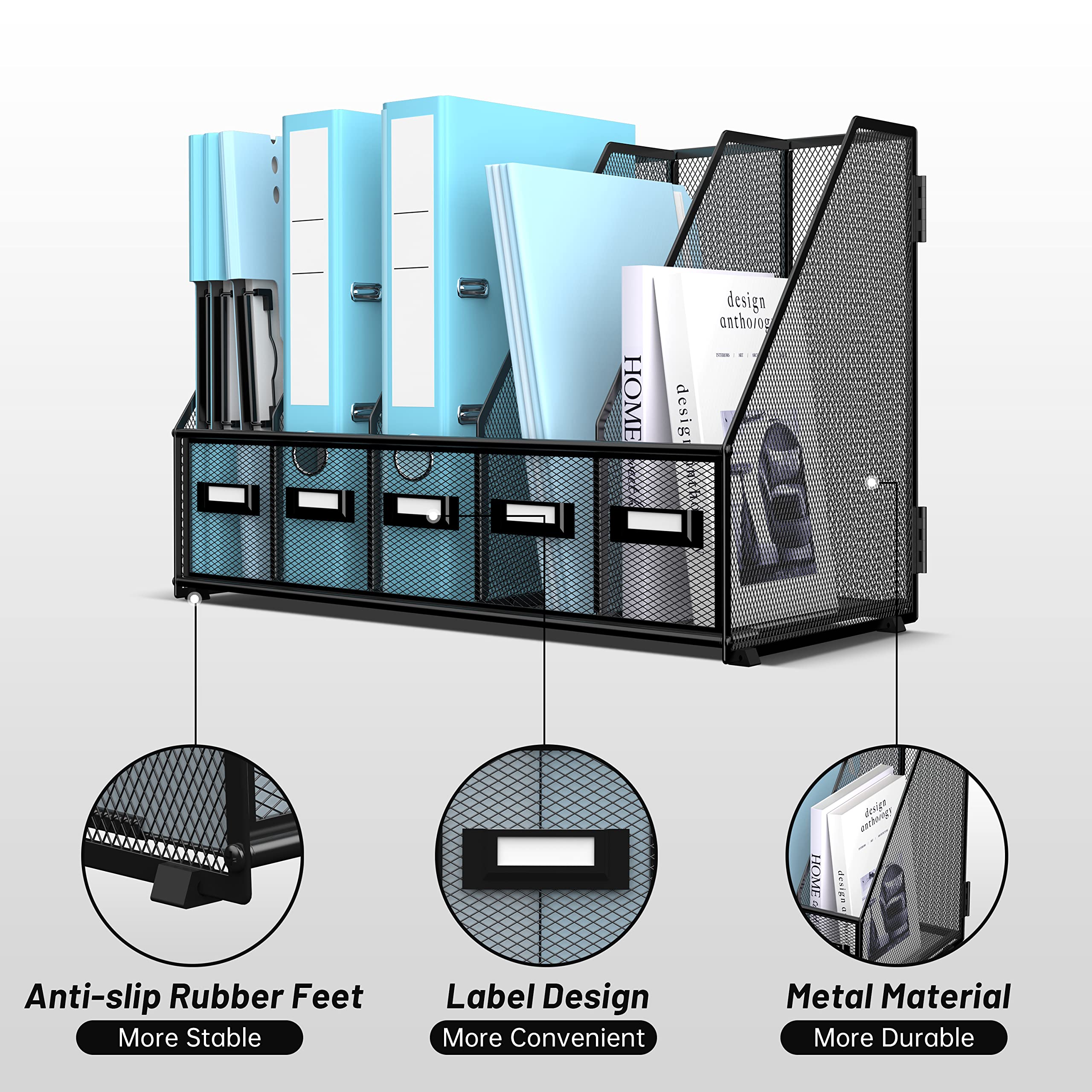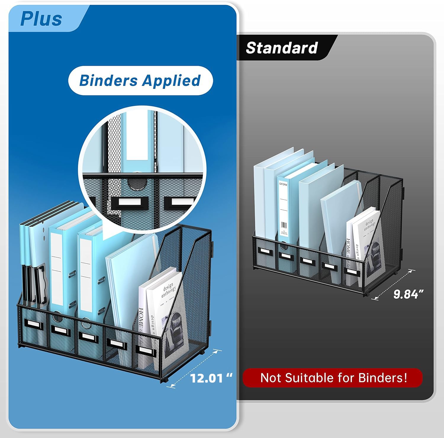 [Humanized Detail Design] The file holder for desk has 5 vertical compartments, which is convenient for classifying office supplies. Replaceable tags are a great help for labeling, classifying, and quickly finding the desired item. Anti-skidding foot make the binder organizer difficult to slide on the desktop.