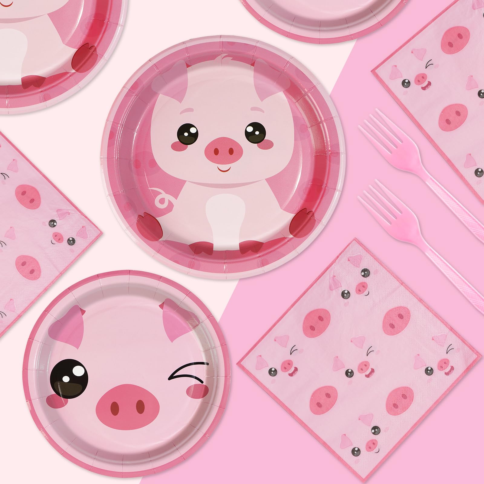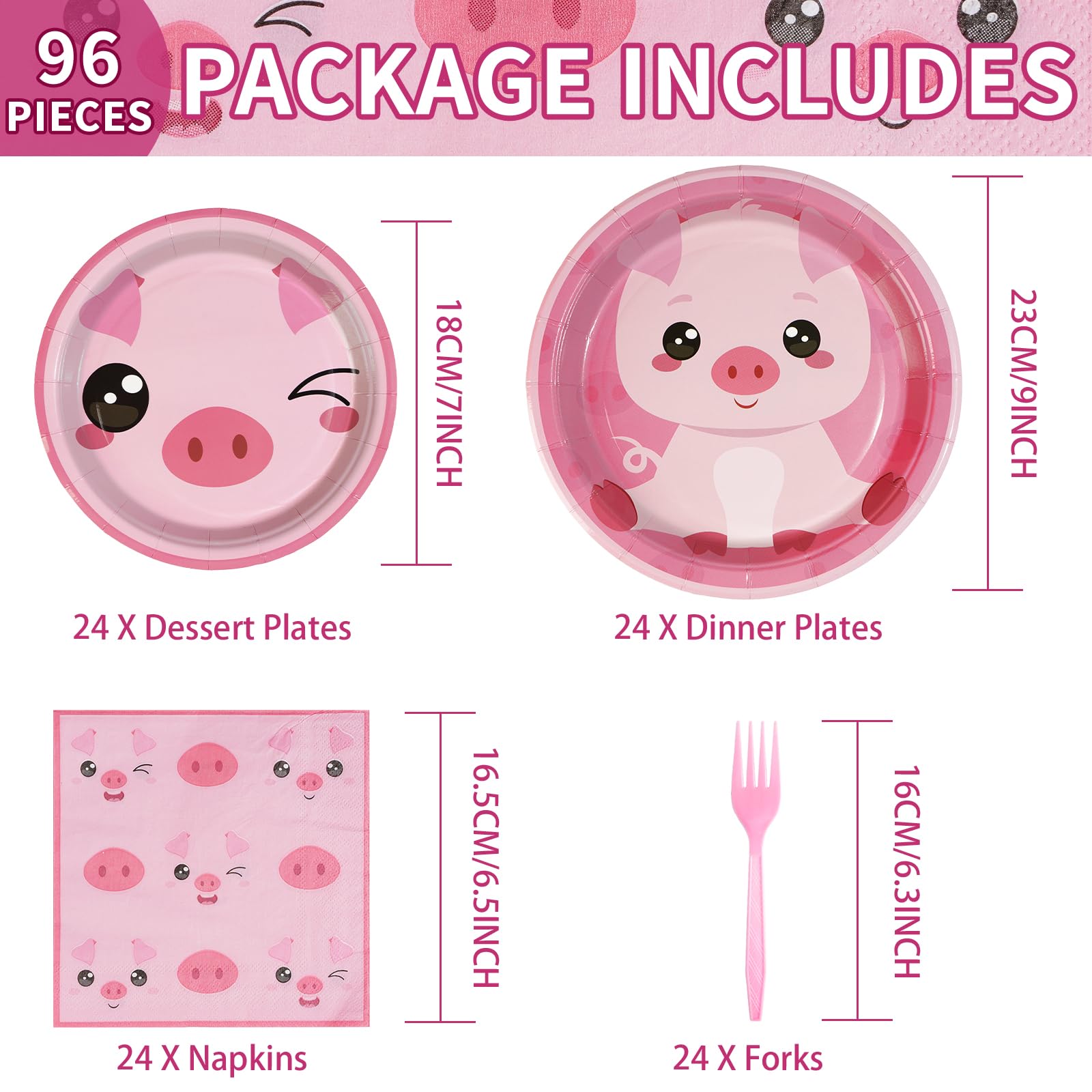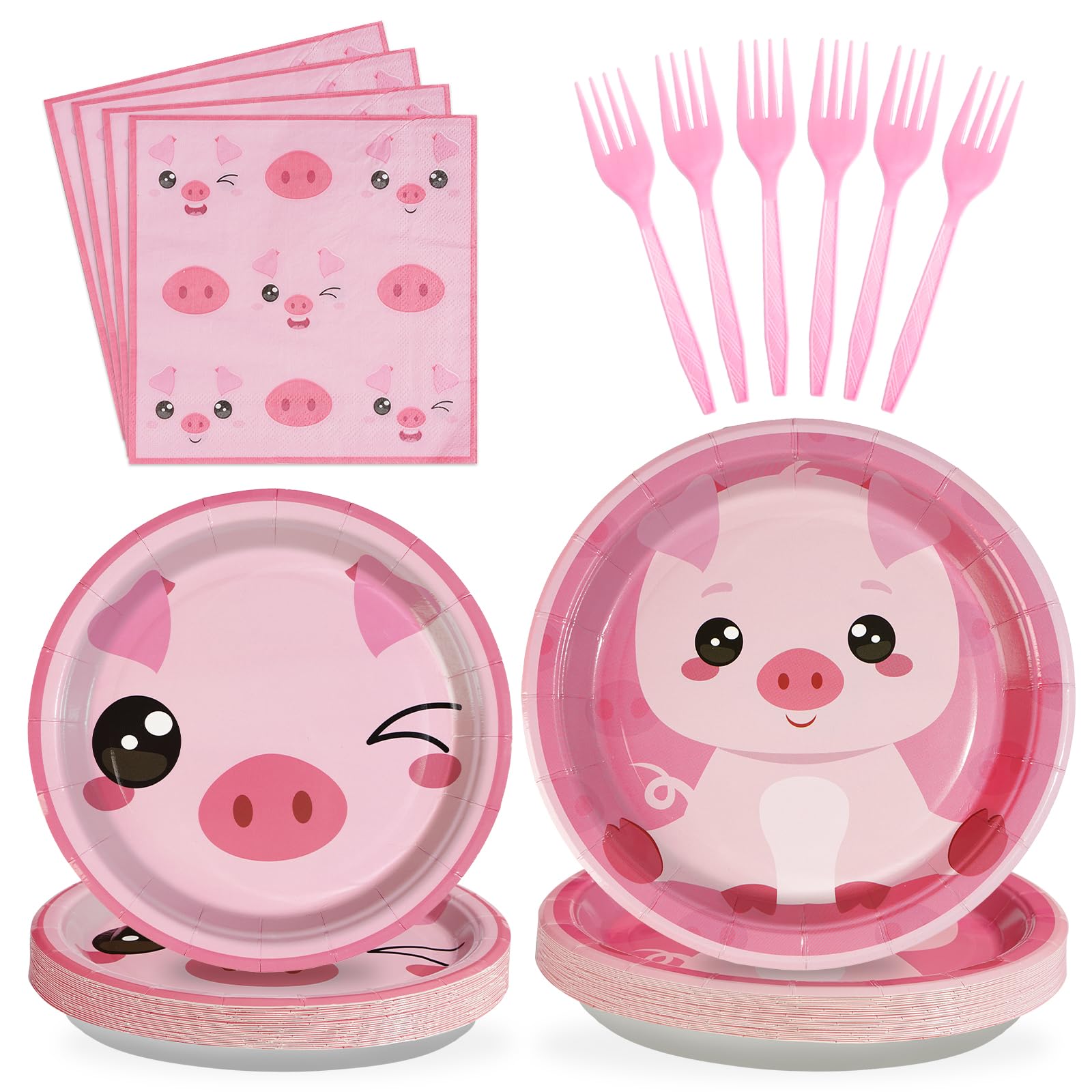Package included: You will receive 24 9" pink pig themed paper plates, 24 7" pink pig themed paper plates, 24 6.5"pieces pink pig themed napkins and 24 pieces plastic pink forks, each set can serve 24 guests