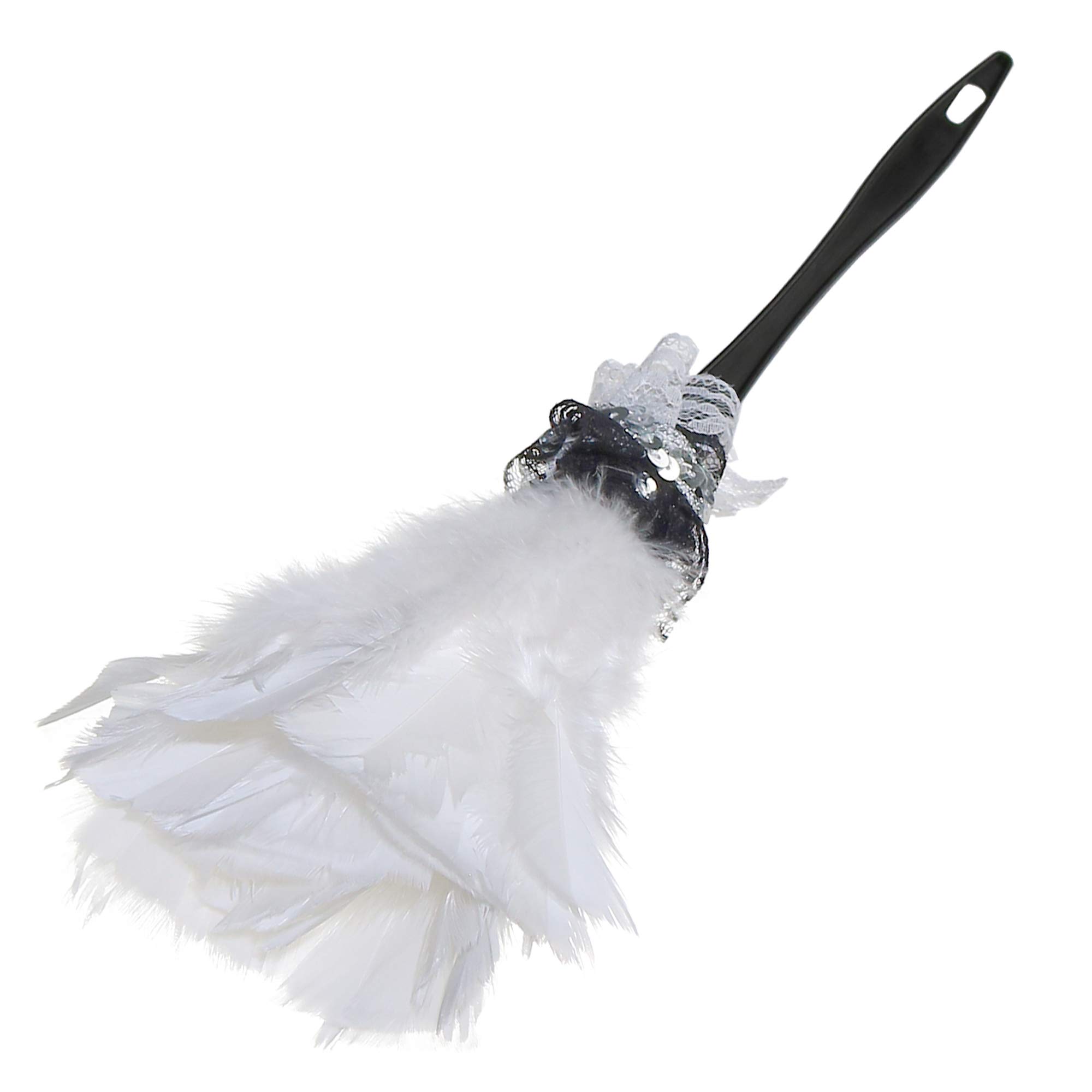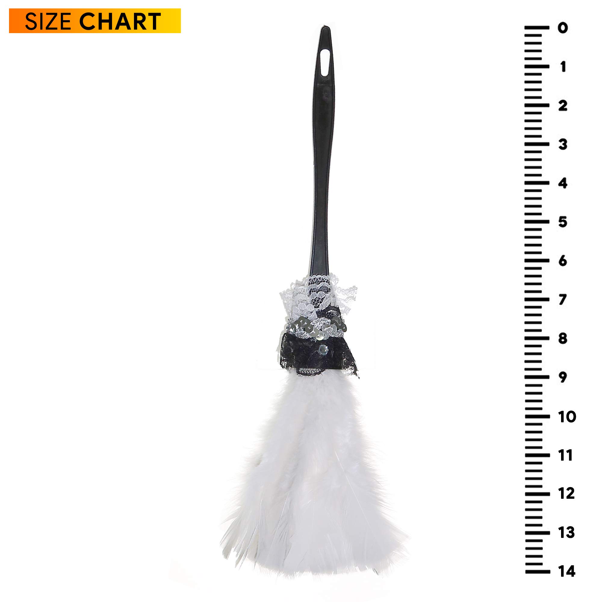 The duster is 14" long, has a 9" black handle, 5" of lush white feathers, and is trimmed with lace.