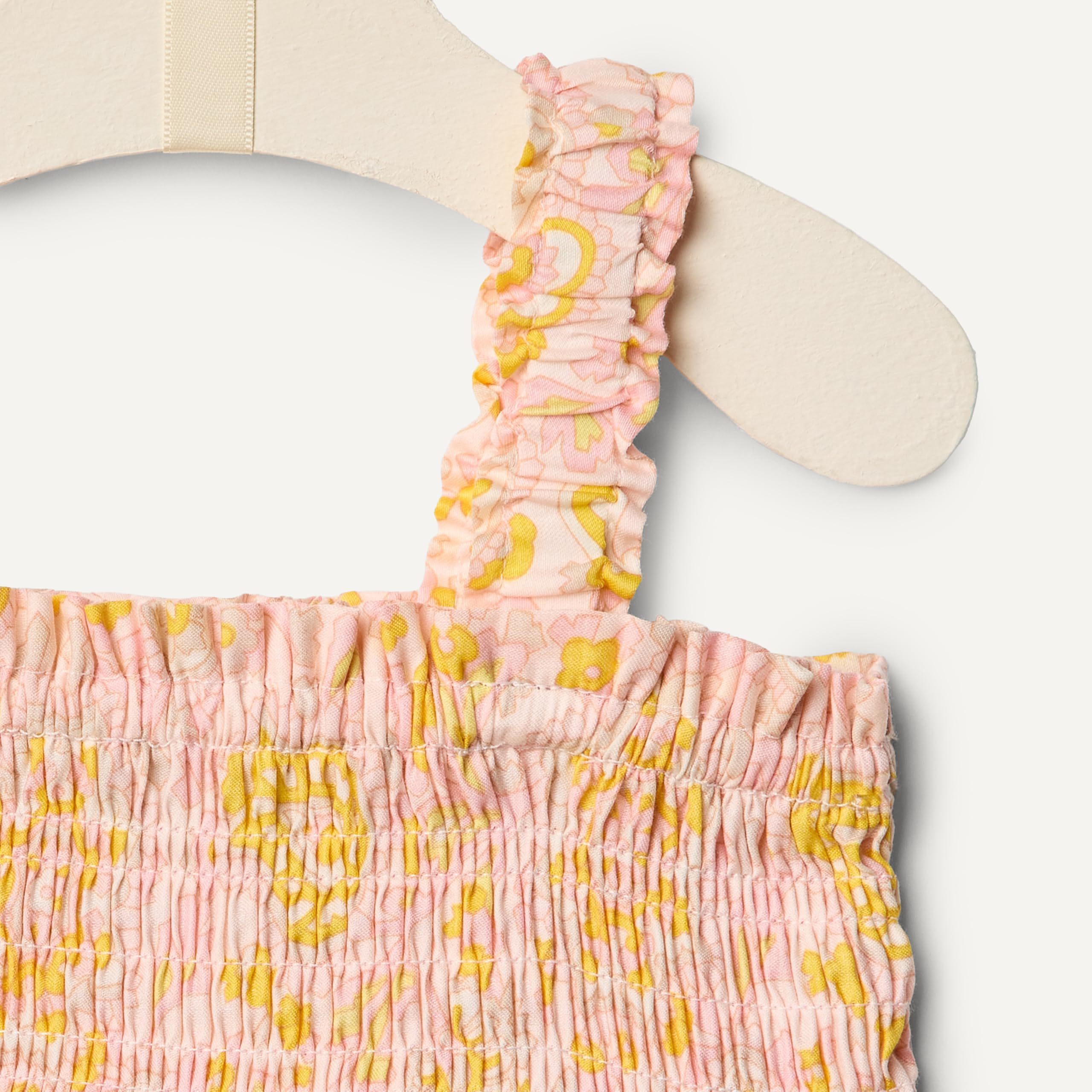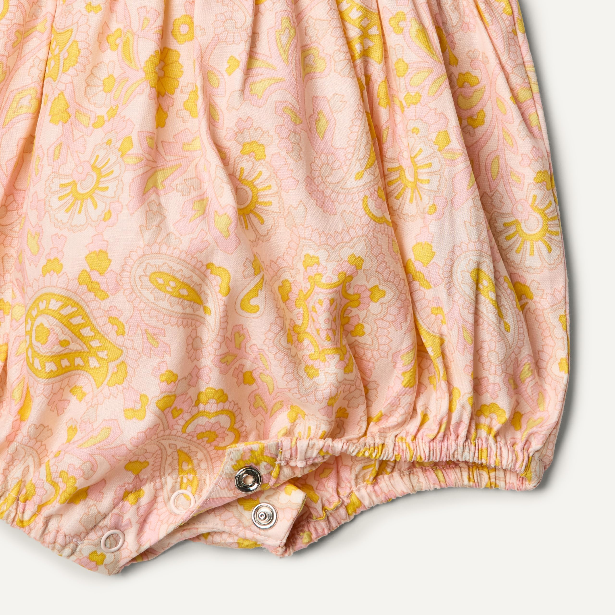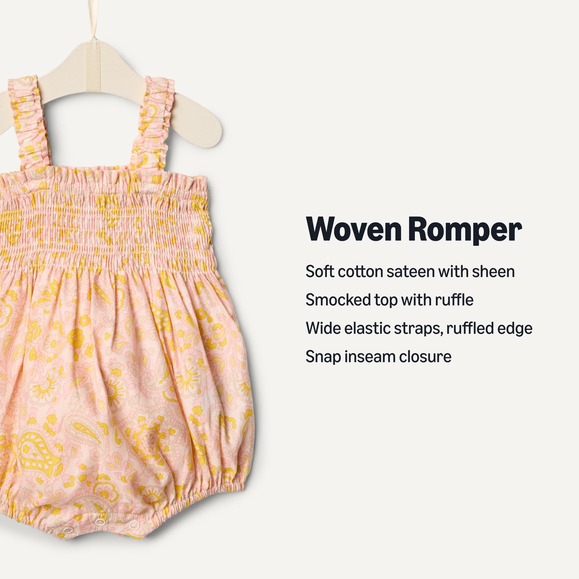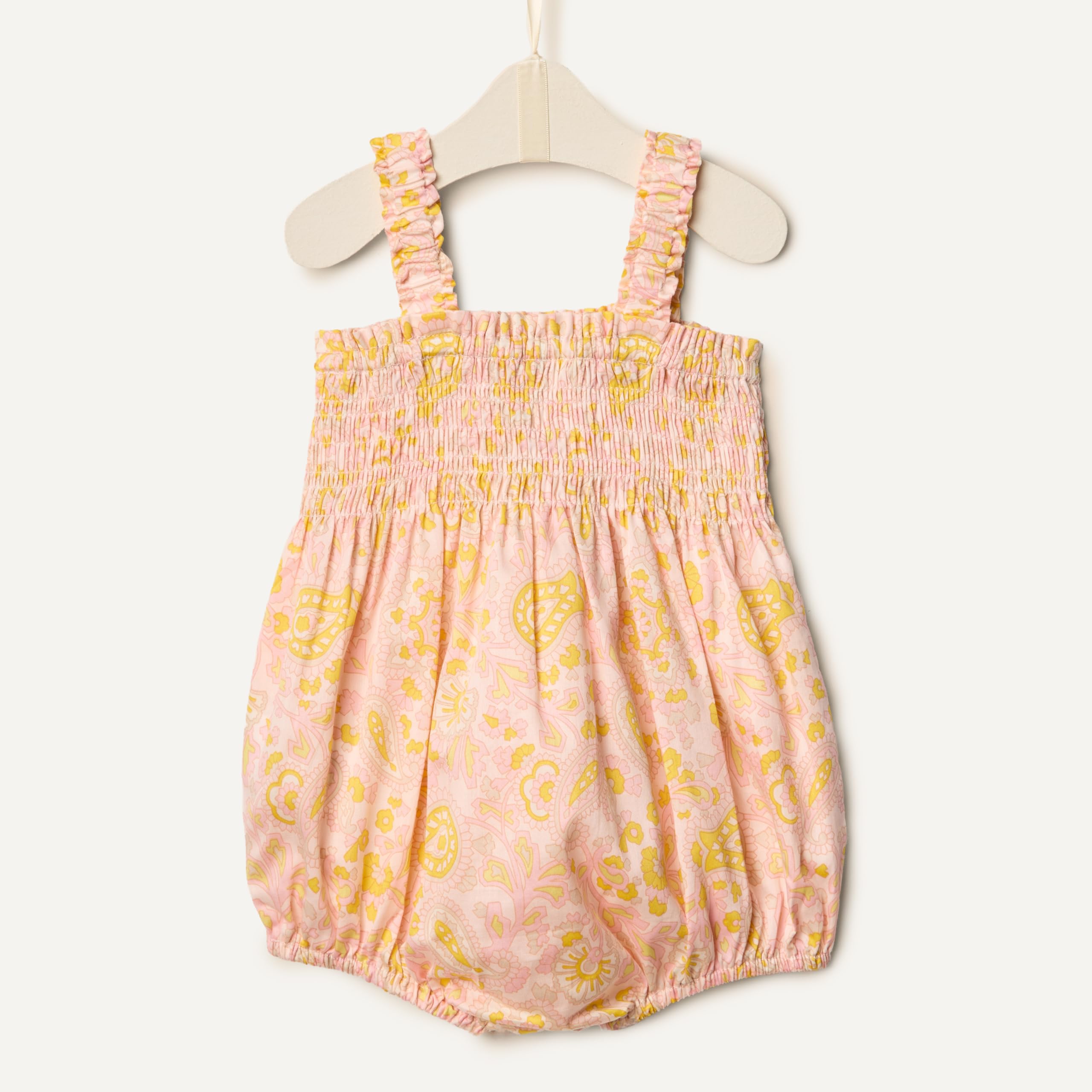 DETAILS: Smocked top with delicate ruffle, wide elastic straps with ruffle-edge detailing, snap inseam for easy on and off, and elasticated leg opening