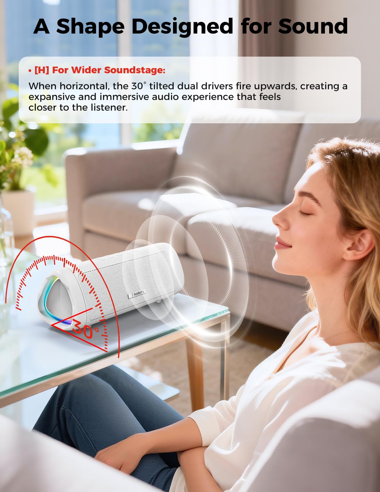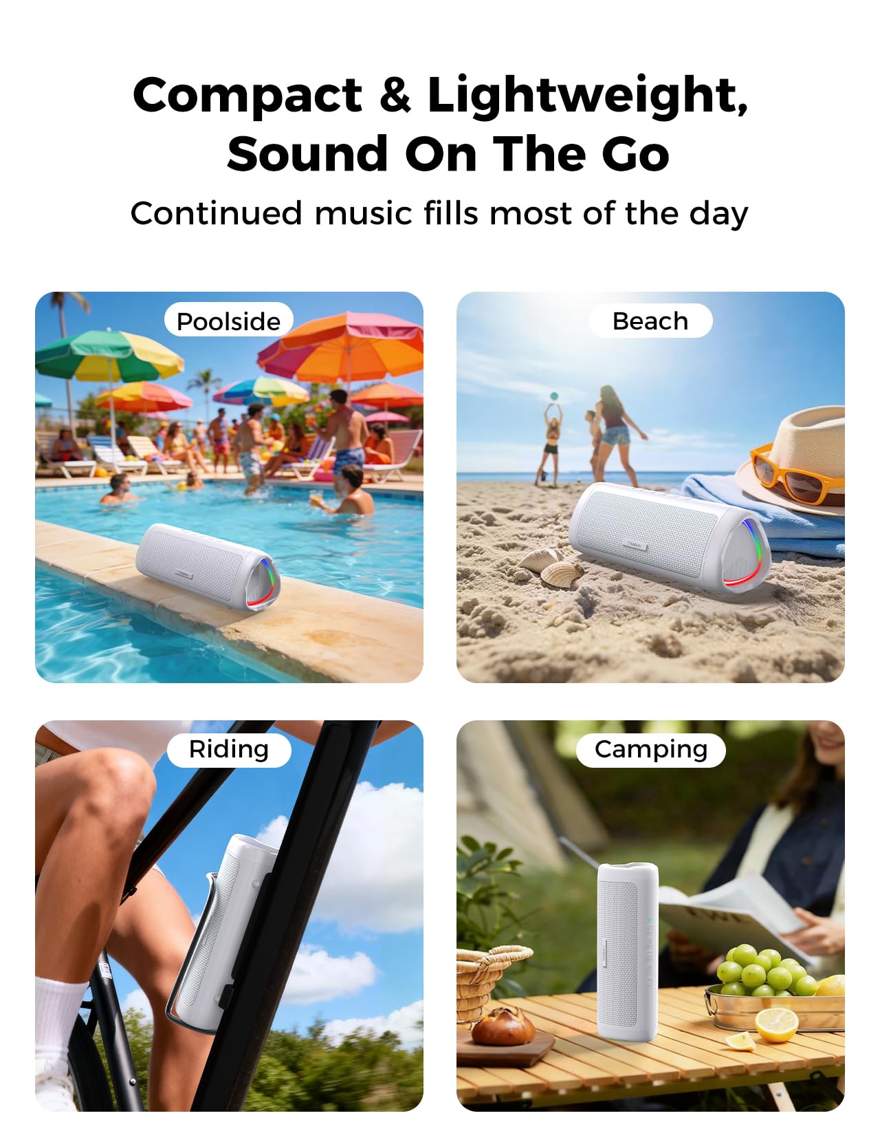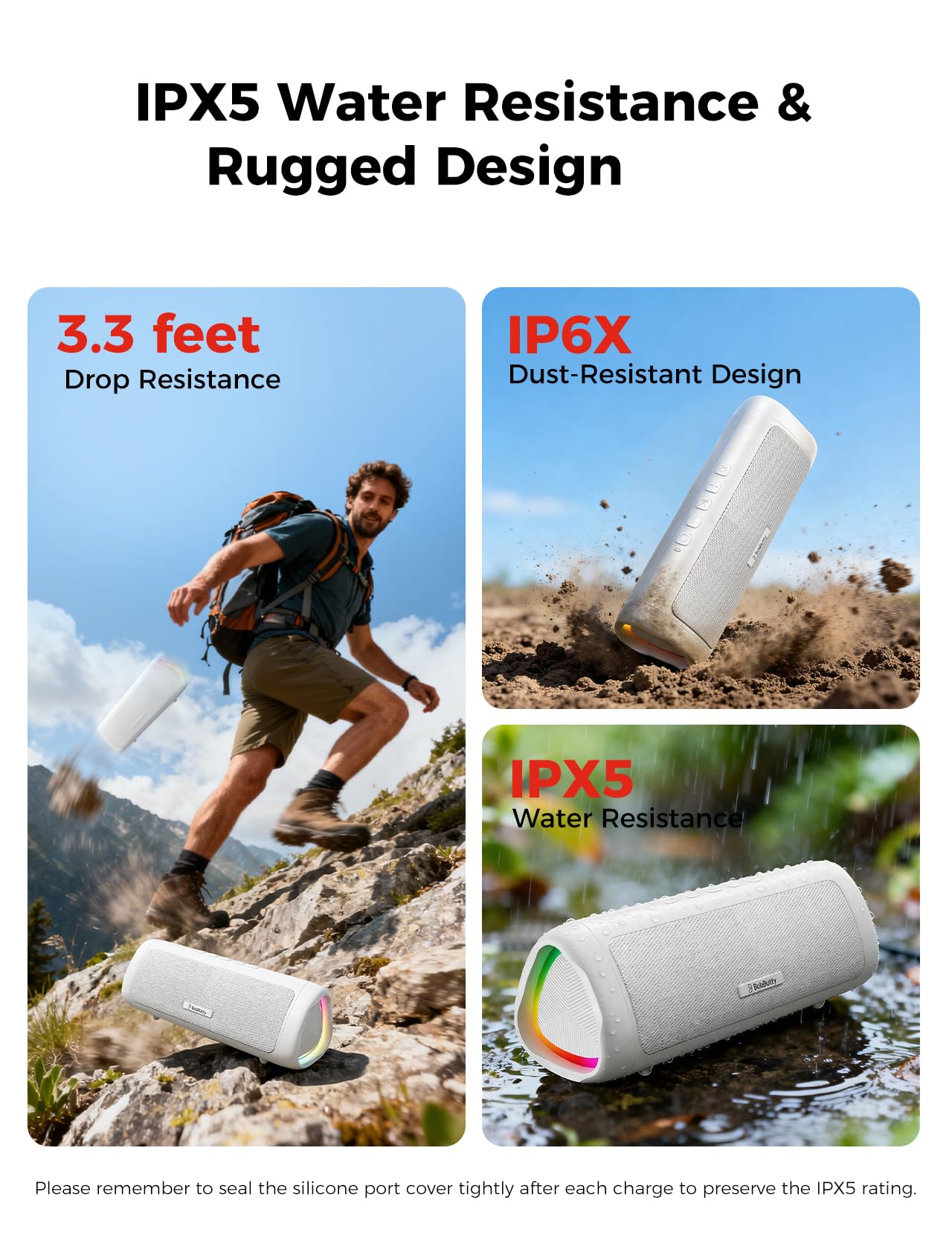 [Tough & Weather-Resistant] Engineered to handle rough use and adverse weather conditions, this speaker features a durable design and an IPX5 rating for protection against water splashes and spills. It's an ideal choice for outdoor events, and is perfect for use at parties, at the pool, on the beach, while camping or hiking, and more