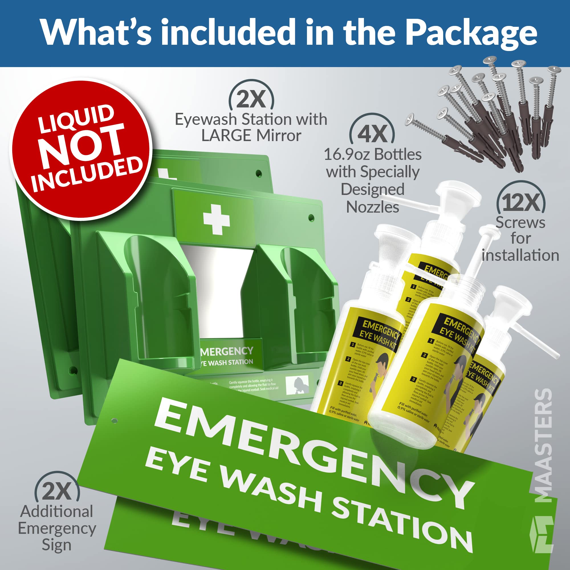 COMPLETE SET: With this eye washing station, you get everything (no sterile saline) that a workplace needs. Our eye wash units feature the main station w/mirror, two empty bottles for saline or any eye wash solution, a large green emergency sign, and six screws for wall mounting the entire unit.