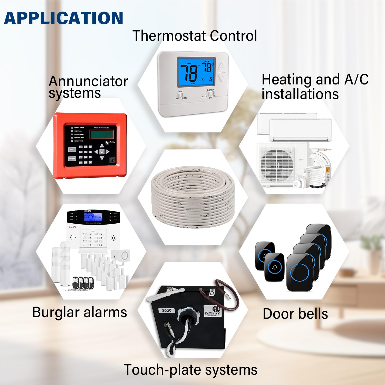 [Applications] - Our thermostat wire is used for thermostat control, heating and A/C installations, annunciator systems, doorbells ,ouch-plate systems, door bells, remote controls, signal systems and other low-voltage applications.