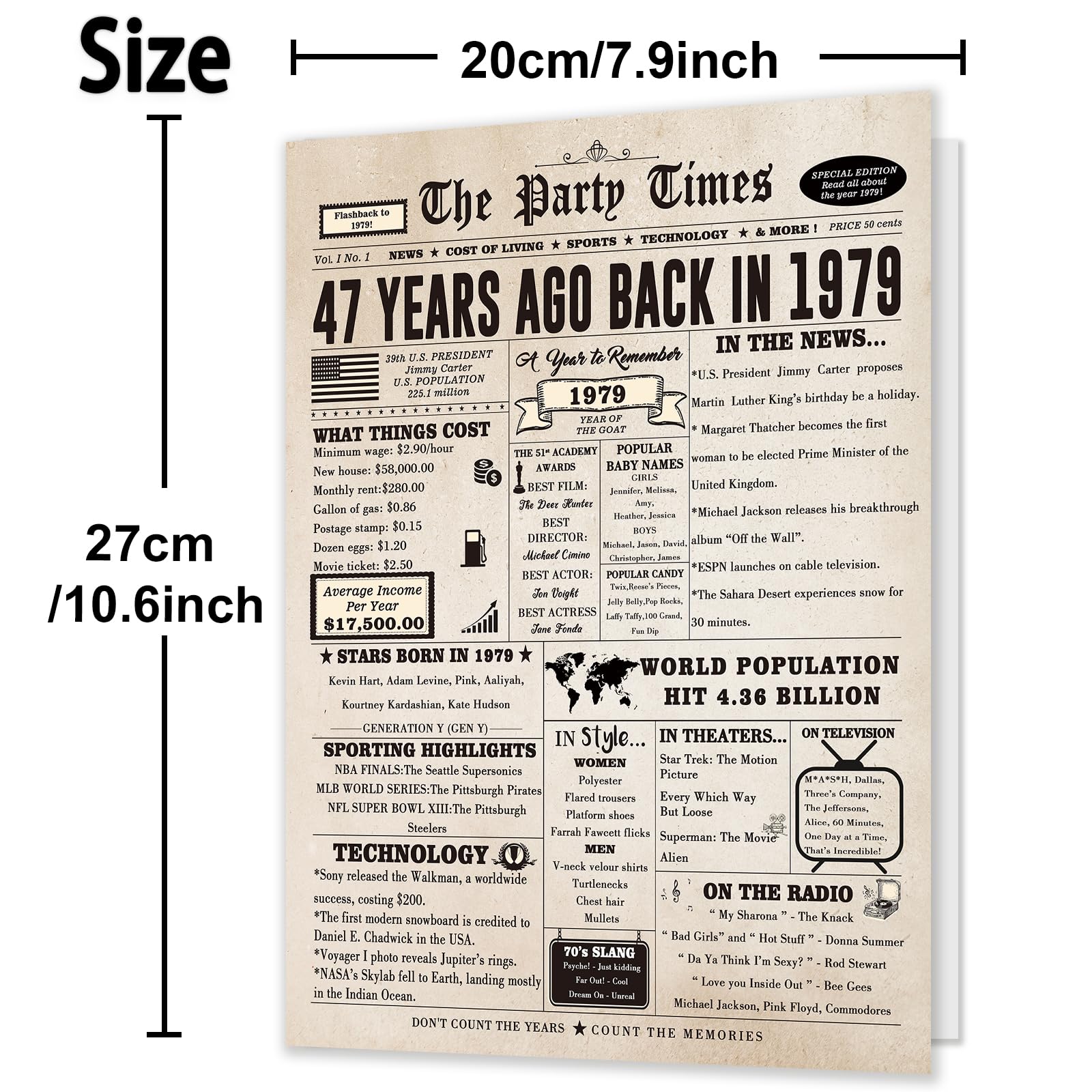 It's more than just a card; it's a cherished keepsake and a testament to the joy of celebrating life's milestones! When it comes to celebrating a remarkable 47 years of life, 47th birthday card is the ultimate tribute to a journey well-lived. Whether you're celebrating your best friend, parents, siblings, or spouse, this card is the perfect gift that encapsulates a lifetime of memories. Perfect option to recognize a milestone birthday. Size is large enough to easily read all the interesting fun facts. Plenty of room inside to personalize, well wishes/messages. Great option when you want a little more than a typical birthday card. Funny card with lots of good facts about the year you choose eg: median house prices, incomes, gasoline, historical events, movies, ect many of the events depicted on the card. The size was great to pass around for all to read, and made it handy to insert my own text.