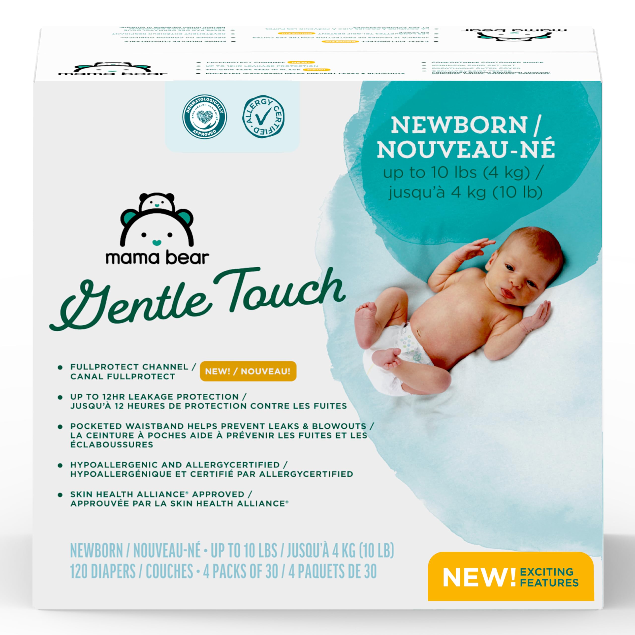 IN THE BOX: Mama Bear Gentle Touch diapers for babies; size NB; (4 packs of 30 diapers each, 120 total)