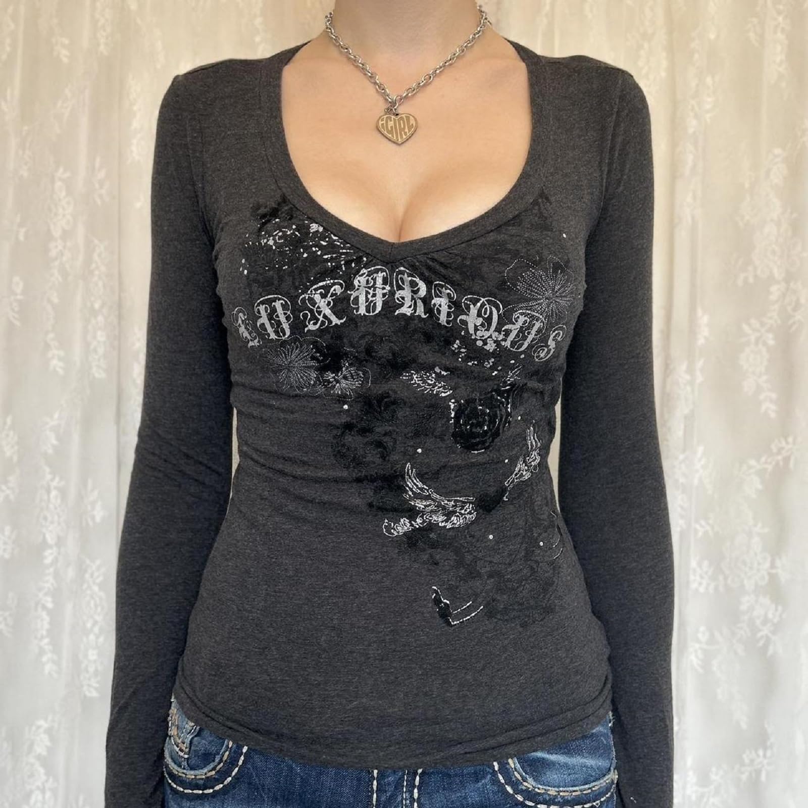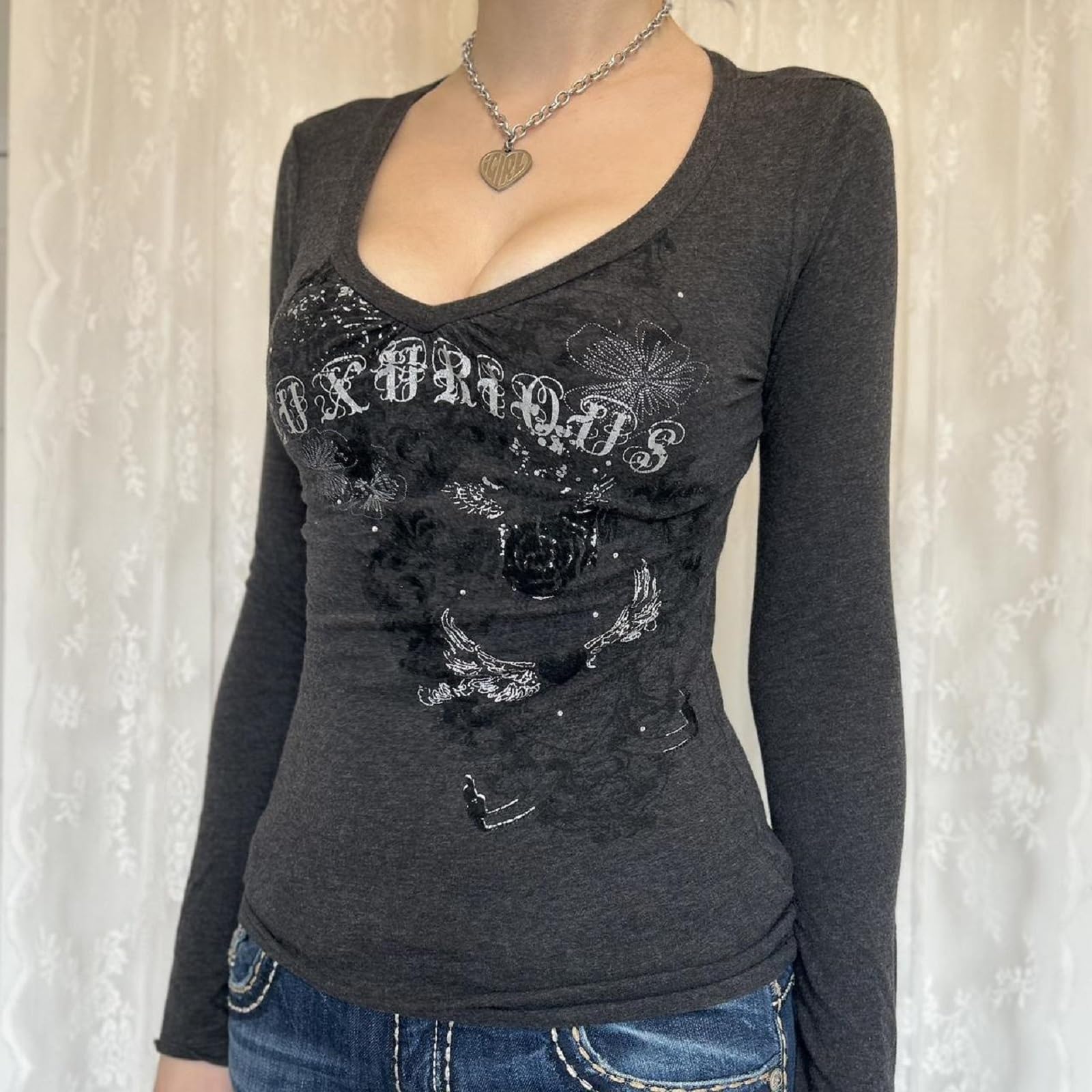 Style: Women vintage graphic print long sleeve crop top v neck tshirts fairycore grunge tees tops 90s e girl streetwear, y2k grunge fairy clothes, grunge shirt, 90s grunge aesthetic clothing, y2k shirt grunge, grunge clothing, shirts for teens girls aesthetic, tight long sleeve shirts for women, e girl clothing aesthetic, gothic punk y2k tops, cyber y2k fashion, cowgirl shirt y2k, 2022 trendy clothes for teen girls y2k, very chic and gorgeous.