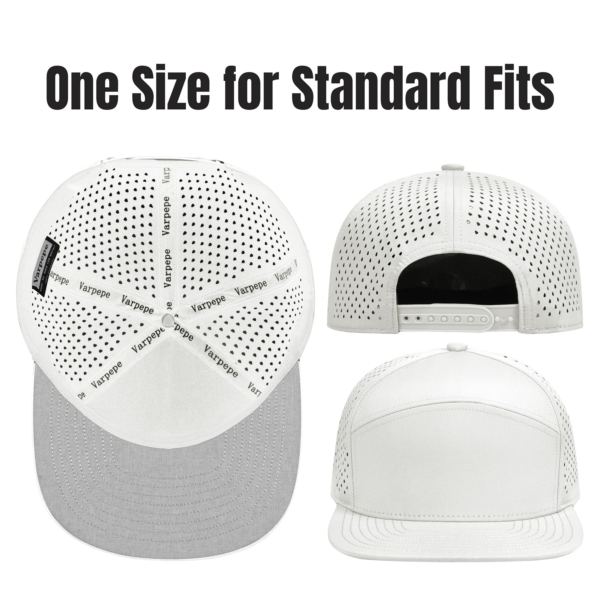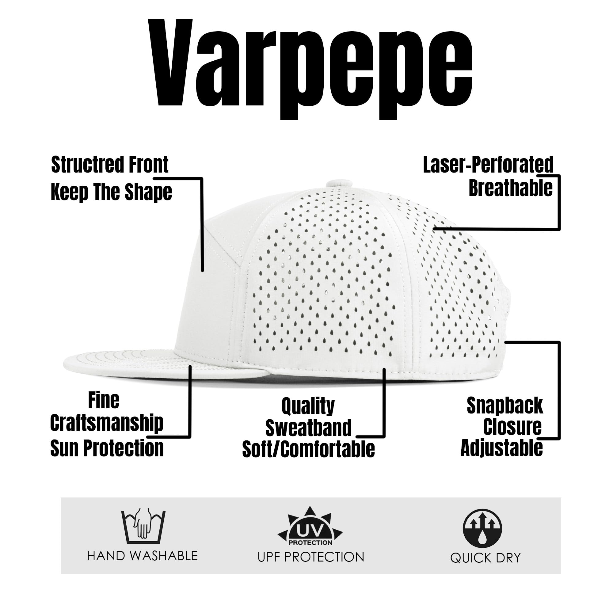 Varpepe Hat Design: Stylish and functional,structured front panels that maintains shape, 6-panel, flat brim, laser-perforated side & rear panels for breathability, and soft touch adjustable snapback closure