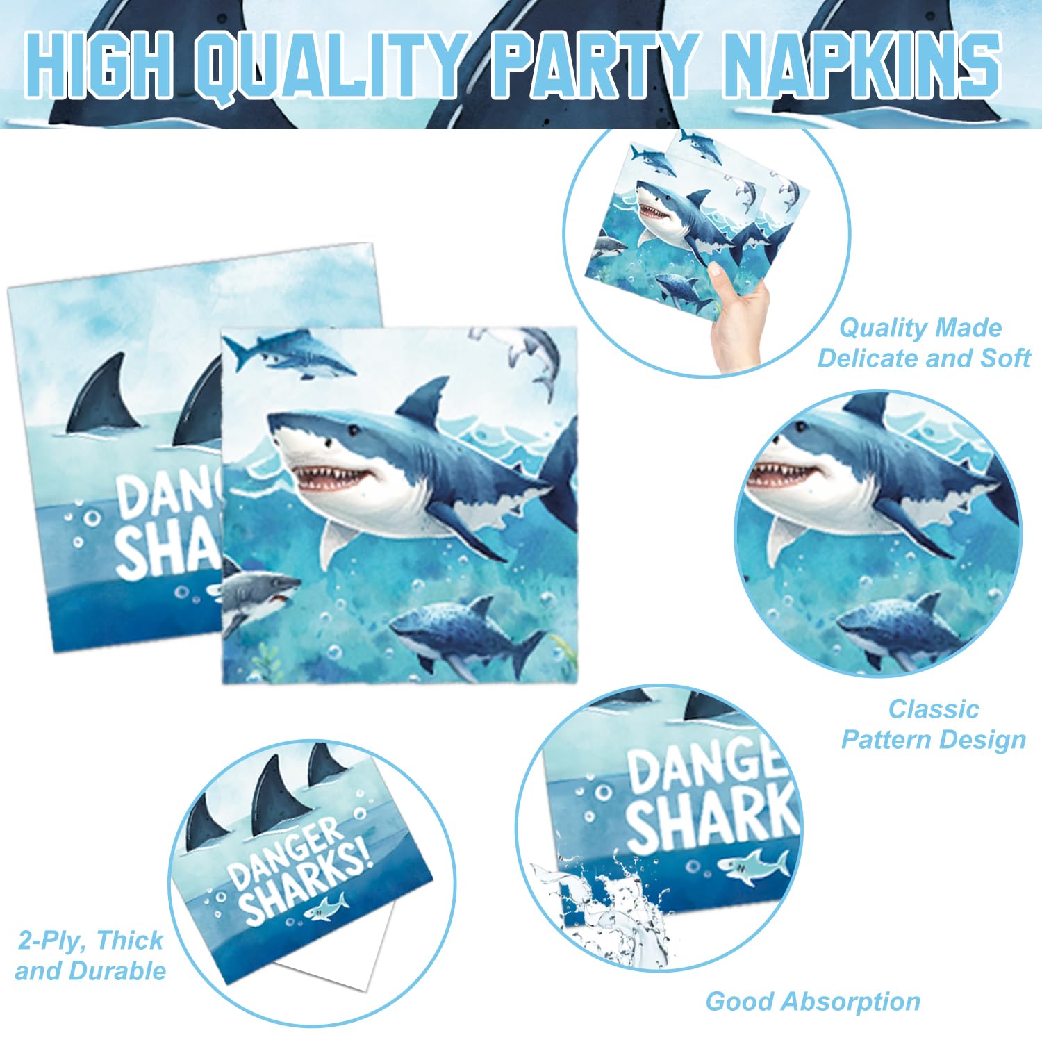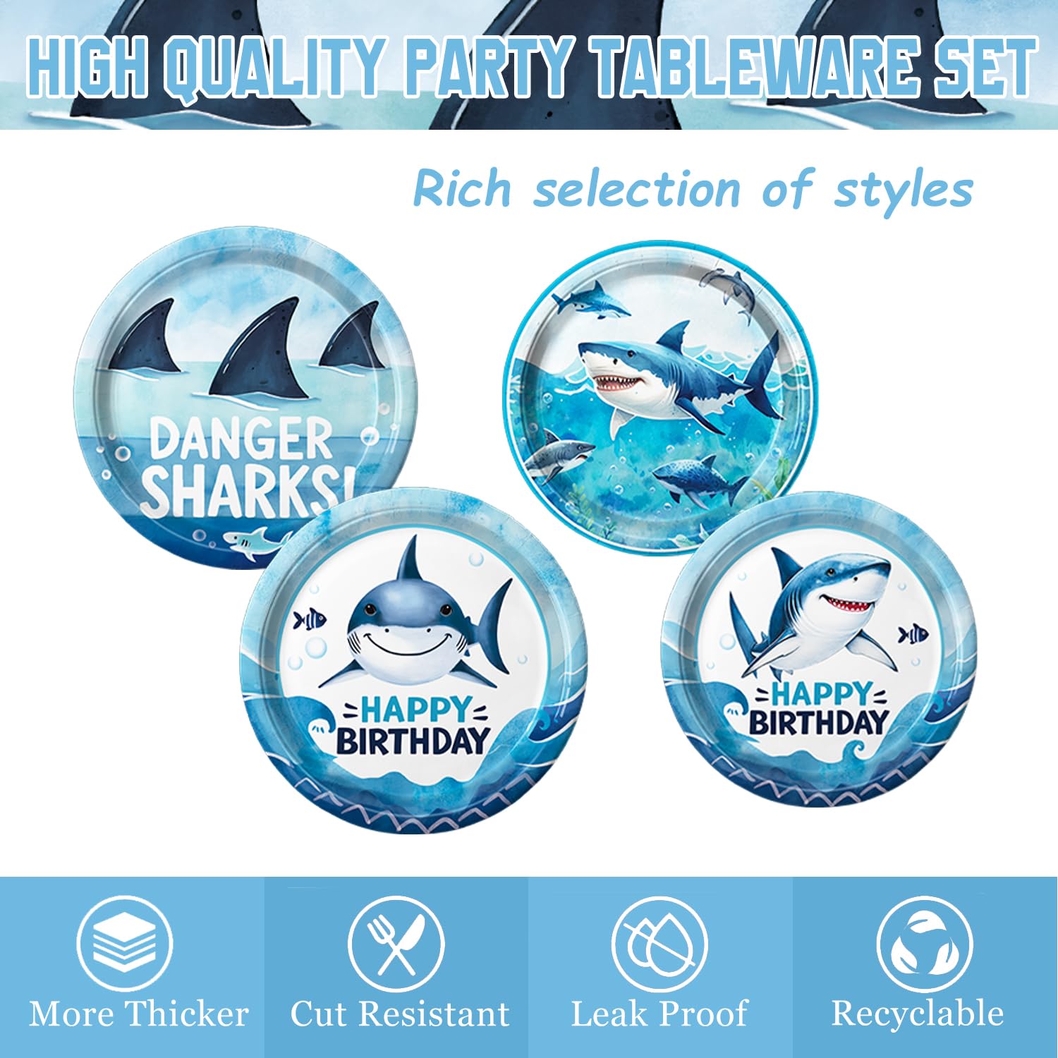 Shark-Themed Design: The shark plates and napkins feature the phrases "Happy Birthday" and "Danger Sharks!" along with illustrations of cartoon sharks and shark fins. The overall design showcases a blue, shark-themed style, creating an immersive underwater party atmosphere