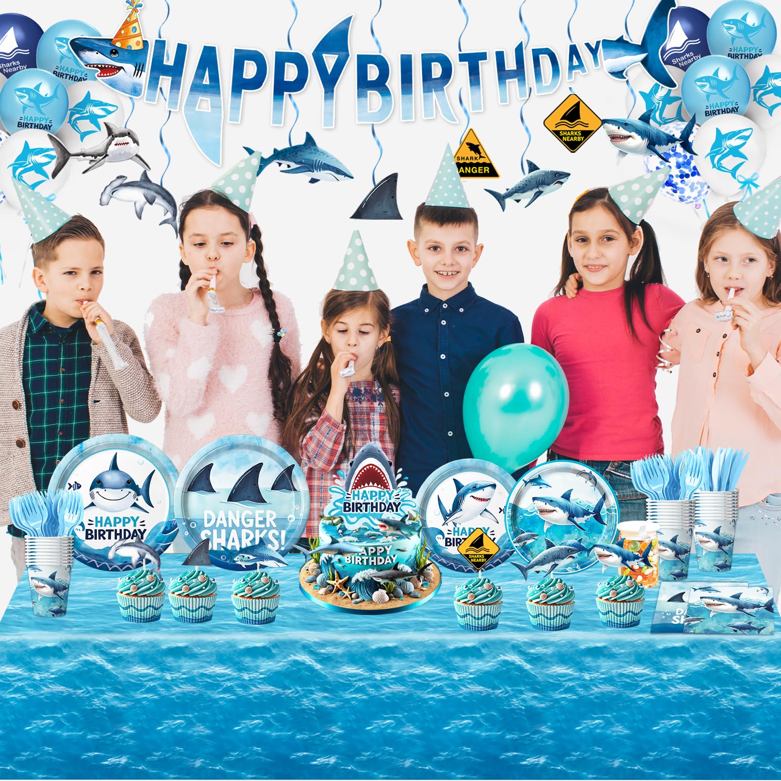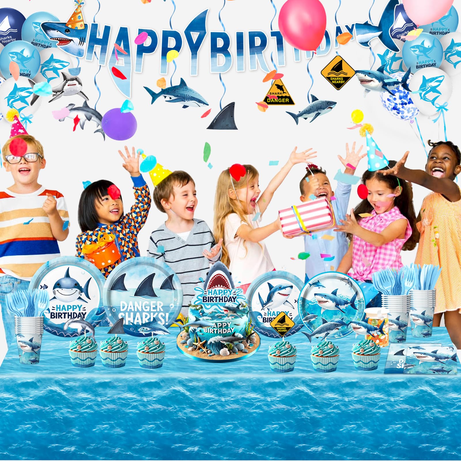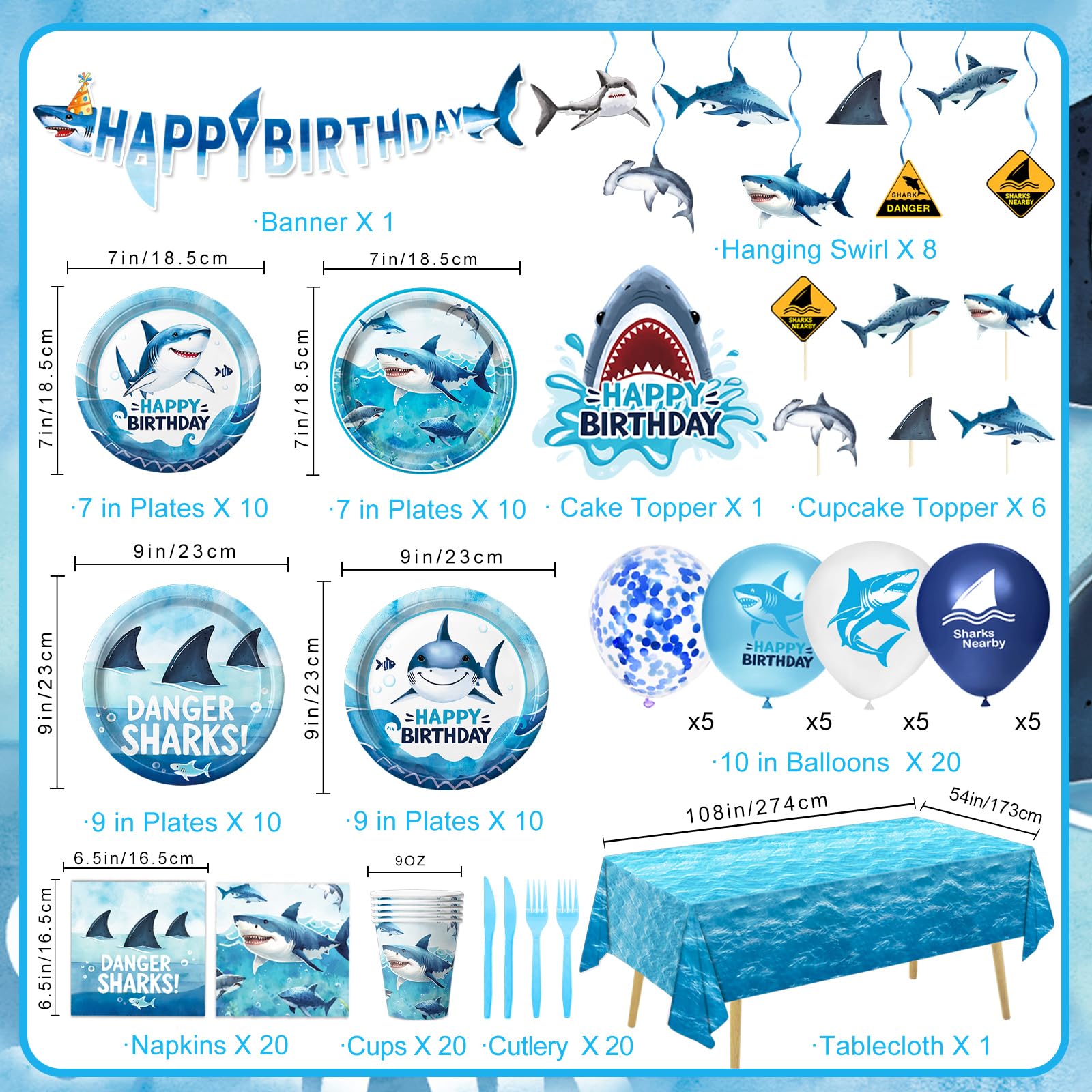 Shark Birthday Party Decorations Kit: Includes 20 dinner paper plates (9 inches, 2 designs), 20 dessert paper plates (7 inches, 2 designs), 20 napkins (2 designs), 20 paper cups, 20 knives, 20 forks, 8 hanging swirls, 1 cake topper, 6 cupcake toppers, 1 tablecloth (54 x 108 inches), 1 banner, and 20 balloons (10 inches, 4 styles)